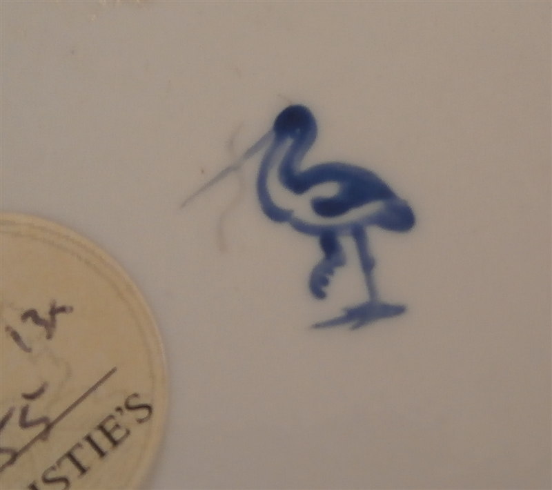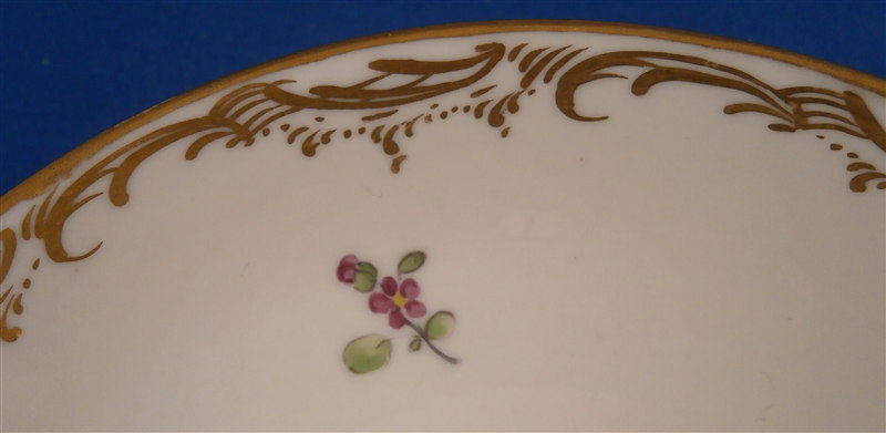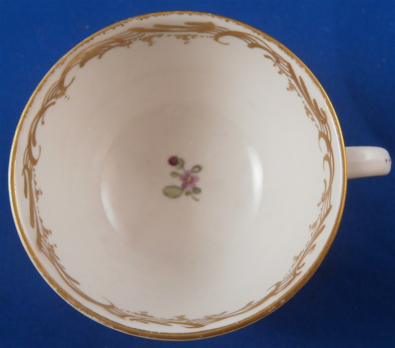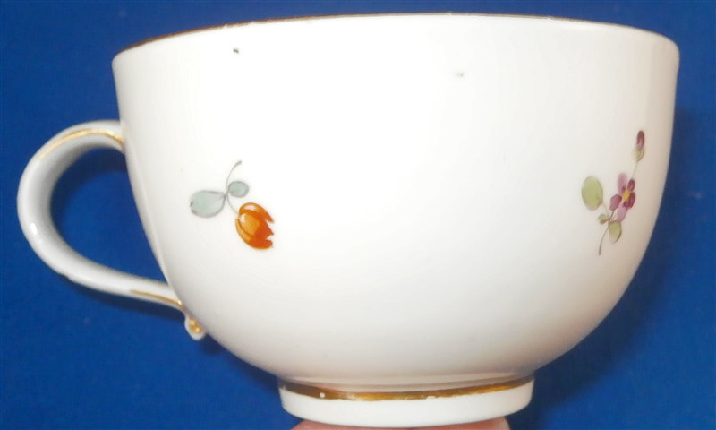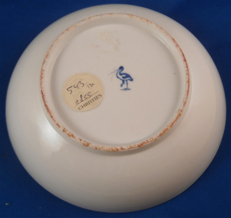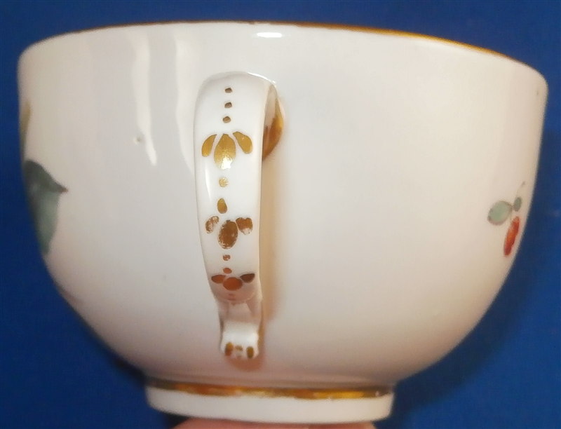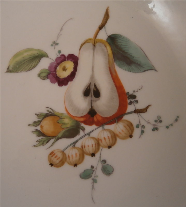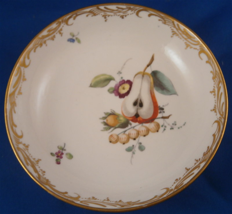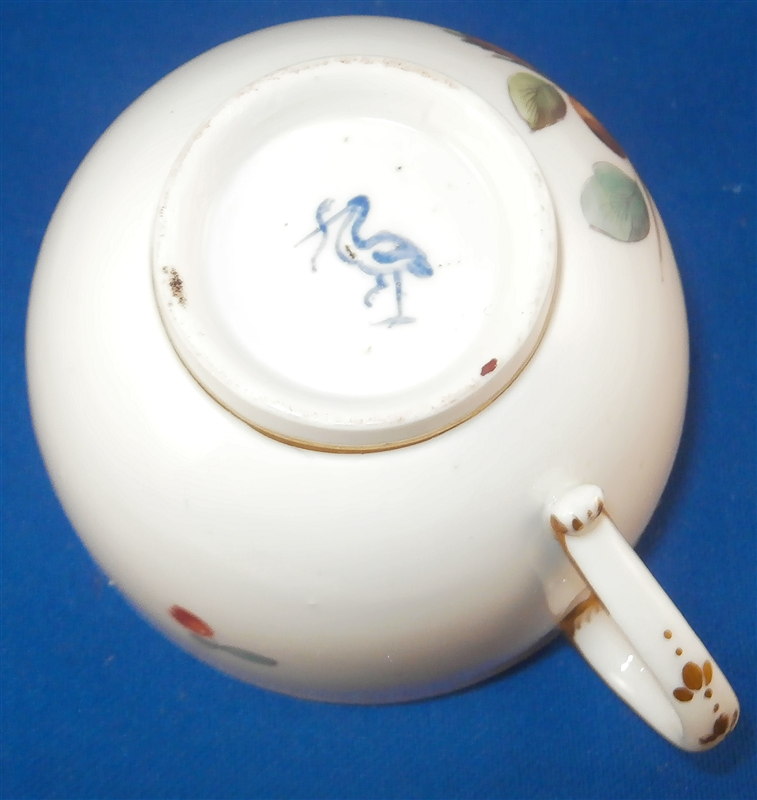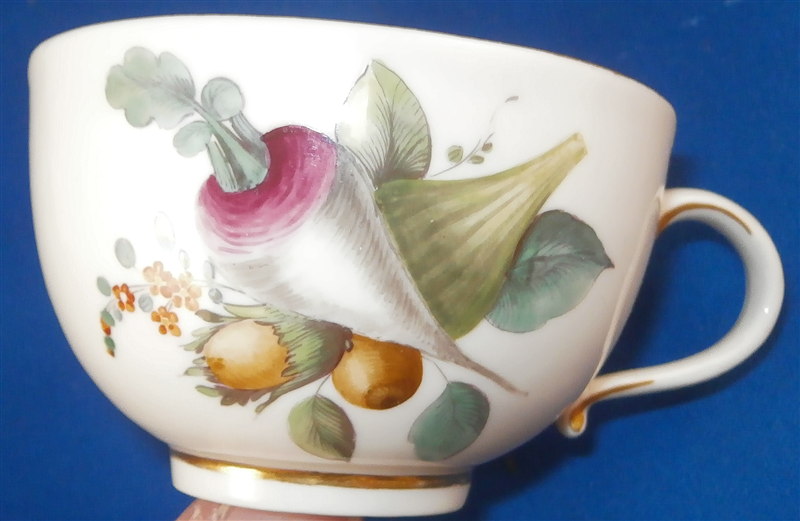 This is a cup and saucer made by Haag around 1780. Both pieces are handpainted with a superb scene including vegetables and fruit as well as berries, nuts and flowers. Nice gold trim to the edges. The set is in perfect condition. Both pieces are marked with the above glaze blue stork mark as shown. The cup is 1.75 inches tall and 2.75 inches in diameter. The saucer is 1.25 inches tall and 4.75 inches in diameter. Please email me for more information or other pictures.