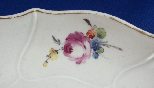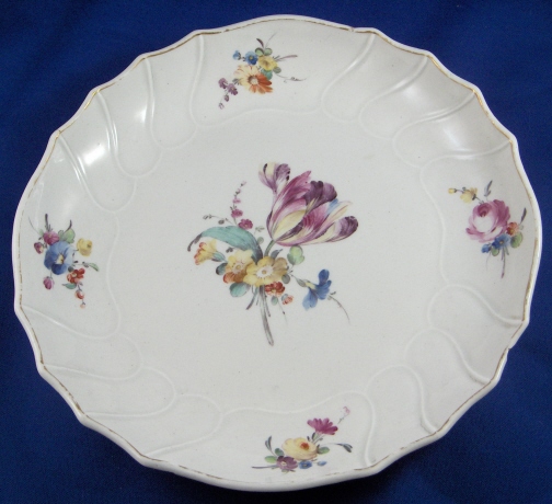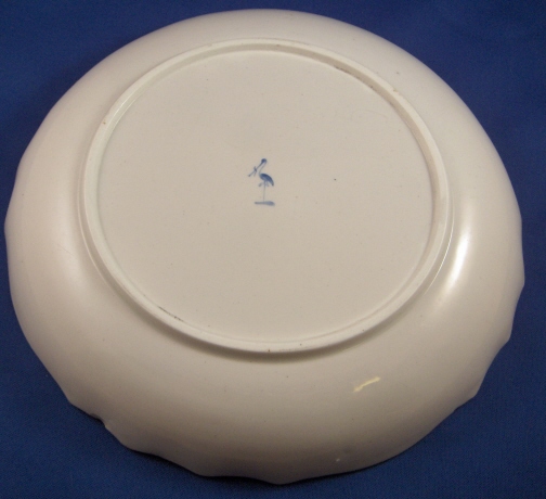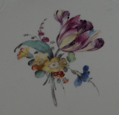 This is plate was made by The Hague around 1780 which matches my other plate. It is handpainted with nice flowers (main flower being a tulip) and a gold trim. It is in good condition with the gold trim having wear and small chip mostly to the back. The blank porcelain plate in this case is certainly from Tournai as it is softpaste. The plate is marked with the above glaze blue stork mark and an incised number 5. The plate is 1.25 inches tall and 8.75 inches in diameter. Please email me for more information or other pictures.