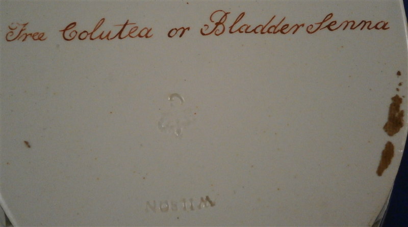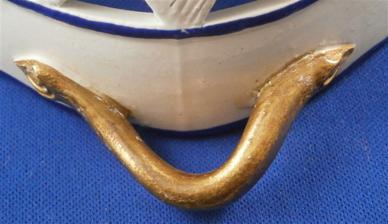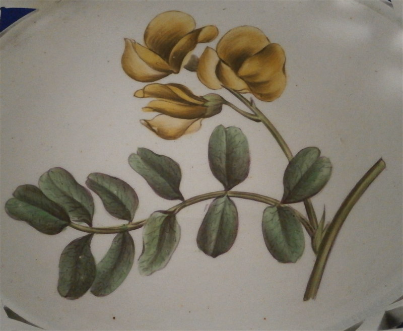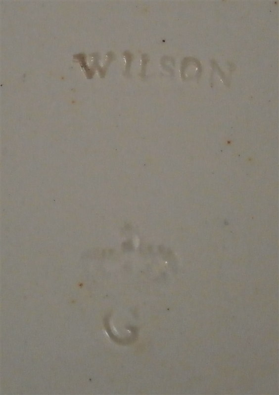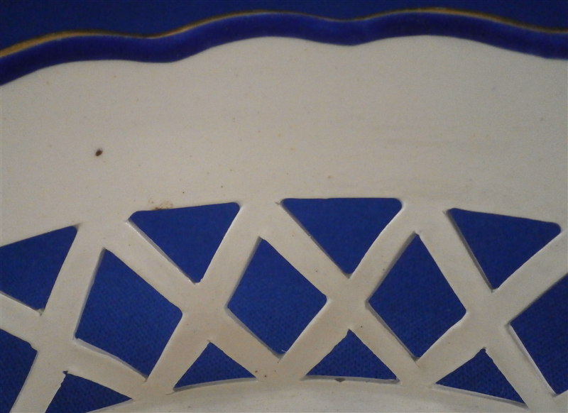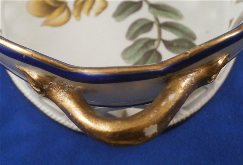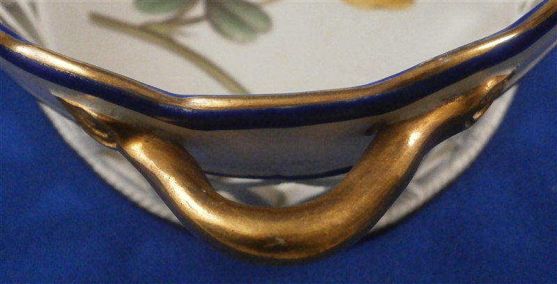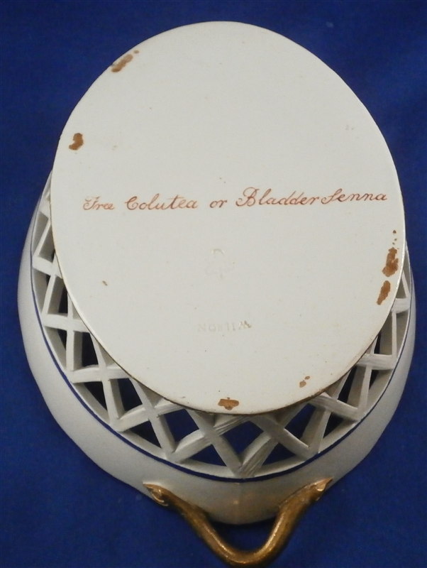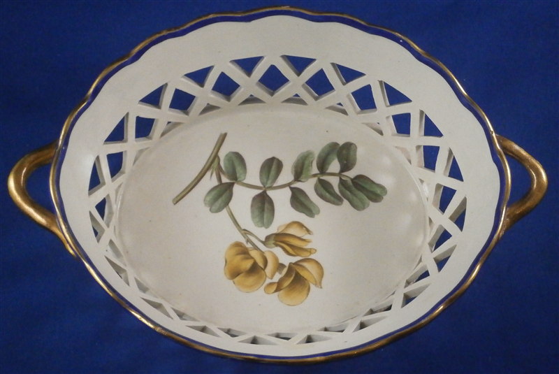 This is a great cream ware reticulated basket made by David Wilson & Sons , Hanley , Staffordshire , in the vey early 19th century. The basket is hand painted with a nice flower on the bottom inside, a some blue and gold trim to the side, some nice detail added to the outside reticulated areas and two branch handles painted in gold. A very nice piece by a hard to find maker. The basket is in great condition with one handle having some flaking to the gilding - not sure why - the piece seems to be original and the gilding matches but maybe there was some work done to it!? I am honestly unsure in this case. There are three white spots in the blue trim where the color was missed / flaked. Either way the piece displays perfectly and is a superb example! The basket is marked underneath with the impressed WILSON mark as shown as well as a G under a crown - not sure of the significance of that and the name of the flower in red - Free Colutea or Bladder Senna .The piece is 2.25 inches tall, 7.625 inches wide and 5.25 inches deep! Please email me for more information or other pictures.