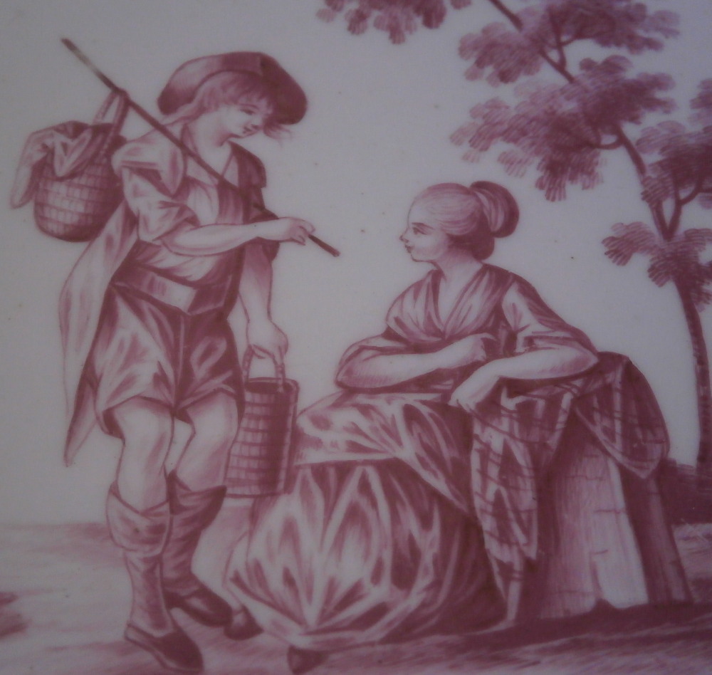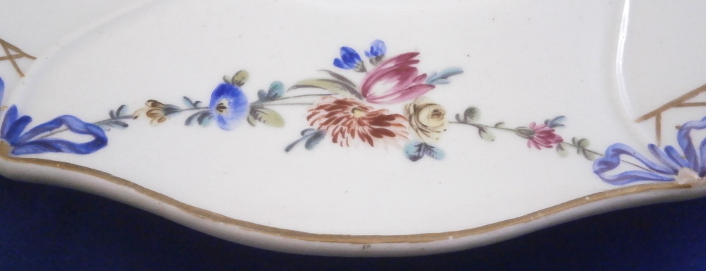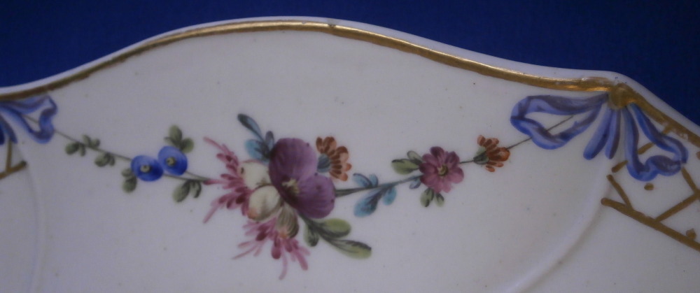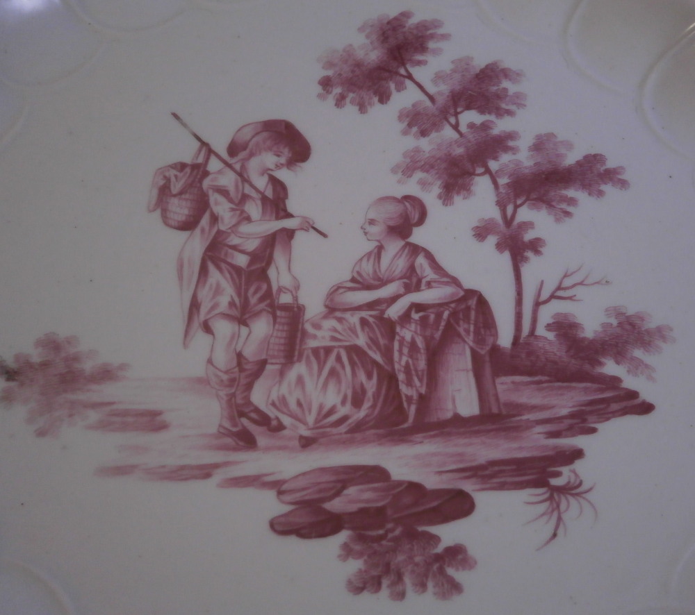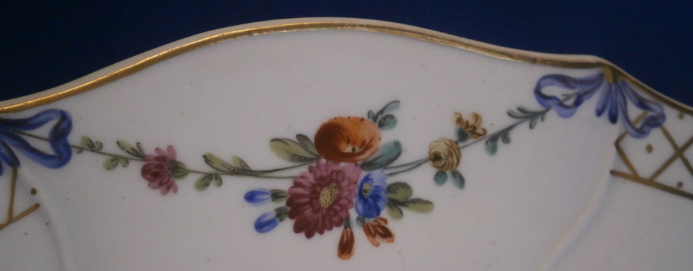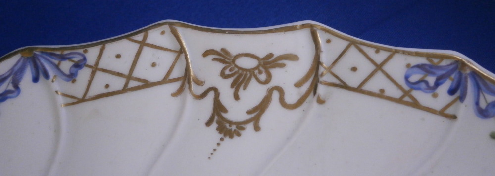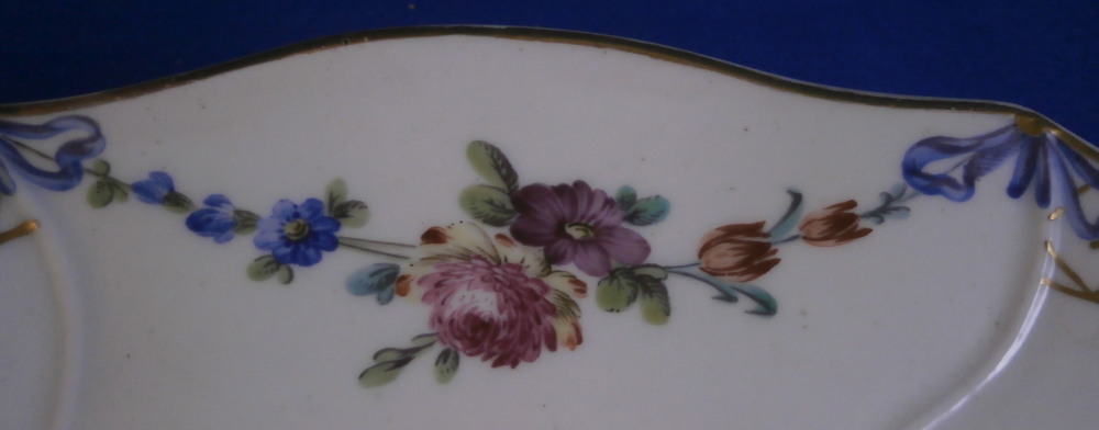 This is a truly superb plate was made by The Hague / Haag around 1783. The rim is hand painted with floral garlands hanging from blue bows with gold designs in between, There is a bit of a relief design to the paste going from the gold designs into the well edge. What makes this a very special plate besides it being a rare scenic piece is that the scene was hand painted by the famous Fidelle Duvivier! The scene is in puce and of amazing quality. There is a gentleman holding a stick with a basket on it in one hand and another basket in the other hand standing by a lady sitting down all in a nice landscape surrounding with a large tree in the back. The plate is also larger than all the others I have owned being 11.125 inches in daimeter and 1.5 inches tall. The blank porcelain seems to have been made at Tournai since it is soft paste and has a greenish translucency to it with some incised marks to the back. The plate is in amazing condition - as nice as they come! The plate appears to have been marked with the usual stork and eel mark that Hague used but someone scratches the mark away. Maybe to make it appear to have been done by Tournai? A very rare and spectacular example! Please email me for more information or other pictures.
