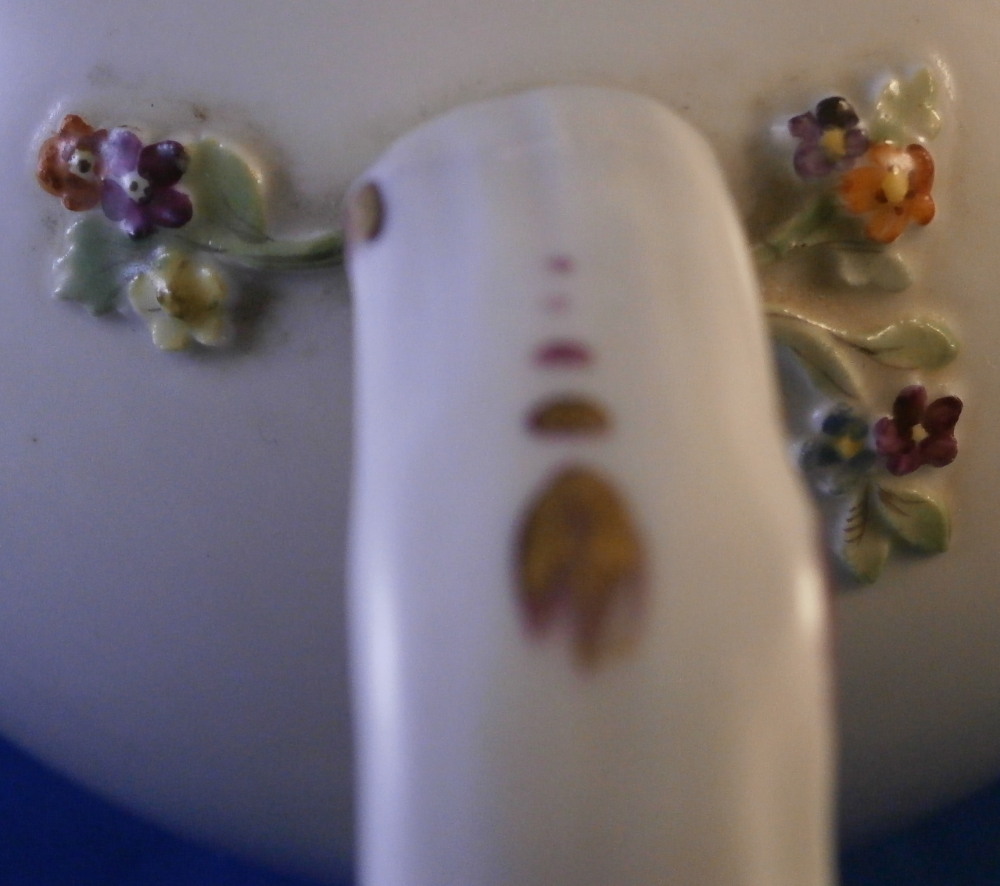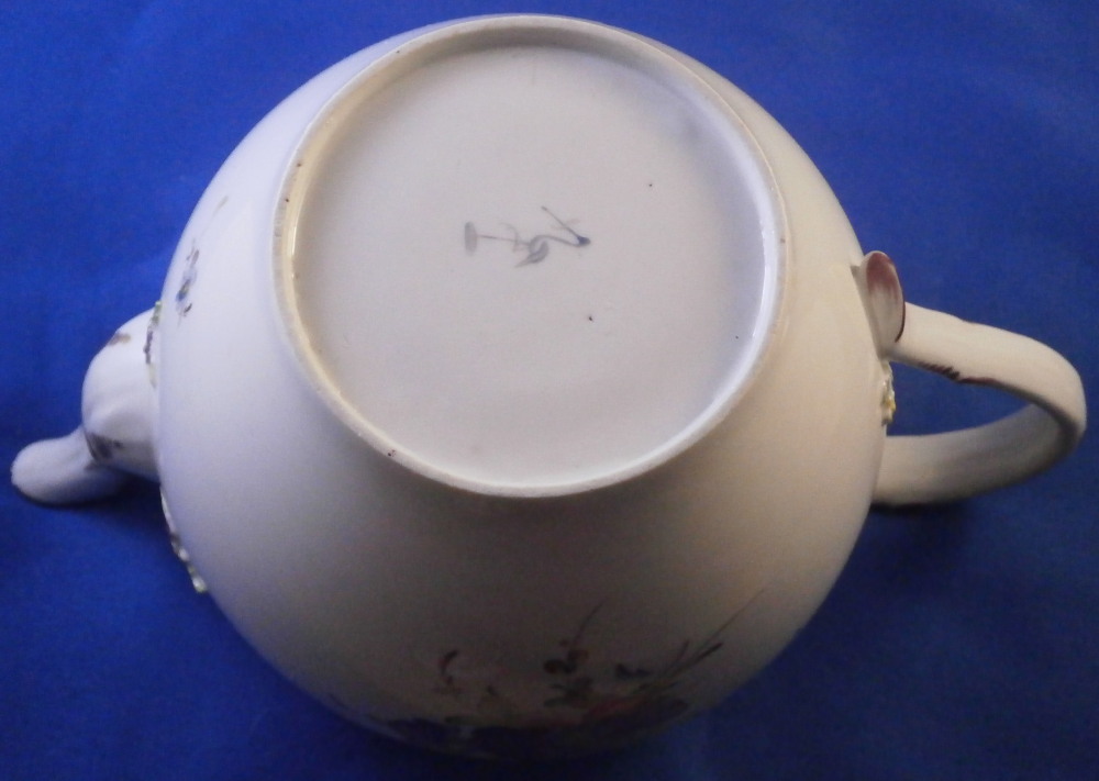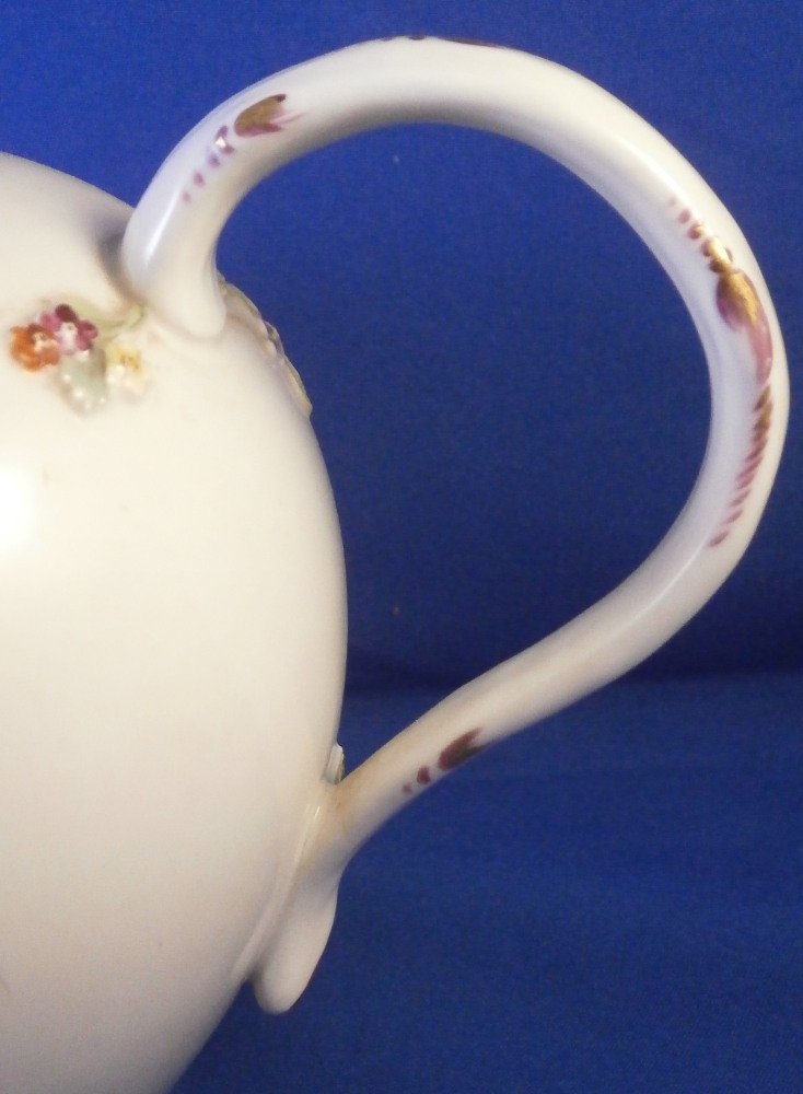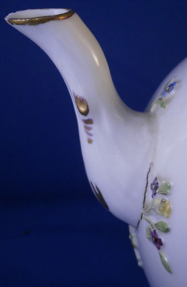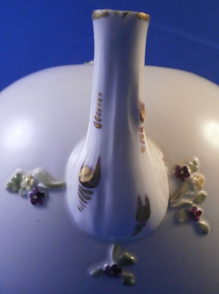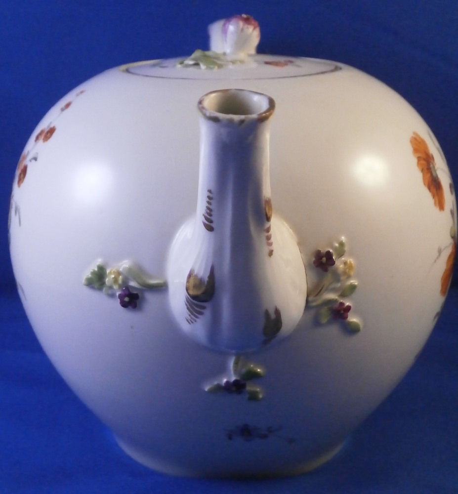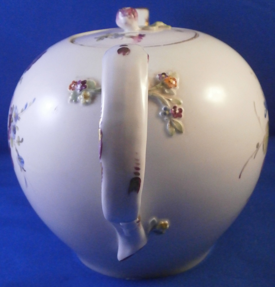 This is a tea pot made at the Hague / Haag from the Netherlands in the 18th century. The pot is hand painted with a nice polychrome floral arrangement to either side, a single small flower below the spout, puce and gold trim to the handle, gold trim to the spout, a tiny floral arrangement to the lid as well as two even smaller single flowers and a nicely done floral finial including it's bud, stem and a leaf. Gold trim to the edge of the lid. My favorite part is the applied 3D flowers to all four directions of the spout and the terminals of the handle. I ahve not seen that before and really like it. They are also hand painted nicely. All in all a superb example and its nice to ahve a piece that is not a cup and saucer or plate. The pot is in good condition with a touch of gold wear around the lid edge which is to be expected amd some minor chipping to the end of the spout. There is an old firing crack where the spout attached to the main body from when it was made. Some nibbling to the floral finial and one spot of flaking of the blue paint in one of the flowers. It is displays perfectly and looks amazing. The piece is marked with the over glaze blue stork mark carrying the eel and an impressed letter L. I assume it is an Ansbach made blank that they decorated. The pot is 4.5 inches tall, 8 inches from handle to spout and 4.75 inches in diameter. Please email me for more information or other pictures.