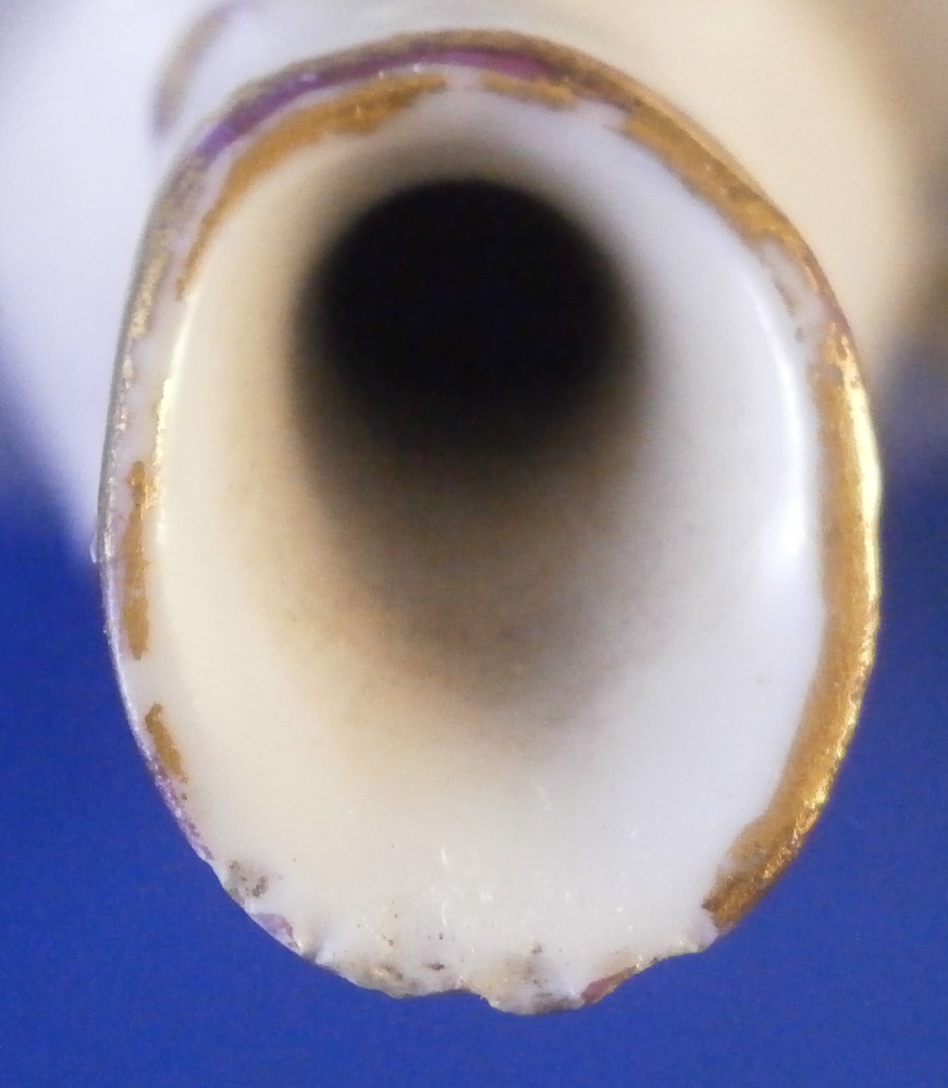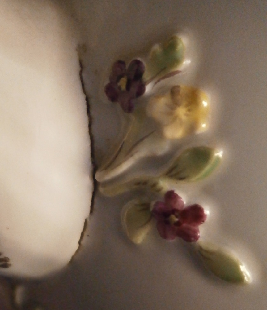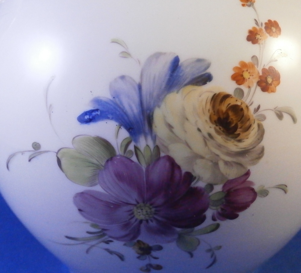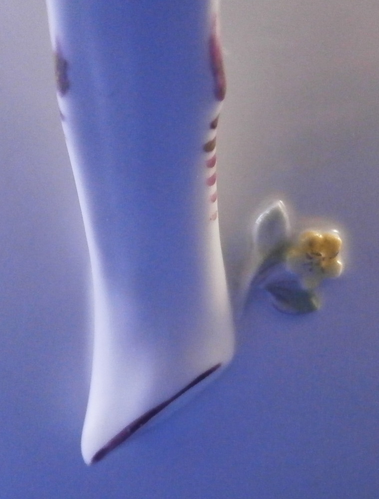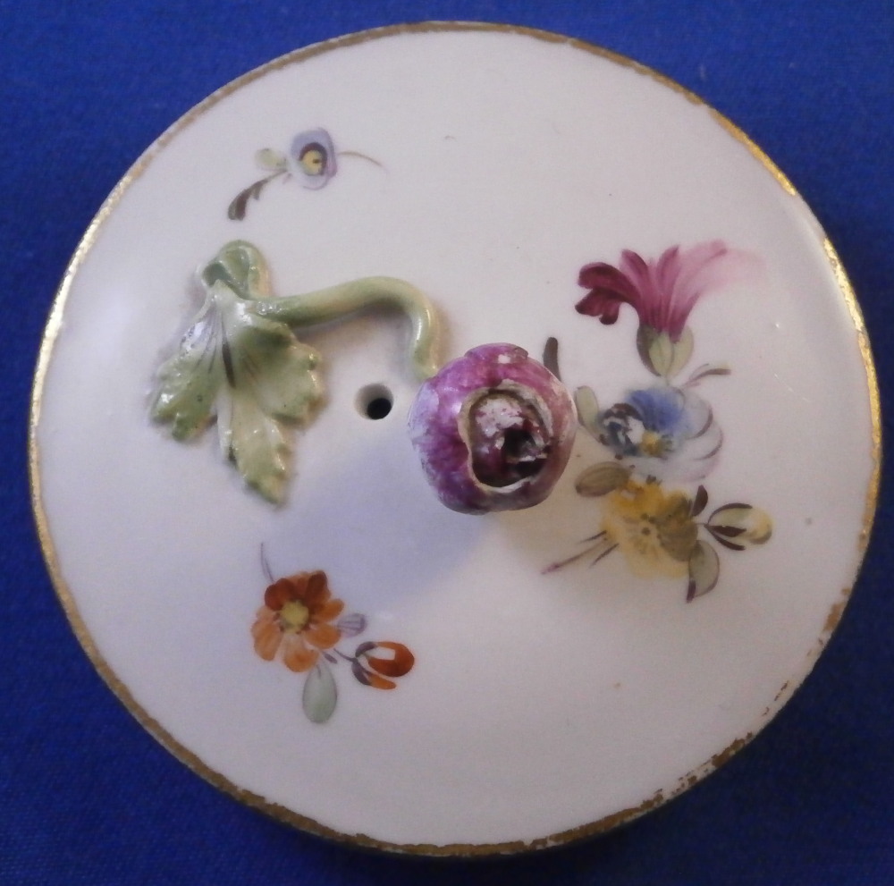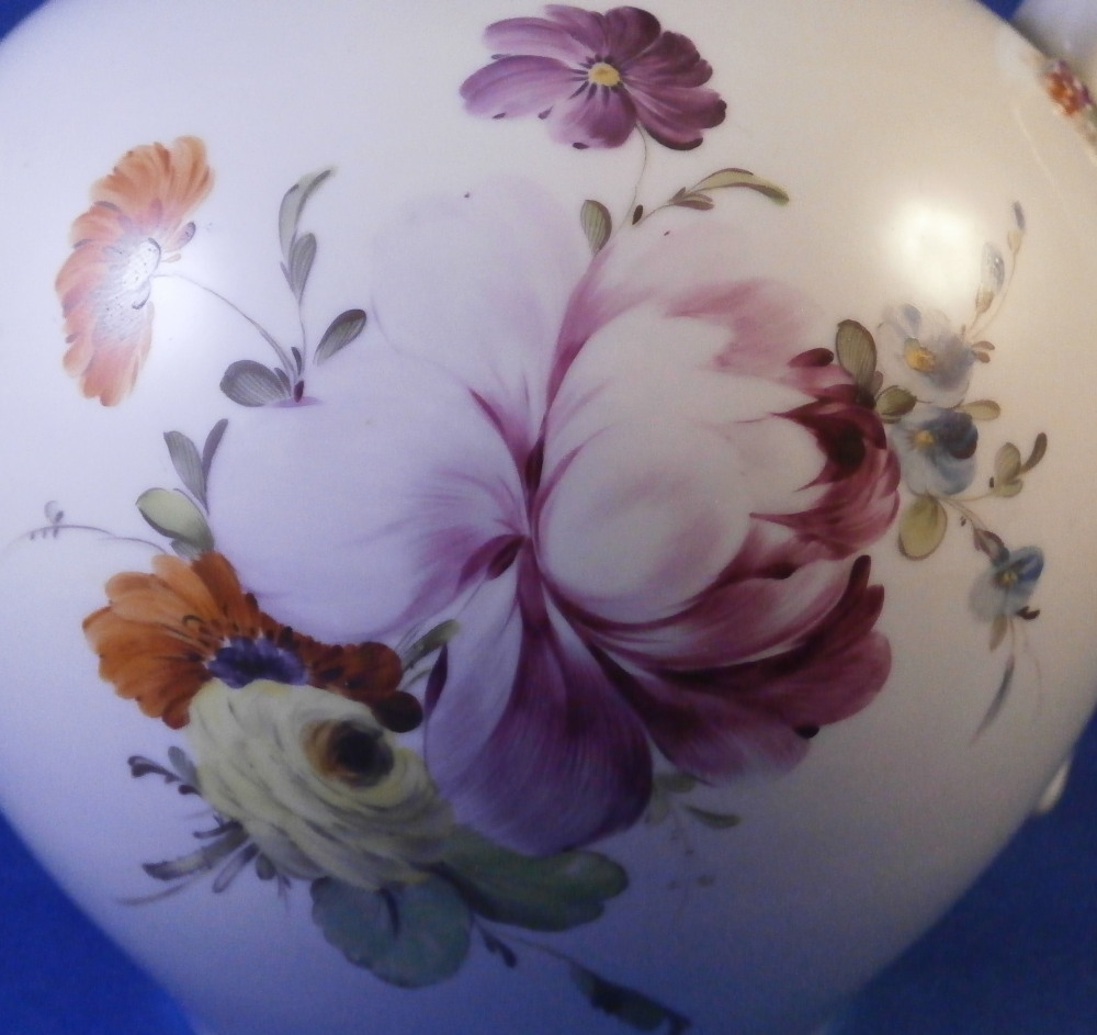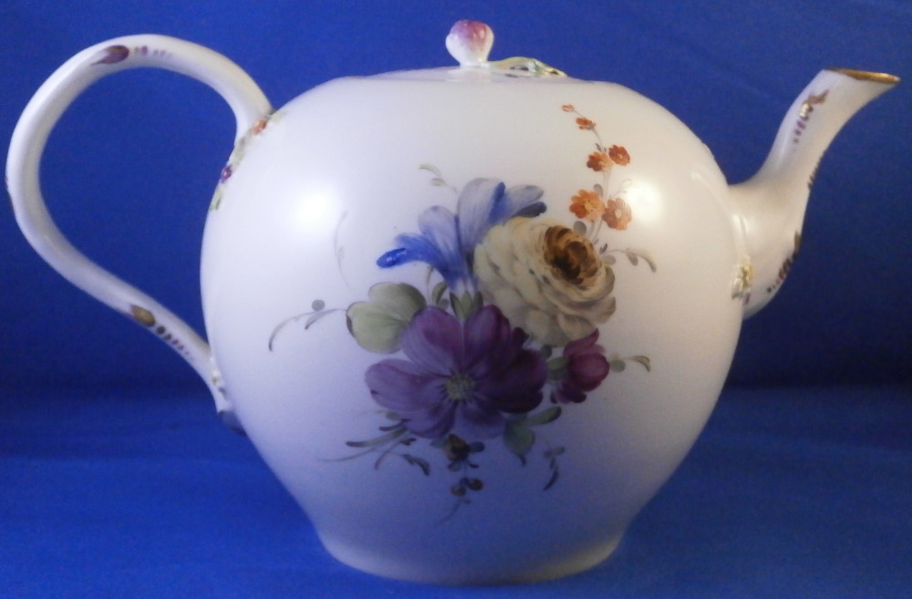 This is a tea pot made at the Hague / Haag from the Netherlands in the 18th century. The pot is hand painted with a nice polychrome floral arrangement to either side, a single small flower below the spout, puce and gold trim to the handle, gold trim to the spout, a tiny floral arrangement to the lid as well as two even smaller single flowers and a nicely done floral finial including it's bud, stem and a leaf. Gold trim to the edge of the lid. My favorite part is the applied 3D flowers to all four directions of the spout and the terminals of the handle. I ahve not seen that before and really like it. They are also hand painted nicely. All in all a superb example and its nice to ahve a piece that is not a cup and saucer or plate. The pot is in good condition with a touch of gold wear around the lid edge which is to be expected amd some minor chipping to the end of the spout. There is an old firing crack where the spout attached to the main body from when it was made. Some nibbling to the floral finial and one spot of flaking of the blue paint in one of the flowers. It is displays perfectly and looks amazing. The piece is marked with the over glaze blue stork mark carrying the eel and an impressed letter L. I assume it is an Ansbach made blank that they decorated. The pot is 4.5 inches tall, 8 inches from handle to spout and 4.75 inches in diameter. Please email me for more information or other pictures.