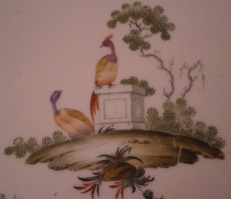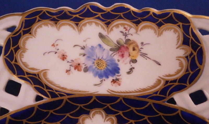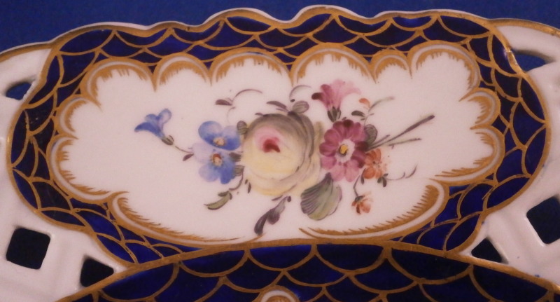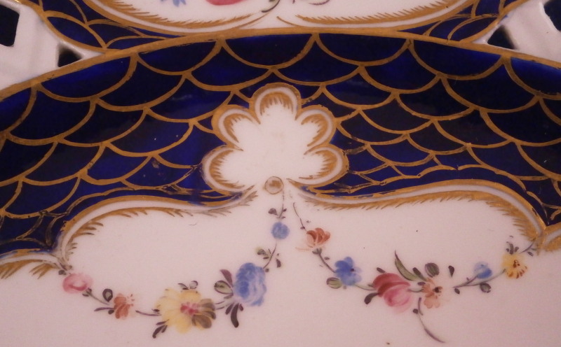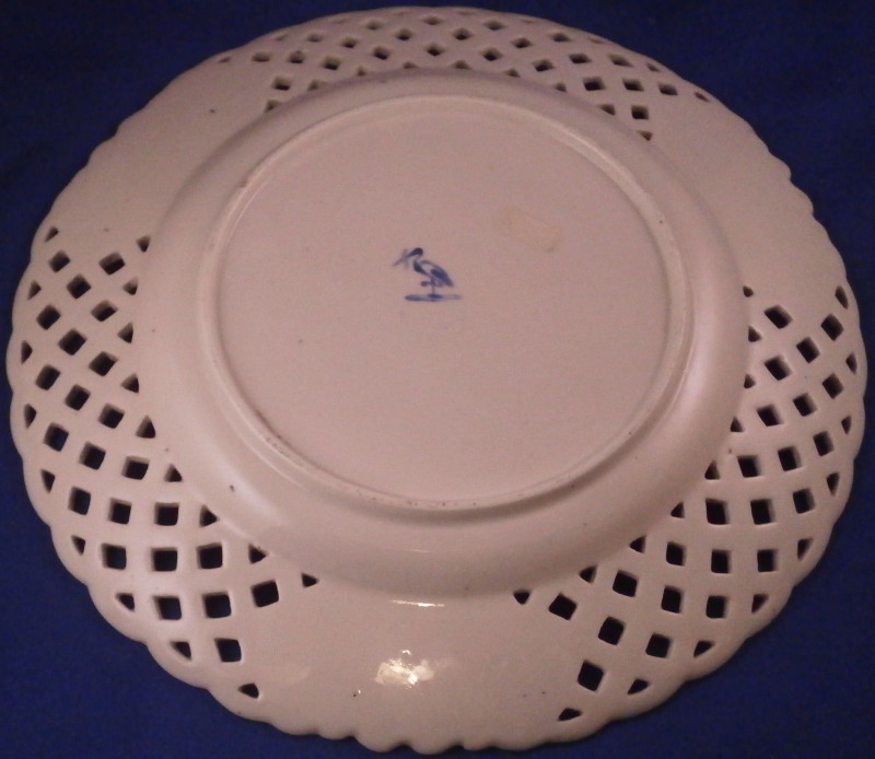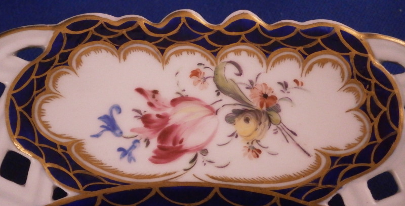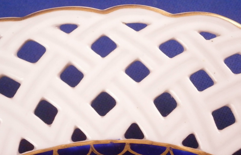 This is a superb reticulated bird scene plate - the blank was made at TournaiI believe and the design hand painted on it by the Hague in the Netherlands in the later 18th century around 1775. The decoration of this plate is superb! The rim is reticulated with a nice design to it, gold trim to the edge amd three floral panels in between that are surrounded by a cobalt blue ground color with some gilding to it. The center of the plate has a bird scene to it of which some versions of this design out there were painted by the famous Fidelle Duvivier but I don't think he painted this one here. The edge of the well has the same cobalt blue ground color with gilding to it with some small floral garlands coming of that into the plate. A stunning design and I have not seen a reticulated version of this design. It is a great plate and the soft paste porcelain is always a treat. The piece is in superb condition with just a couple of small scratches to the bottom right of the bird scene. As nice as one could hope for. The plate is 1 inch tall and 9 inches in diameter. Please email me for more information or other pictures.