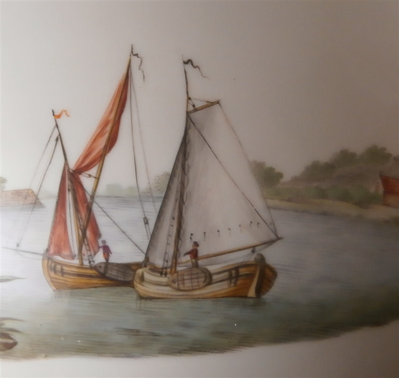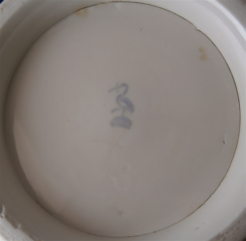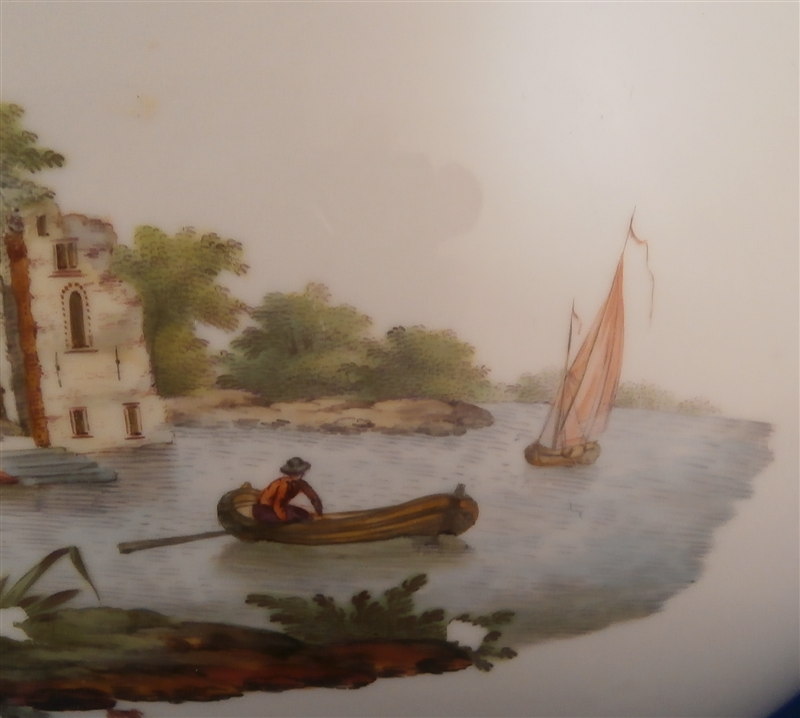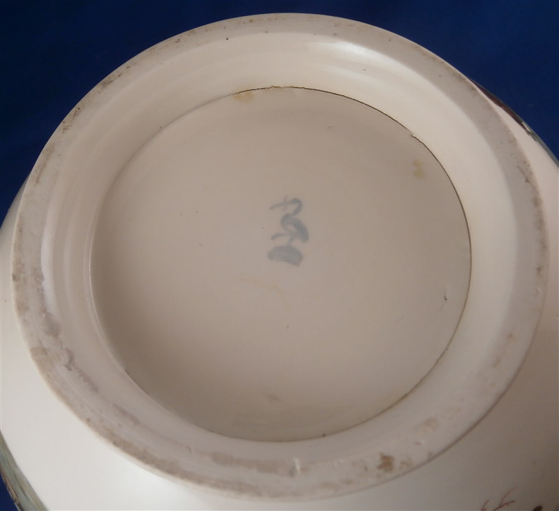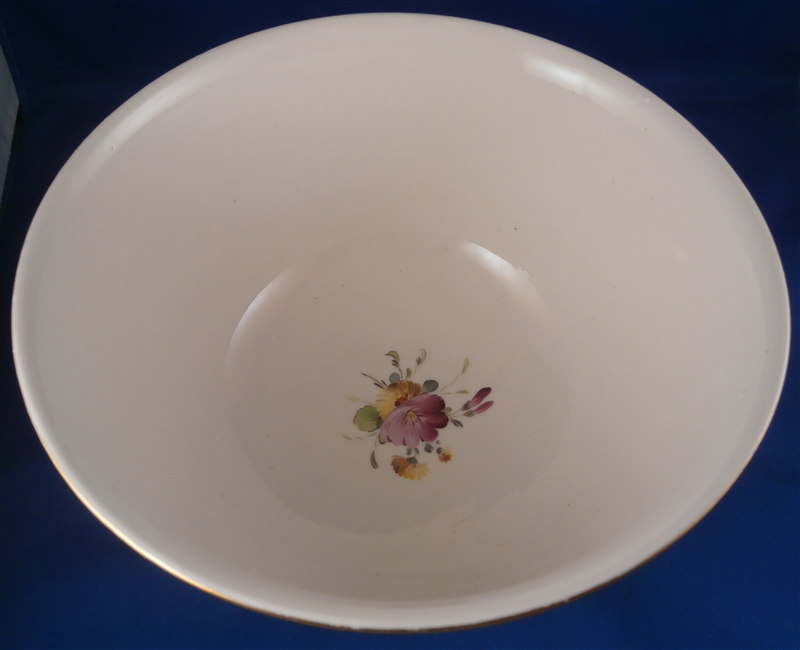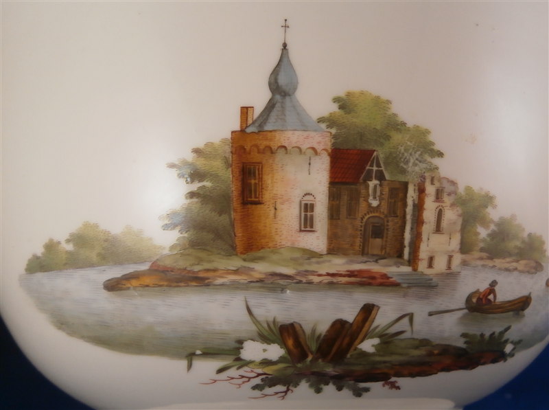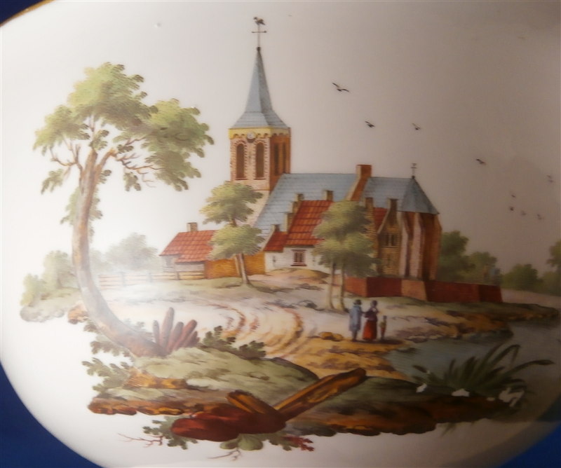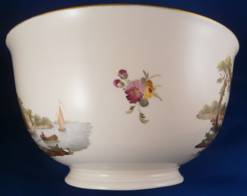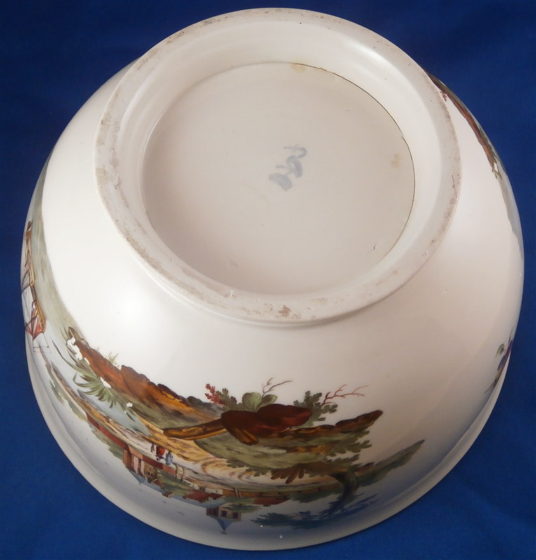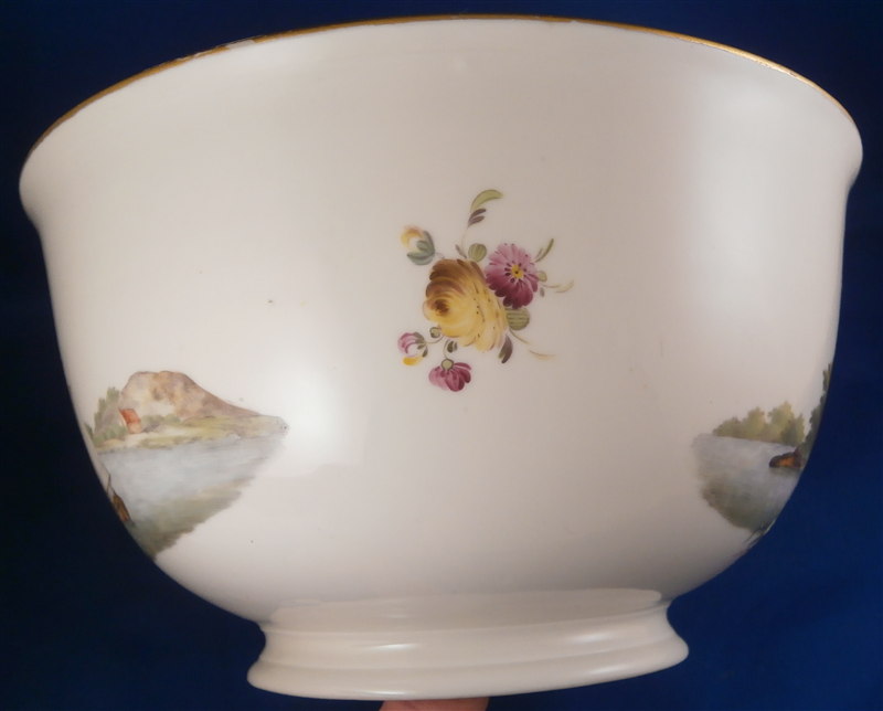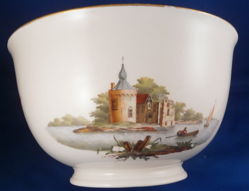 This is a superb slop or waste bowl made by The Hague around 1780. The bowl is hard paste porcelain probably from Ansbach. It has a bit of a creamy appearance. The bowl is handpainted with two large and superb scenes as well as three floral arrangements one being on the inside bottom and a gold trim to the top edge. The scenes are some of the best I have seen by them and are definitely the largest I have owned. Amazingly the piece is in great condition with a bit of green paint flaking in the grasses of the scene and one spot of wear or firing issues in a tree. Tiny bit of wear to the gold trim. There is a little star glaze line underneath but it doesn't go through the porcelain and thus is no real issue. The piece is marked with the above glaze blue stork mark. The bowl is 4.375 inches tall and 7.875 inches in diameter. Please email me for more information or other pictures.