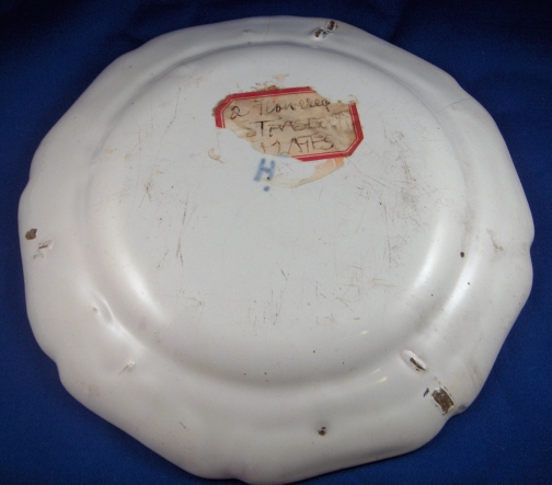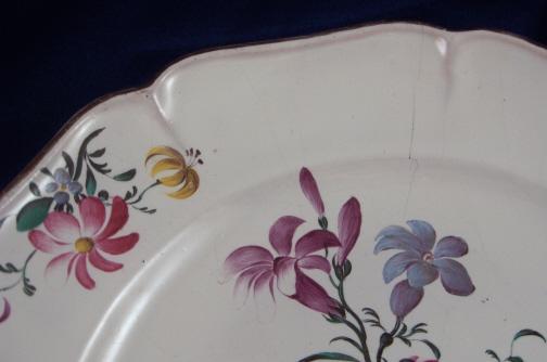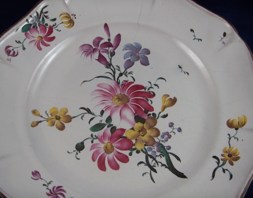 This is a superb 18th century faience / majolica plate handpainted with a superb flower arrangement in the center and three smaller flowers on the rim made by Hannong of Strassburg (aka Strasbourg ) in France. It is just a great example and the flowers are much better than most faience plates one sees. Nice brown trim to the rim.  The piece is in great condition with one hairline from rim to blue flower that is stable. Some use wear underneath. The plate is 1.25 inches tall and 9.625 inches in diameter. Marked underneath with the H and a part of a number mark used by Hannong that is covered up by an old antique store sticker. Please email me for more information or other pictures.