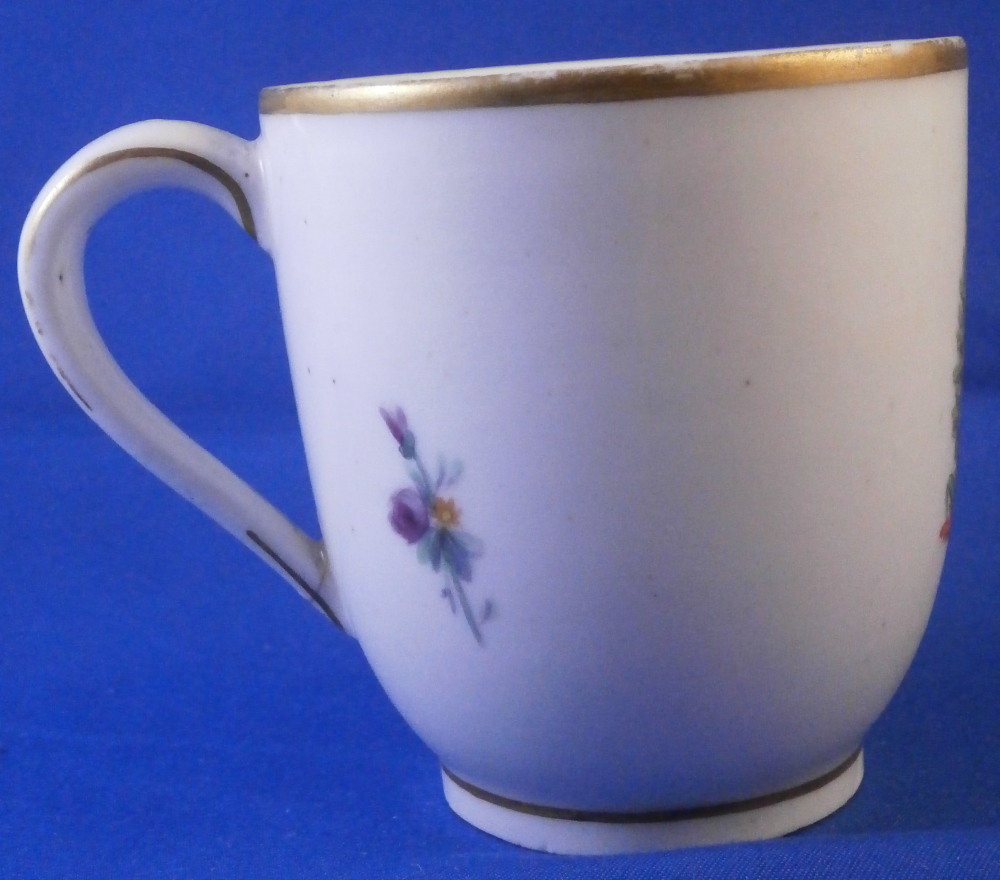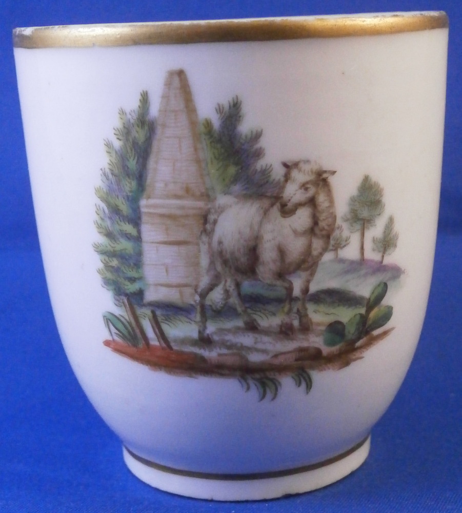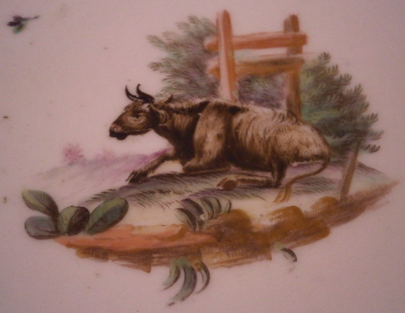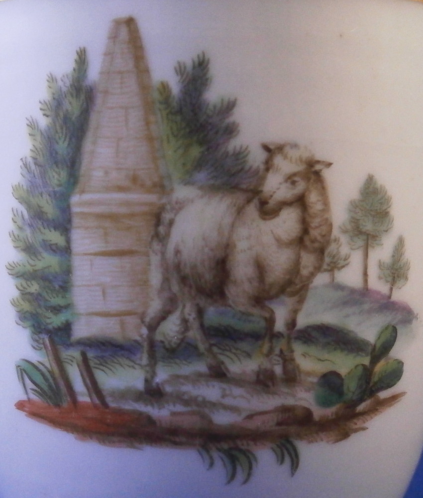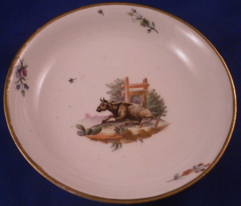 This is a rare and superb cup and saucer made in Strasbourg or early Frankenthal in the 1750's. The Strassburg factory was founded by Karl Franz Hannong as an earthenware maker around 1721 but soon after his son Paul Anton took over the factory around 1732. After he went into partnership with Ringler he began the production of porcelain. The competition with Vincennes forced him to close the factory and move it to Frankenthal which also used this mark in their early years of production but usually in different shapes. The set is hand painted with a superb animal scene in the center - the saucer has a cow resting on the ground surrounded by some nice greenery and a piece of fence and the cup has a sheep with a column behind it in a landscape surrounding. Both have a couple of flowers to the rest of the piece and the saucer has two tiny leaves to hide flaws from the making. Gold trim to the edges and handle. An extremely rare set to find from a rare maker. Both are marked with the under glaze blue H with a dot above it as well as some letters and numbers as shown. The saucer has some hard to see incised numbers / letters as shown. The saucer is in perfect condition with some manufacturing flaws and impurities normal on these early wares and the cup has a crack across the bottom terminal of the handle that affects the cup body in that spot a bit as well (just the outside!) and a knocked area to the foot ring that never came off. The cup is a bit over 2.75 inches tall and has a diameter of 2.625 inches while the saucer is 1.125 inches tall and 5.5 inches in diameter. Please email me for more information or photos.