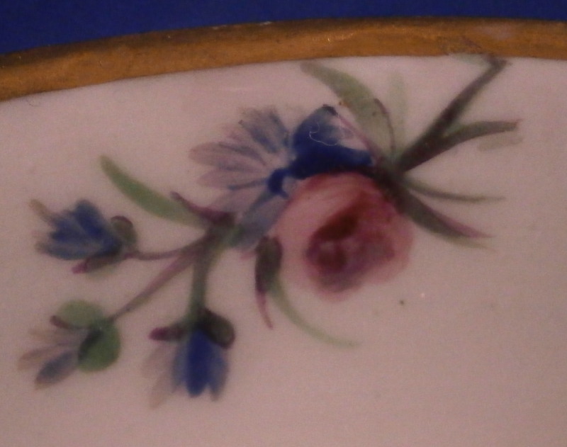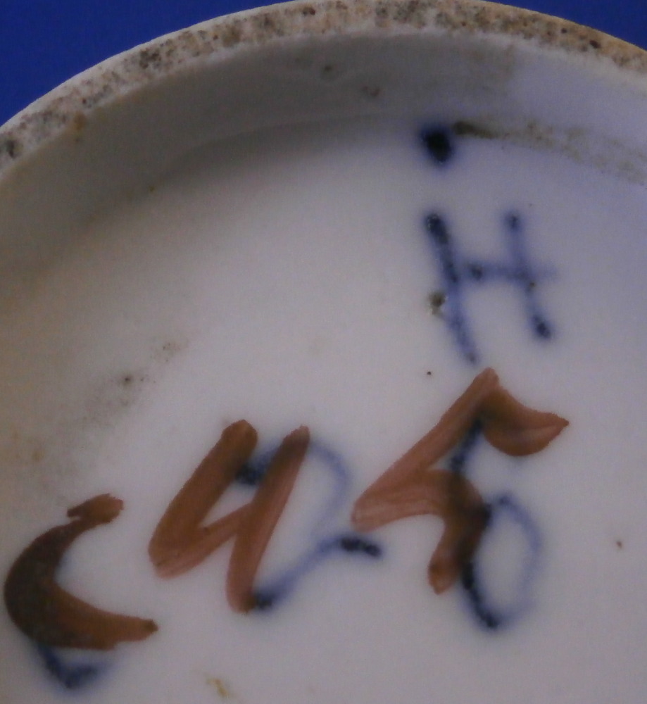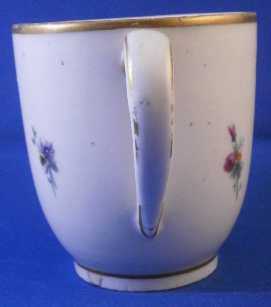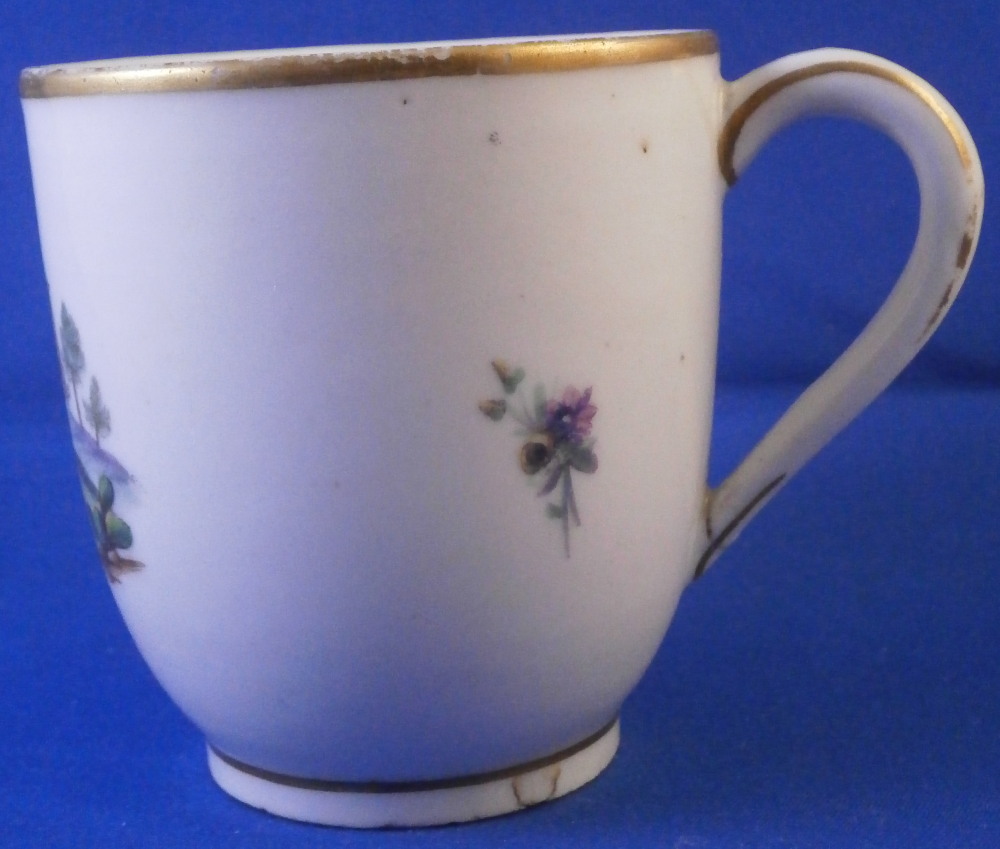 This is a rare and superb cup and saucer made in Strasbourg or early Frankenthal in the 1750's. The Strassburg factory was founded by Karl Franz Hannong as an earthenware maker around 1721 but soon after his son Paul Anton took over the factory around 1732. After he went into partnership with Ringler he began the production of porcelain. The competition with Vincennes forced him to close the factory and move it to Frankenthal which also used this mark in their early years of production but usually in different shapes. The set is hand painted with a superb animal scene in the center - the saucer has a cow resting on the ground surrounded by some nice greenery and a piece of fence and the cup has a sheep with a column behind it in a landscape surrounding. Both have a couple of flowers to the rest of the piece and the saucer has two tiny leaves to hide flaws from the making. Gold trim to the edges and handle. An extremely rare set to find from a rare maker. Both are marked with the under glaze blue H with a dot above it as well as some letters and numbers as shown. The saucer has some hard to see incised numbers / letters as shown. The saucer is in perfect condition with some manufacturing flaws and impurities normal on these early wares and the cup has a crack across the bottom terminal of the handle that affects the cup body in that spot a bit as well (just the outside!) and a knocked area to the foot ring that never came off. The cup is a bit over 2.75 inches tall and has a diameter of 2.625 inches while the saucer is 1.125 inches tall and 5.5 inches in diameter. Please email me for more information or photos.