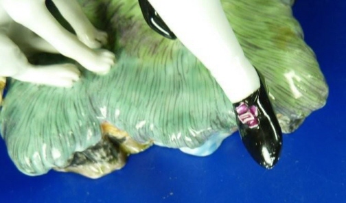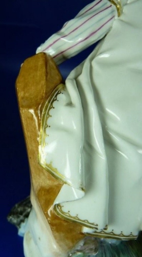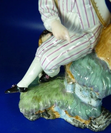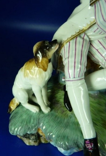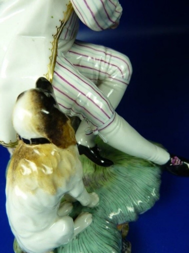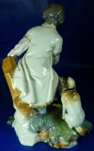 This is a figurine made by Melchior at Hoechst in about 1765. It is of a boy with his dog on the typical grass and rock base used by him almost all the time. It is 6.25 inches tall, 4.75 inches wide and 4 inches deep. The figure is in great condition with an amateurish restoration to his index finger, the bows on his shoes are chipped and the bow on his left pant leg is almost entirely gone. The figure is marked underneath with an underglaze blue wheel mark with the crown on top. Please email me for more information or other pictures.
