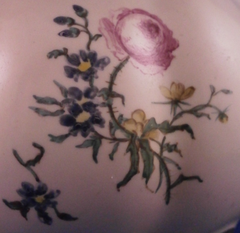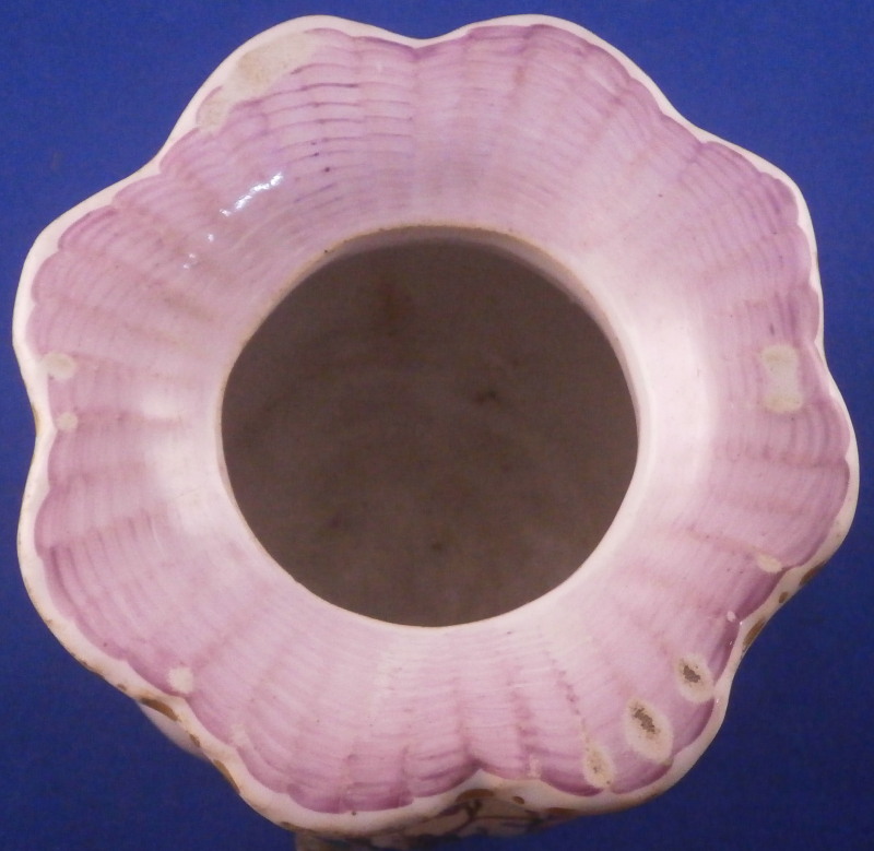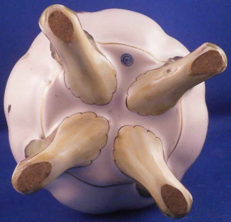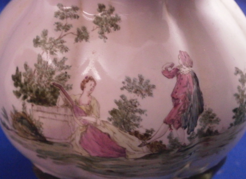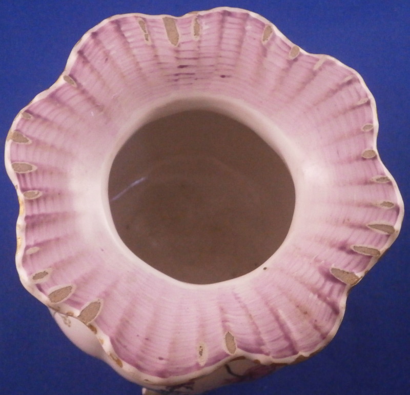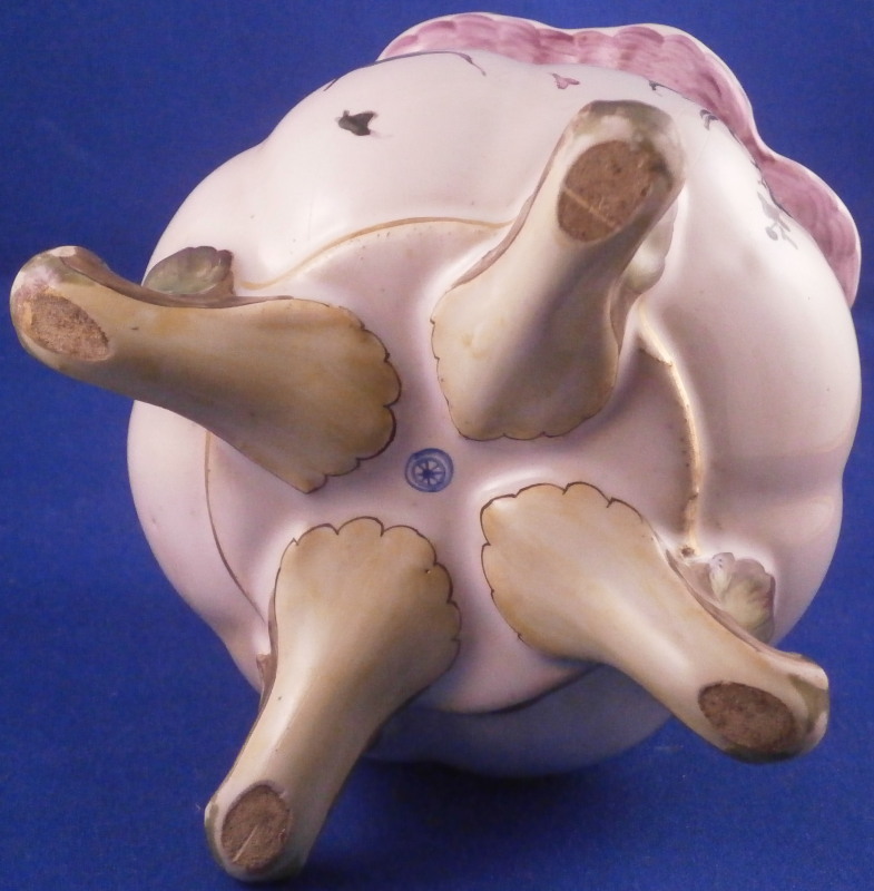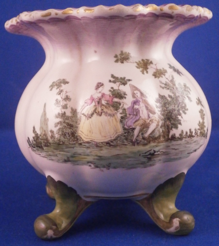 This is a very rare treat. A pair of faience vases or possibly spittoons made by Hoechst in the mid 18th century. I could not find another example so far but the style fits in with this period and what they made. I am going to try to contact Dr. Reber to see what he thinks. They have the right flowers, the feet fit as does the wear. If they truly are by them they would likely a one of a kind that has survived which is spectacular. Each piece has a nice shape to it with a wide flared top painted with a purple striped design, a bulbous body with an amazing scene to one side including a couple in a landscape surrounding with the rest of the piece having two flower arrangements as well as some smaller flowers and even a little bug. Each sits on four feet that are hand painted nicely. A bit of a gold trim to the top edge. It's a pretty early shape and would date around 1760 and they are of superb quality! The vases are both in great condition with a good amount of wear to the top rim from age which is to be expected as well as on the feet as shown. A couple of missed glaze spots from when they were made and some crack type lines in the glaze of one piece though this is also from when they were made. They are not exactly the same shape and height but that is to be expected. A truly amazing set and if they are by Hochst a must have for any collector. Both are marked with the blue wheel mark with the ring around it. A rare mark but it does exist. No other marks which seems a bit unusual as these often have artist marks, etc. They are 4.25 / 4.125 inches tall and about 4 inches in diameter. Please email me for more information or other pictures.