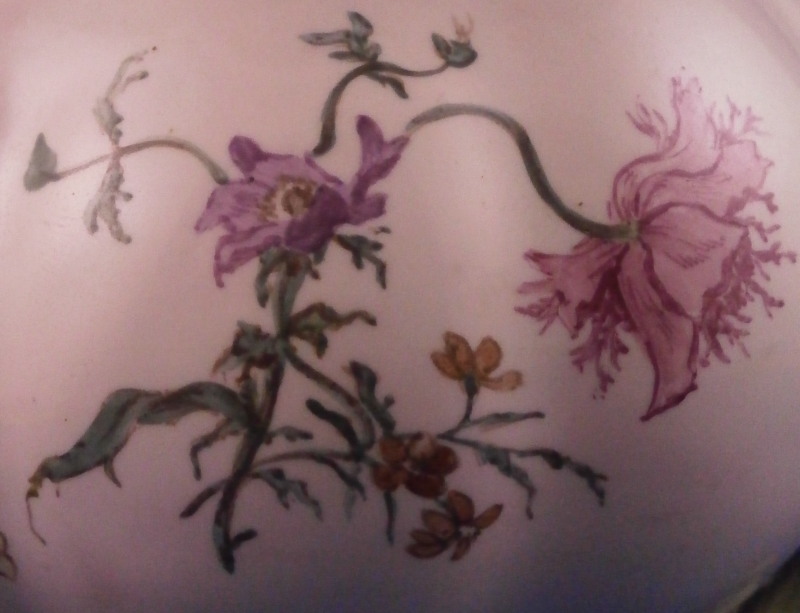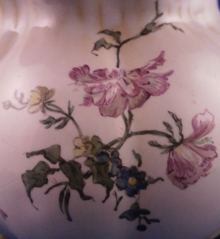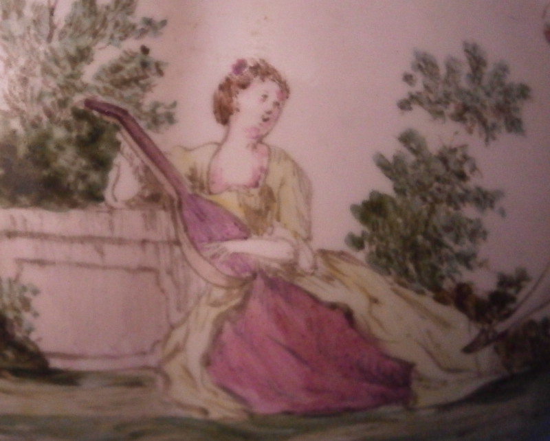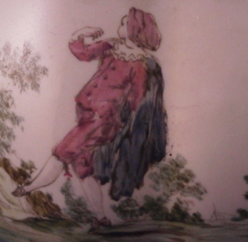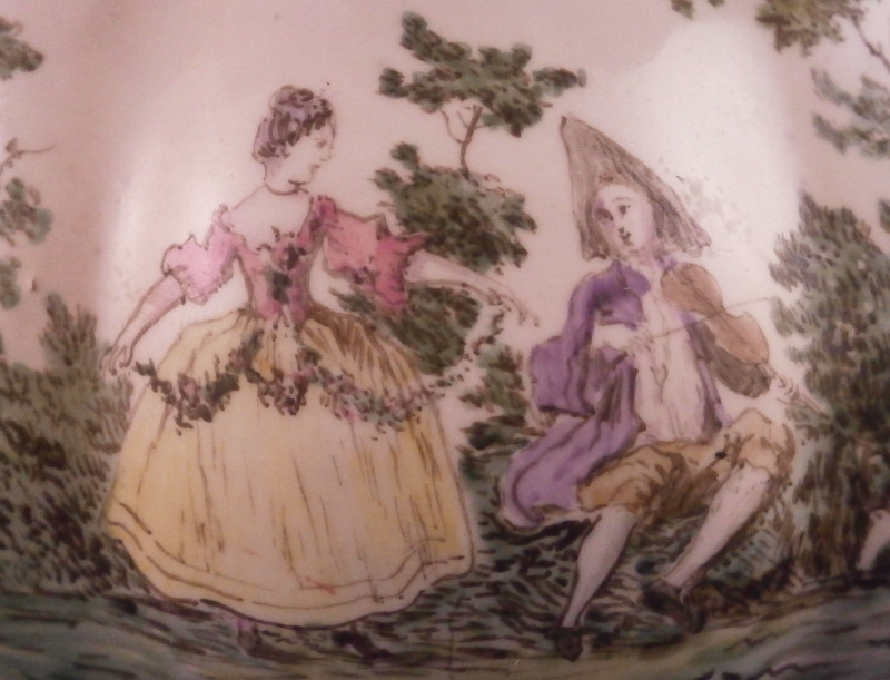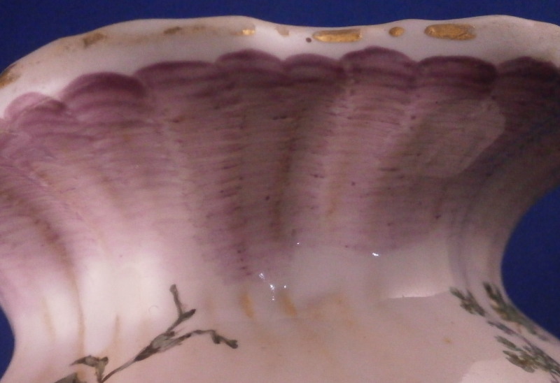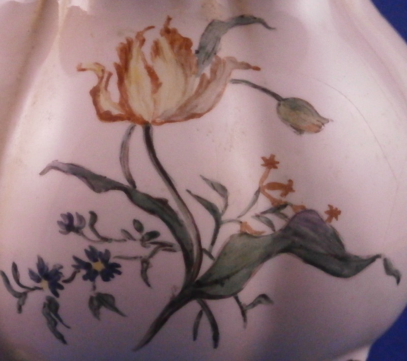 This is a very rare treat. A pair of faience vases or possibly spittoons made by Hoechst in the mid 18th century. I could not find another example so far but the style fits in with this period and what they made. I am going to try to contact Dr. Reber to see what he thinks. They have the right flowers, the feet fit as does the wear. If they truly are by them they would likely a one of a kind that has survived which is spectacular. Each piece has a nice shape to it with a wide flared top painted with a purple striped design, a bulbous body with an amazing scene to one side including a couple in a landscape surrounding with the rest of the piece having two flower arrangements as well as some smaller flowers and even a little bug. Each sits on four feet that are hand painted nicely. A bit of a gold trim to the top edge. It's a pretty early shape and would date around 1760 and they are of superb quality! The vases are both in great condition with a good amount of wear to the top rim from age which is to be expected as well as on the feet as shown. A couple of missed glaze spots from when they were made and some crack type lines in the glaze of one piece though this is also from when they were made. They are not exactly the same shape and height but that is to be expected. A truly amazing set and if they are by Hochst a must have for any collector. Both are marked with the blue wheel mark with the ring around it. A rare mark but it does exist. No other marks which seems a bit unusual as these often have artist marks, etc. They are 4.25 / 4.125 inches tall and about 4 inches in diameter. Please email me for more information or other pictures.