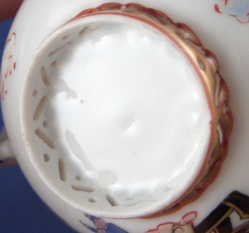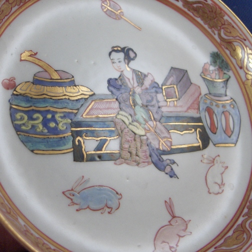 This is a rare cup and saucer made by Herend around 1860. This is when they made their best stuff. It is one of the Herend Chinoiserie designs (copying Chinese and Japanese motives) called the Ming pattern which I think is one of their best. The set is superbly painted with a lady sitting on a bench with some nice vases by her side and three rabbits running around in front of her. The rim has a superb red and gold design to it. The cup has the same trim on the top inside and the outside footring which is also reticulated. The colors are thick enamels which is raised off the porcelain itself. Just amazing. The porcelain is super thin an delicate. Even underneath the saucer there are flowers painted in blue and green ones on the inside of the cup. The handle of the cup is in the shape of a small chinaman. Both pieces are unmarked which is only common on their early wares. The cup definitely never had a mark but the saucer bottom looks to have a small imperfection ground away in the center and their might have been a mark though I doubt that since it was ground just a tiny bit and very evenly. The set is in perfect condition with a small dent in the footring of the cup but that is from the making as there is a bit of paint on it. The cup is a bit over 1.625 inches tall and 2.625 inches in diameter. The saucer is 0.625 inches tall and 4 inches in diameter. Please email me for more information or other pictures.