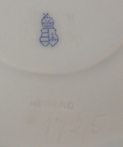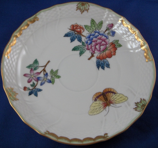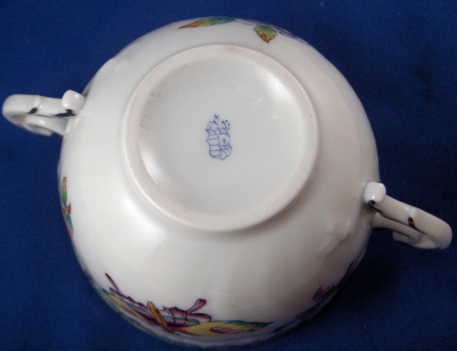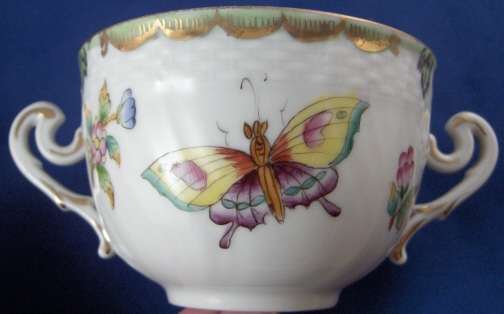 This is an early version of the Queen Victoria pattern on a rare soup cup and saucer with its lid made by Herend in about 1915. It is hard to find their antique pieces and this is one of my favorite patterns by them so I was excited. The set is handpainted with the typical flowers and butterflies along with the green and gold rim typical of this pattern. The rim has a basketweave design in relief and the cup has two nicely shaped handles. The lid has the same design to it and a nice floral finial. Both the cup and the saucer are marked underneath with their blue shield under the crown mark as shown as well as an impressed 1713 (I think) under the cup and the impressed Herend stamp and an incised number 1725 underneath the saucer. The set is in perfect condition. The cup is 2.5 inches tall and 3.75 inches in diameter. The saucer is 1 inch tall and 6.25 inches in diameter and the lid is about 1.5 inches tall and has a diameter of just under 4 inches. Please email me for more information or other pictures.