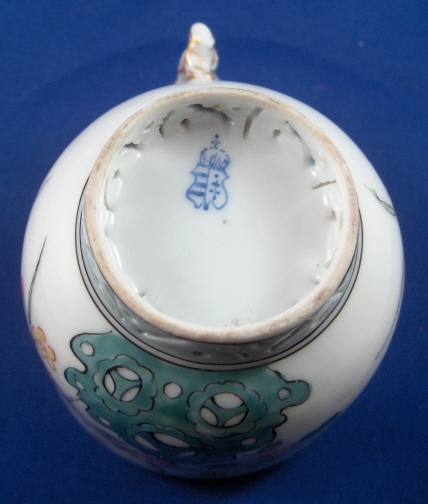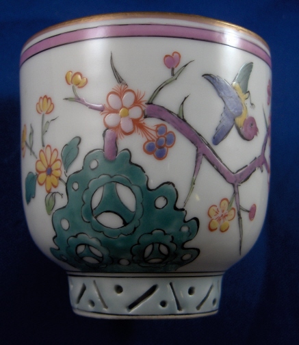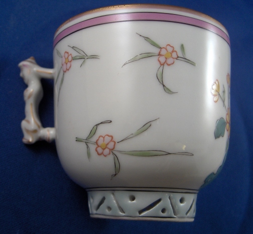 This is a cup and saucer made by Herend around 1860. This is when they made their best stuff. It is one of the Herend Chinoiserie patterns (copying Chinese and Japanese motives) but I am unsure of the name of the pattern. The set is superbly painted with what I think is a prunus blossom tree with a bird and some scattered flowers. The colors are thick and raised off the porcelain itself. Just amazing. Even underneath the saucer there are flowers painted. Both footrings are finely reticulated and painted which I have never seen anywhere else and the handle of the cup is in the shape of a small chinaman. Both pieces are marked underneath with their blue shield under the crown mark. The set is in perfect condition with a few small firing specs inside the cup. The cup is a bit over 2.625 inches tall and 2.625 inches in diameter. The saucer is 1.25 inches tall and 5.25 inches in diameter. Please email me for more information or other pictures.