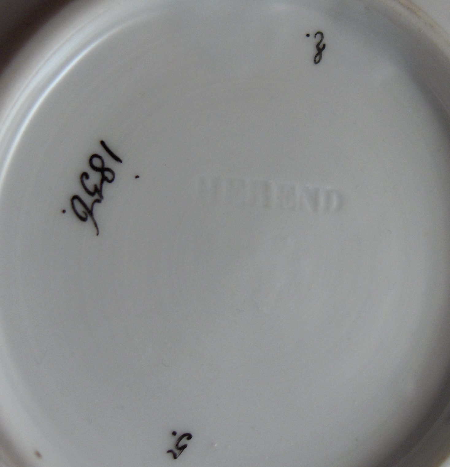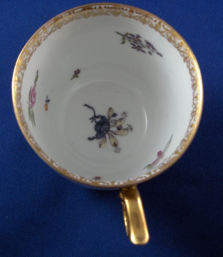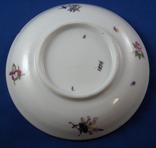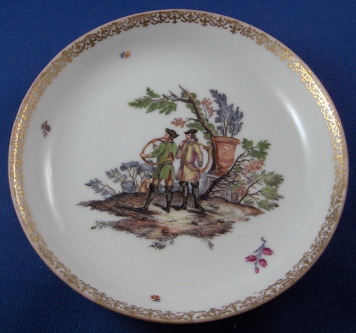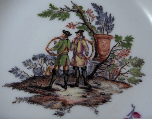 This is an amazing cup and saucer made by Herend around 1856. This is the best example I have seen for sale and belongs in a museum. The cup and saucer are handpainted with a hunting scene in the Meissen style with two hunters and their horns on the saucer and two bears in a landscape on the cup. Likely a replacement for a broken Meissen cup from 100 years earlier which is what Herend did amazingly well! Lots of superb flowers scattered throughout and a nice gold trim. Great handle shape as well. If you didn't know any better you'd think this is Meissen from the mid 18th century :) Even has flowers on the underside of the saucer. Both pieces are marked as shown with the saucer also having the impressed HEREND mark and the year mark of 1856. The cup has a mark I have not seen before! It is an impressed FH . The set is in perfect condition. The cup is 2.625 inches tall and 2.75 inches in diameter. The saucer is 1 inch tall and 5.5 inches in diameter. Please email me for more information or other pictures.
