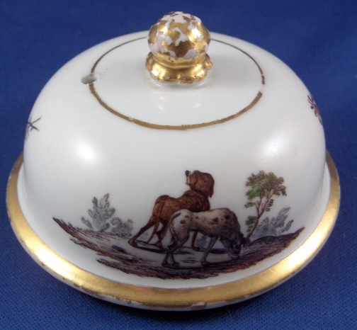 This is a superb lid made by Meissen in about 1740. It is hand painted with a hunting / dog scene with one dog in a landscape surrounding on one side and two dogs on the other with a nice gold trim and finial. The quality of the painting is top notch! The lid is un marked which would be normal but it does have the gilders number 12. on the underside as shown. The piece is in OK condition but has a larger chip and a tiny one. The lid is 1.5 inches tall and 3 inches in diameter. Please email me for more information or other pictures.