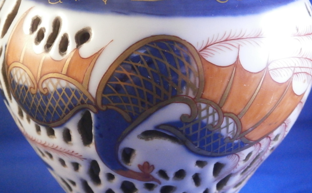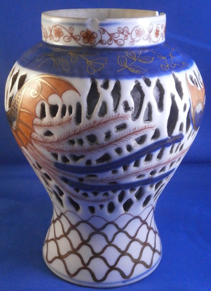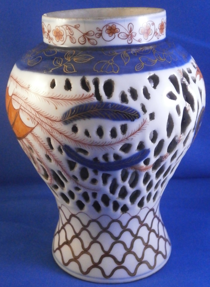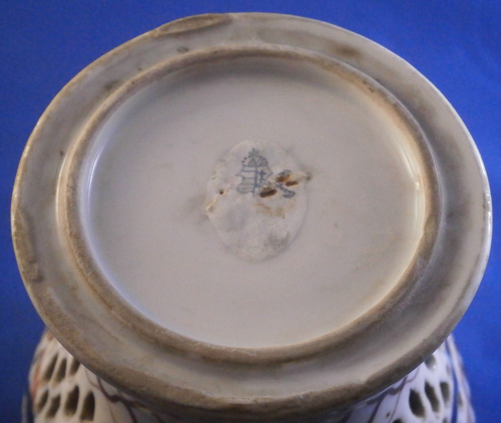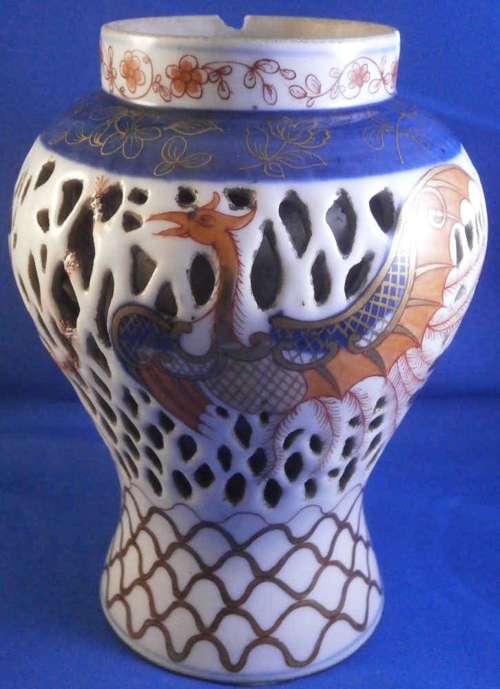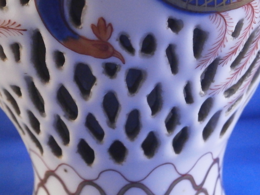 This is a really neat early reticulated vase with its lid made by Herend in the mid 19th century. These early pieces by them are very hard to find - I did find one modern example with a different pattern. I have not seen this pattern before either! The vase is double walled which was probably copied from much earlier Chinese examples. The outside wall is reticulated and the inside wall solid so it can be used properly as a vase. The lid only has an outside reticulated wall with the bottom being solid. Both pieces are hand painted with a red, gold and blue design based on Imari colrs. It is of Phoenix bird or dragonwith long red feathers. Really a great looking design that goes all around. The vase is in good condition with two chips to the top rim of the main body and a couple of minor hairlines/ glaze lines along the top rim. There is one section of the reticulated part that has been factory repaired and a tail feather painted over that. Shows that they still had production issues back then! The underside must have had a flaw as well and it was painted over with liquid porcelain slip and then marked on top of that. Each cut out has the edges very dirty and it could use a careful cleaning. The edges are not glazed and thus the issue of dirt sticking to it. Either way a really interesting and rare piece! It looks stunning and is unlike any other piece by any maker in terms of design. They truly did some amazing work early on! The vase is marked underneath with the blue shield mark as well as a letter S. The piece is 9.5 inches tall and 4.5 inches in diameter. Please email me for more information or other pictures.