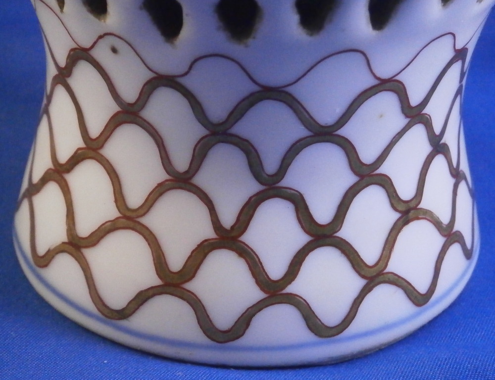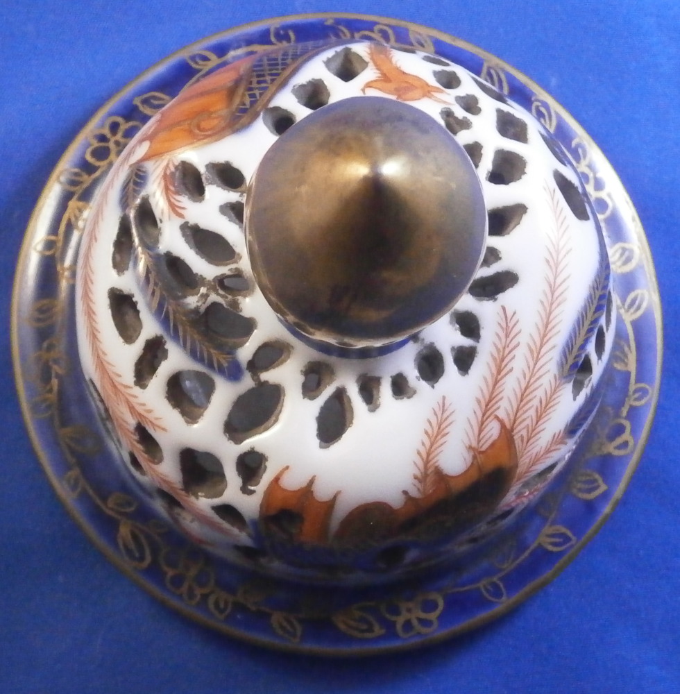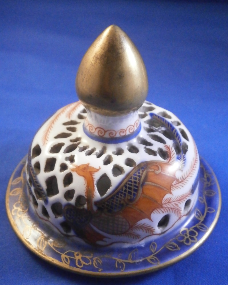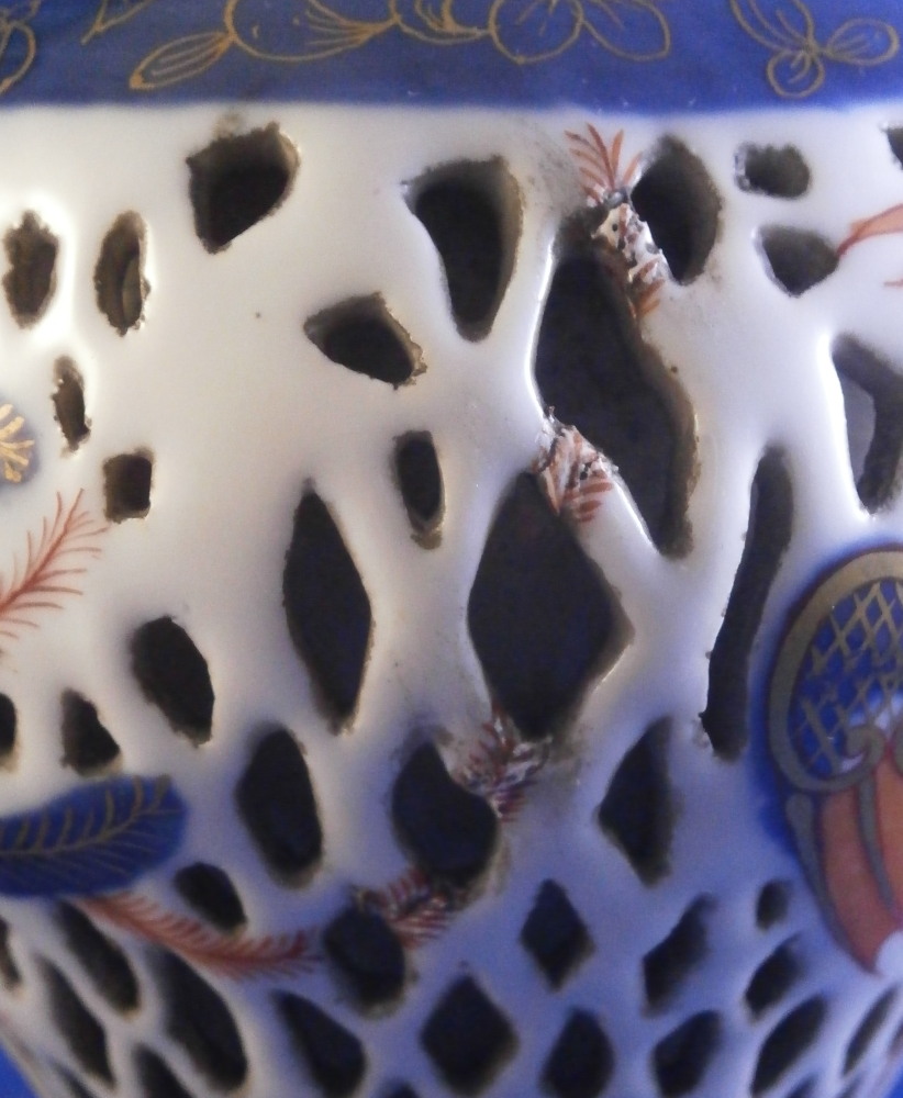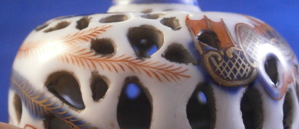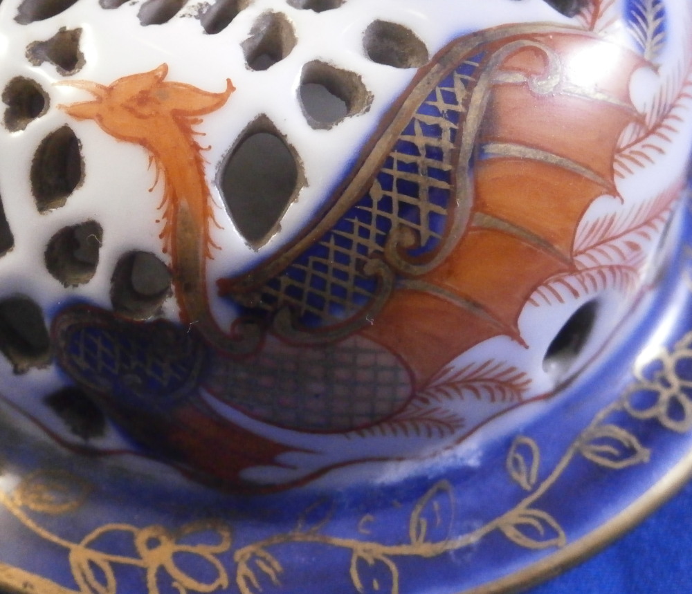 This is a really neat early reticulated vase with its lid made by Herend in the mid 19th century. These early pieces by them are very hard to find - I did find one modern example with a different pattern. I have not seen this pattern before either! The vase is double walled which was probably copied from much earlier Chinese examples. The outside wall is reticulated and the inside wall solid so it can be used properly as a vase. The lid only has an outside reticulated wall with the bottom being solid. Both pieces are hand painted with a red, gold and blue design based on Imari colrs. It is of Phoenix bird or dragonwith long red feathers. Really a great looking design that goes all around. The vase is in good condition with two chips to the top rim of the main body and a couple of minor hairlines/ glaze lines along the top rim. There is one section of the reticulated part that has been factory repaired and a tail feather painted over that. Shows that they still had production issues back then! The underside must have had a flaw as well and it was painted over with liquid porcelain slip and then marked on top of that. Each cut out has the edges very dirty and it could use a careful cleaning. The edges are not glazed and thus the issue of dirt sticking to it. Either way a really interesting and rare piece! It looks stunning and is unlike any other piece by any maker in terms of design. They truly did some amazing work early on! The vase is marked underneath with the blue shield mark as well as a letter S. The piece is 9.5 inches tall and 4.5 inches in diameter. Please email me for more information or other pictures.