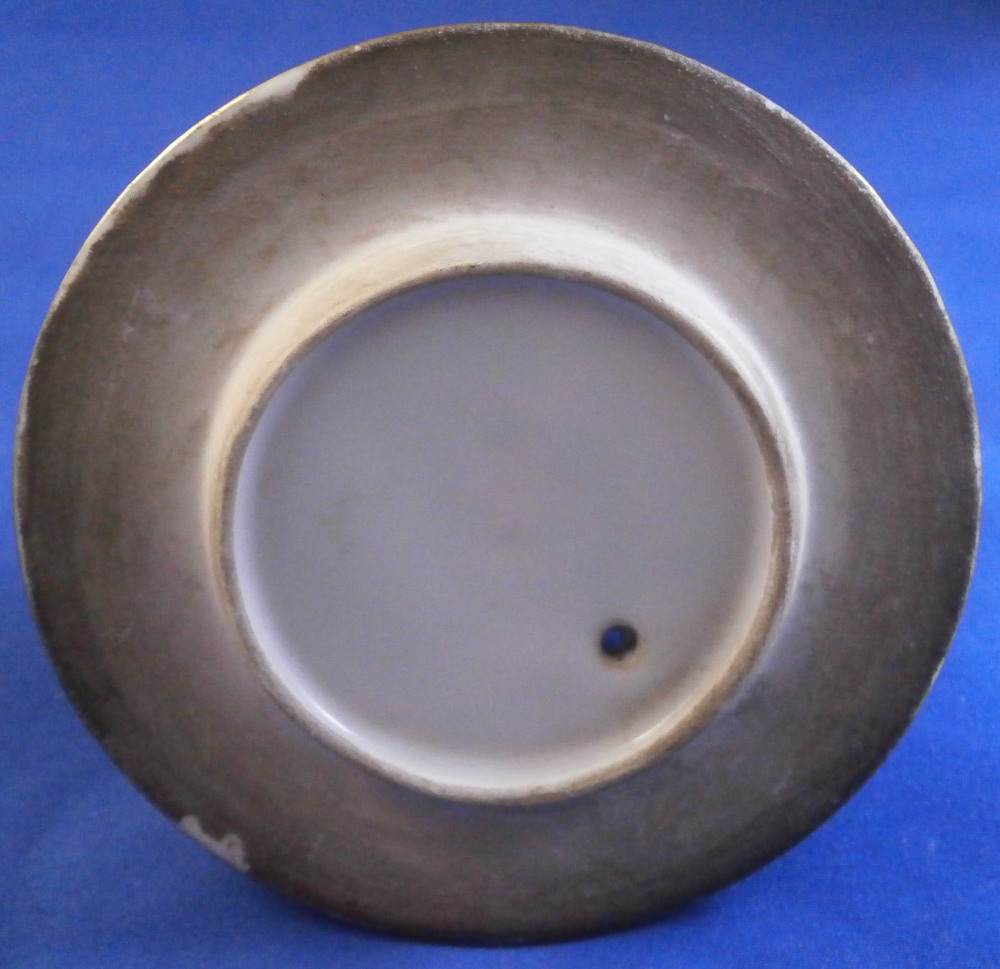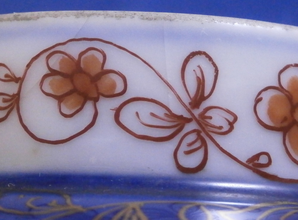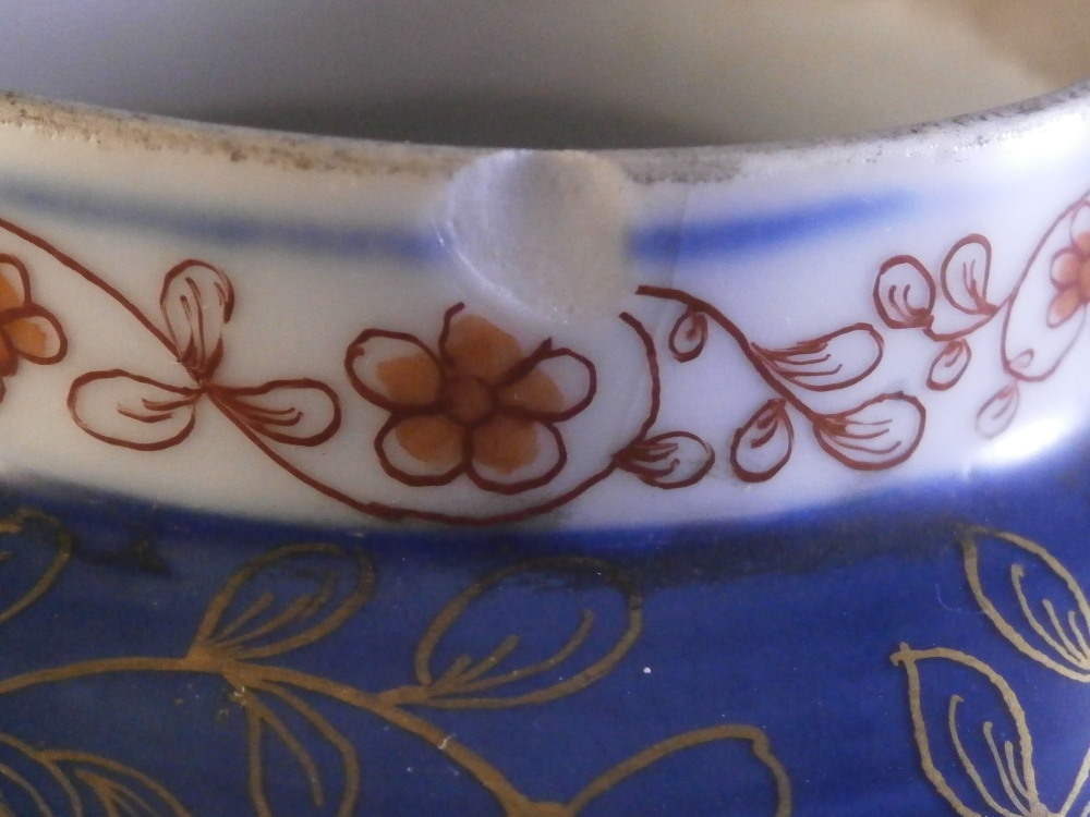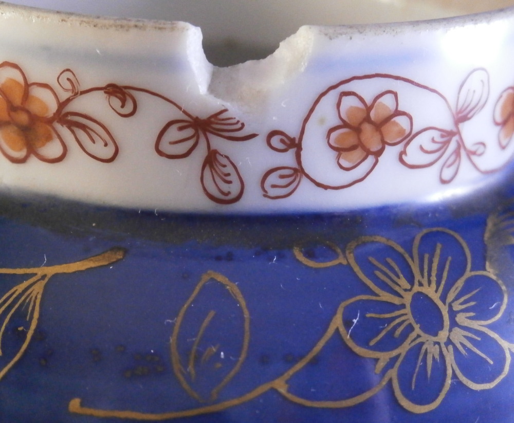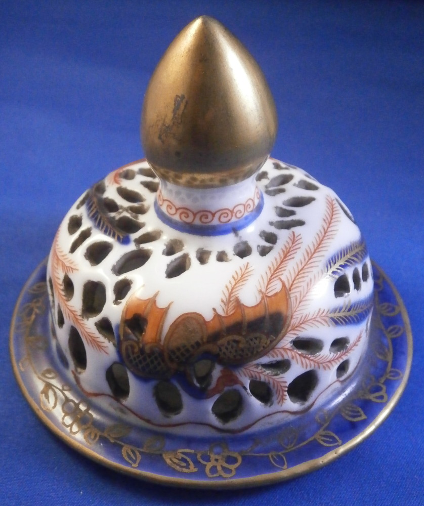 This is a really neat early reticulated vase with its lid made by Herend in the mid 19th century. These early pieces by them are very hard to find - I did find one modern example with a different pattern. I have not seen this pattern before either! The vase is double walled which was probably copied from much earlier Chinese examples. The outside wall is reticulated and the inside wall solid so it can be used properly as a vase. The lid only has an outside reticulated wall with the bottom being solid. Both pieces are hand painted with a red, gold and blue design based on Imari colrs. It is of Phoenix bird or dragonwith long red feathers. Really a great looking design that goes all around. The vase is in good condition with two chips to the top rim of the main body and a couple of minor hairlines/ glaze lines along the top rim. There is one section of the reticulated part that has been factory repaired and a tail feather painted over that. Shows that they still had production issues back then! The underside must have had a flaw as well and it was painted over with liquid porcelain slip and then marked on top of that. Each cut out has the edges very dirty and it could use a careful cleaning. The edges are not glazed and thus the issue of dirt sticking to it. Either way a really interesting and rare piece! It looks stunning and is unlike any other piece by any maker in terms of design. They truly did some amazing work early on! The vase is marked underneath with the blue shield mark as well as a letter S. The piece is 9.5 inches tall and 4.5 inches in diameter. Please email me for more information or other pictures.