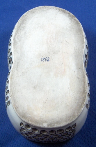 This is a reticulated dish made by Herend in about 1862. It is small with reticulated sides that are painted with the O'Sullivan pattern. It is painted with different colors on all four insides sides with small flowers in between. The bottom inside has two superb chinoiserie scenes handpainted on it with a neat design in between them. There is a gold trim to the edge and black outlines to the outside around every single cutout! Lot of work went into this little treasure. The dish is in perfect condition and marked underneath with the black number 1862. which is probably the year it was made (it certainly fits the style and quality and other age signs). The dish is 1.25 inches tall, 4.125 inches long and 2.5 inches wide. As for the use of this thing - no idea except maybe for gambling tokens. Please email me for more information or other pictures.