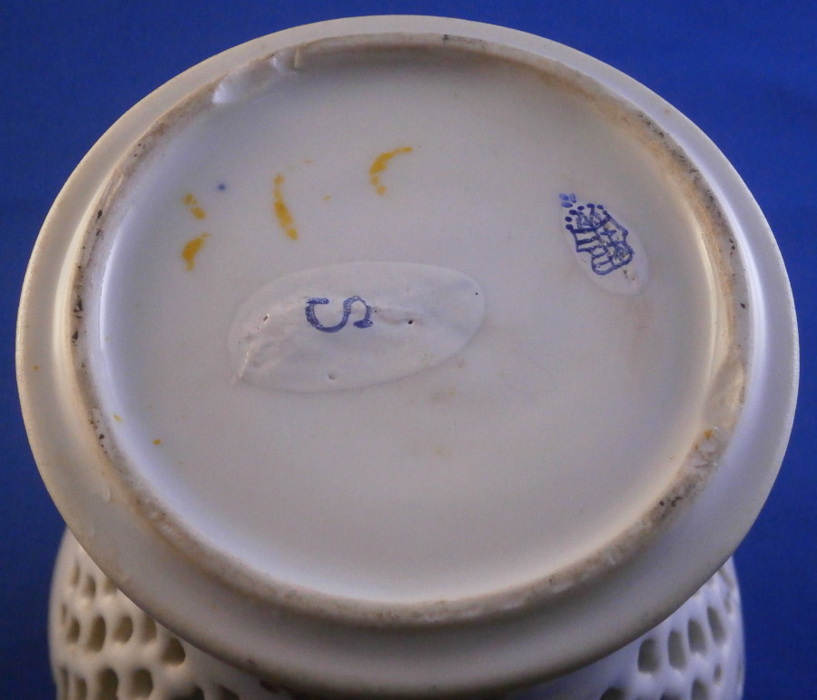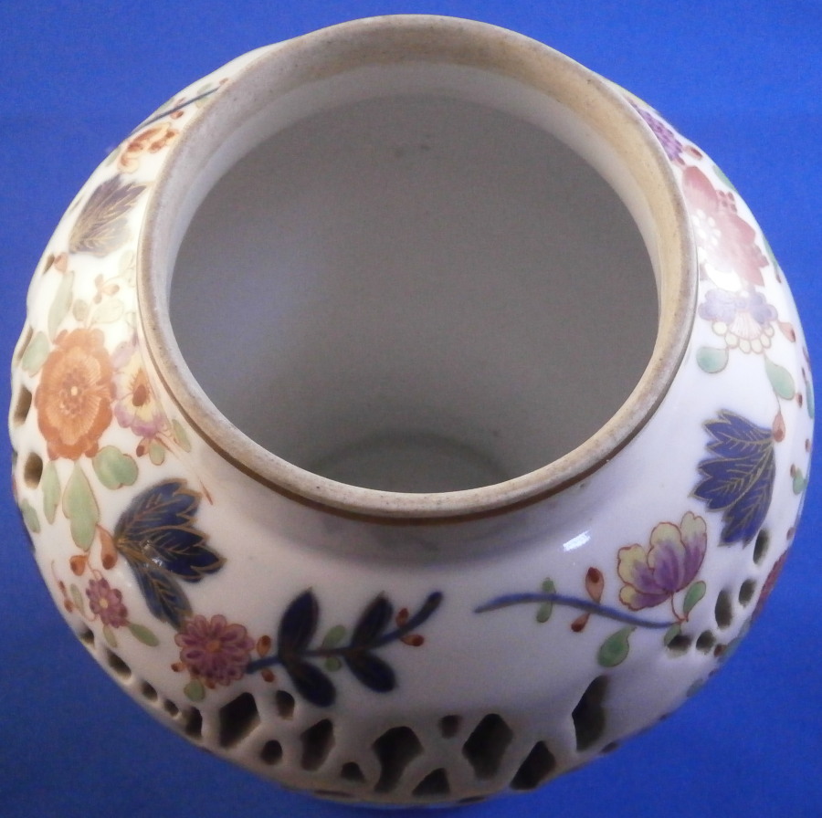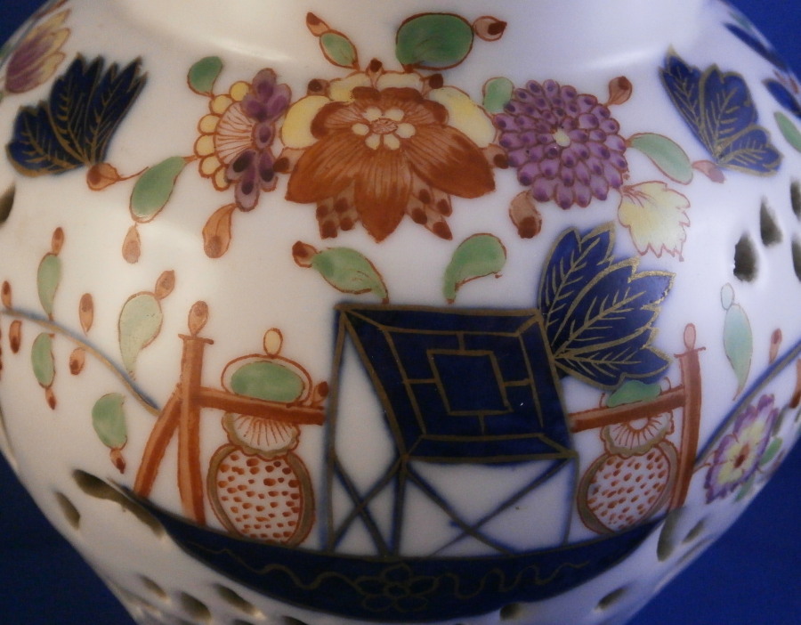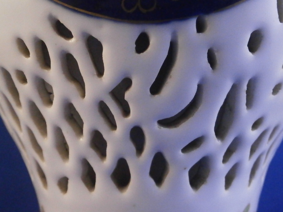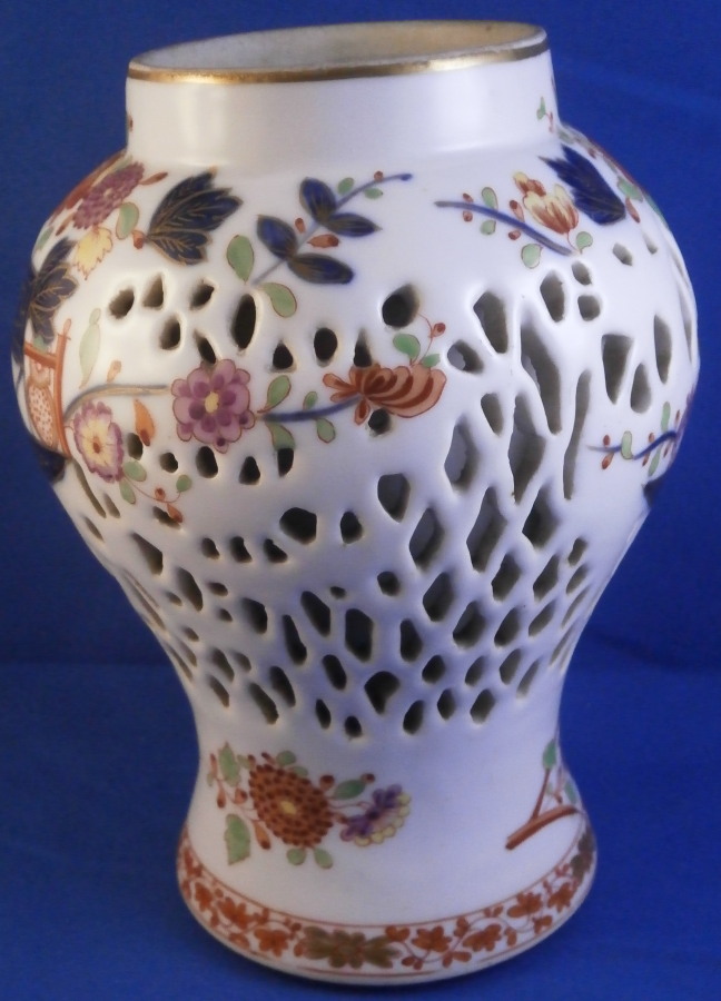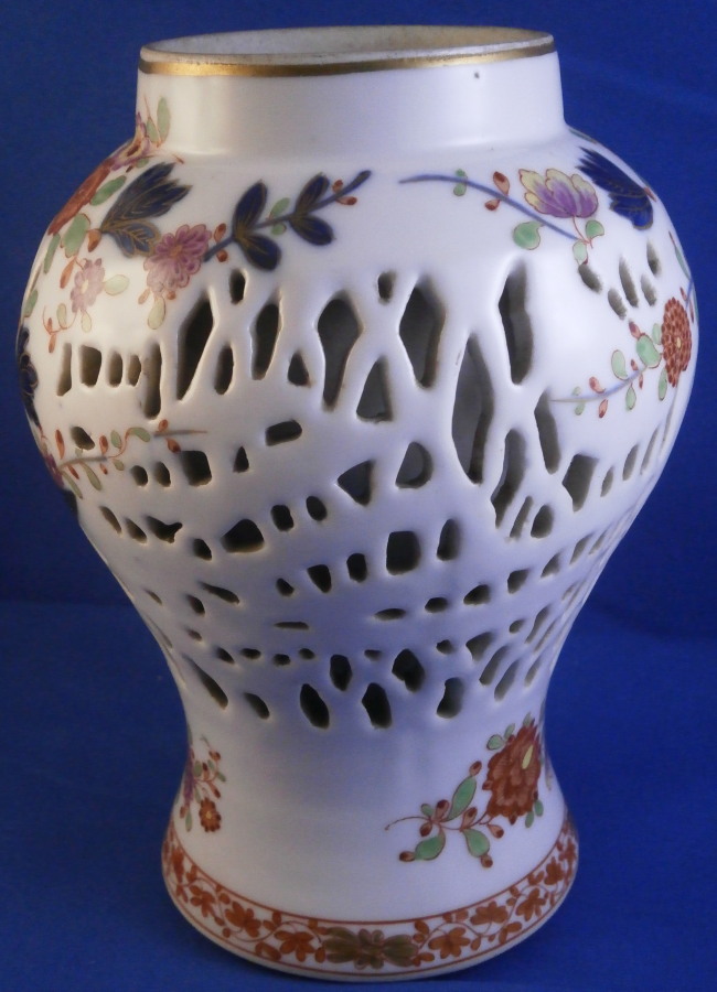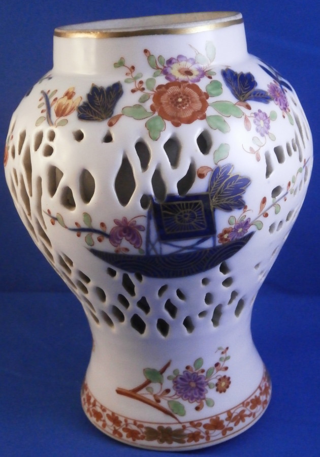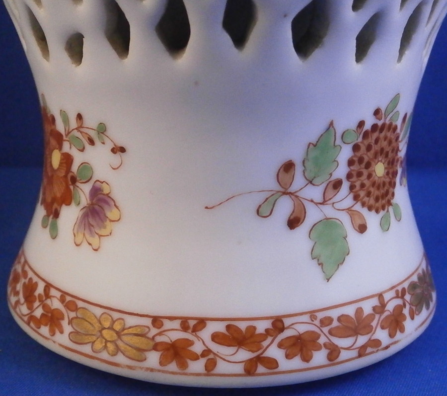 This is a really nice early reticulated vase made by Herend in the mid 19th century. These early pieces by them are very hard to find and the quality is absolutely amamzing. More often than not it is based on the top German maker and matches them in terms of quality. The vase is double walled with the outside wall being reticualted and the inside wall solid so it can be used properly. It is hand painted all around the outside with a design based on the Tischchenmuster with the cobalt blue table with gold highlights and Kakiemon flowers in polychrome. Nice iron red and gold trim along the bottom edge and gold line around the top. The vase is in great condition! The inside top edge is unglazed so it might have had a lid at one point. Not sure. There is a very minor touch of wear and a small chip to the foot ring as shown which does not affect the piece when on display! It looks stunning and is unlike any other piece by any maker in terms of design. They truly did some amazing work early on! The vase is marked underneath with the blue shield mark as well as a letter S. It all looks a little funny since they painted them over factory repairs for cracks in the underside but it's all correct! The piece is 6.5 inches tall and 4.5 inches in diameter. Please email me for more information or other pictures.