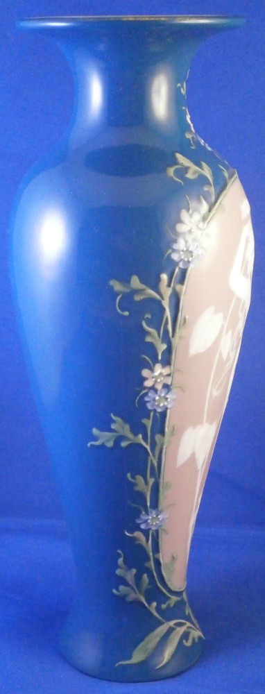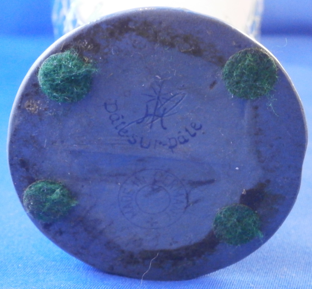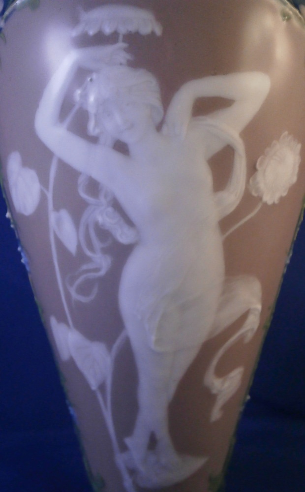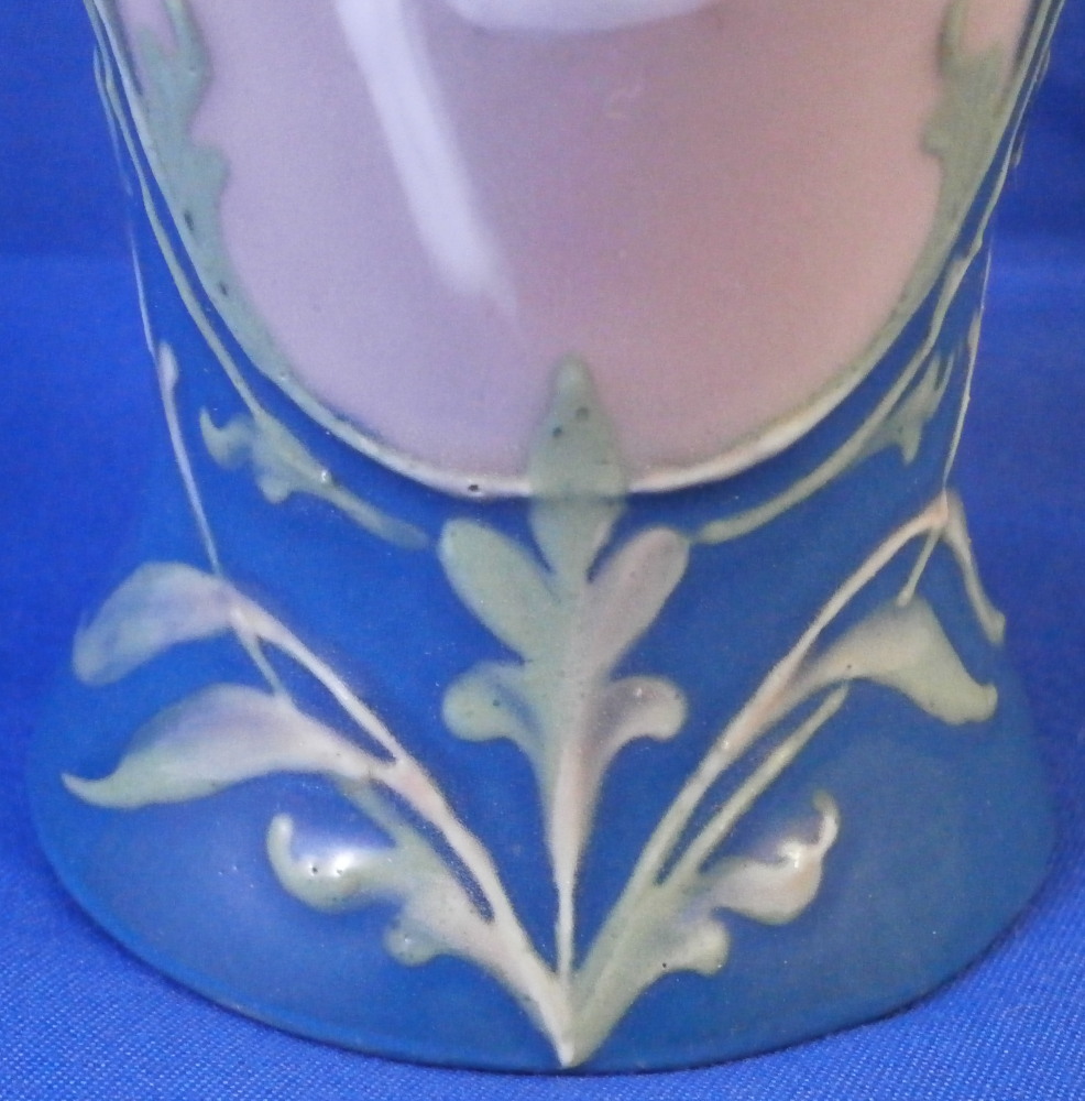 This isa superb vase made by Heubach in Germany in the late 19th century. A superb Art Nouveau period piece that is decorated by the famous and sought after Pate-sur-Pate technique. These were hard to make as the raised design was slowly done by adding layer after layer having to be fired in between each of them. That made for a wonderfully translucent design that had more of a three dimensional look than regular porcelain paintings. Often made by them for the Maerican market and thus marked in English underneath. This vase here is deocrated with a semi nide lady in the traditional white on a pink background. She has her breasts exposed while a cloth is covering her mid section. Nice flowers by her side. What makes this piece a bit more special than most is the instead of the gold trim surrounding the scene here we have flowers in the pate sur pate technique in green, pnk and blue. Quite unusual and it looks stunning! The rest of the vase has a greenish blue ground color to it with a bit of gold trim to the top. The vase is marked underneath with the blue HI mark with the star above it, pate-sur-pate under is and Made in Germany in a circle as shown. The vase is about 9.5 inches tall and 3.5 inches in diameter at the widest part. It is in superb condition with wear to the gold trim along the top edge and a dip in the edge of the bottom rim from when it was made. All glazed over and hard to spot when on display. A really nice looking piece! Please email me for more information or photos.