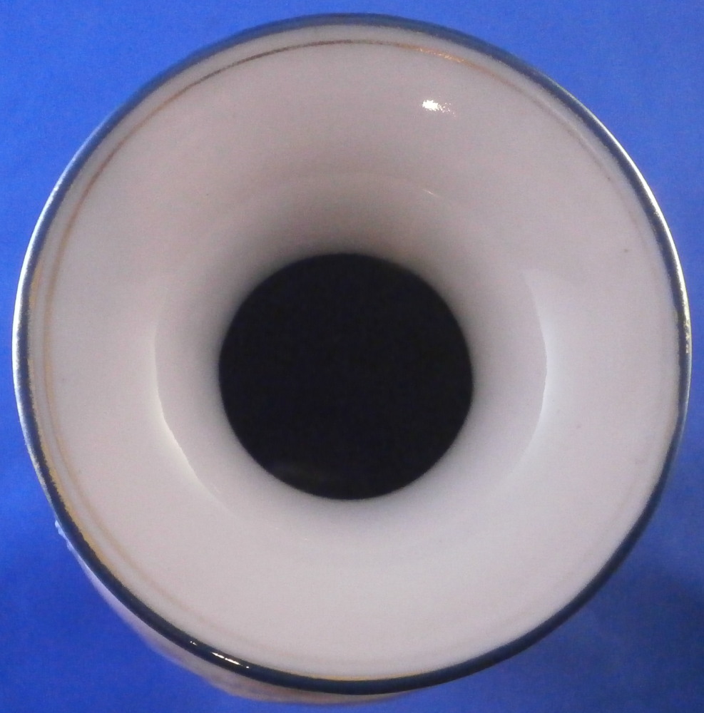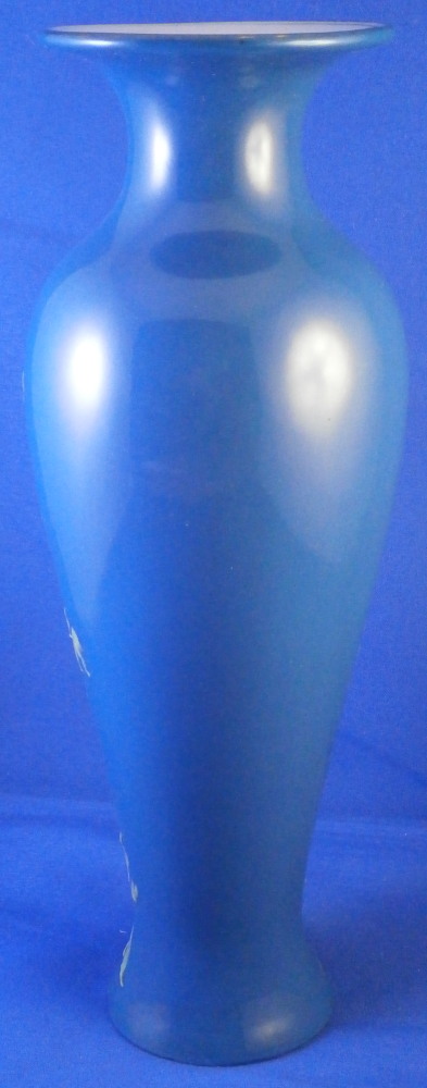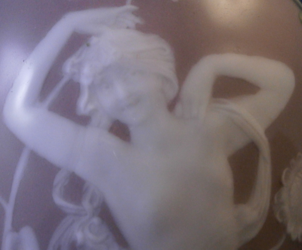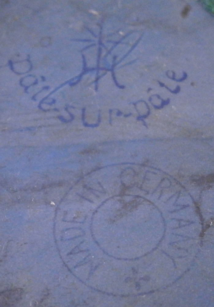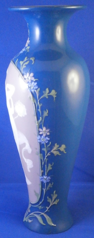 This isa superb vase made by Heubach in Germany in the late 19th century. A superb Art Nouveau period piece that is decorated by the famous and sought after Pate-sur-Pate technique. These were hard to make as the raised design was slowly done by adding layer after layer having to be fired in between each of them. That made for a wonderfully translucent design that had more of a three dimensional look than regular porcelain paintings. Often made by them for the Maerican market and thus marked in English underneath. This vase here is deocrated with a semi nide lady in the traditional white on a pink background. She has her breasts exposed while a cloth is covering her mid section. Nice flowers by her side. What makes this piece a bit more special than most is the instead of the gold trim surrounding the scene here we have flowers in the pate sur pate technique in green, pnk and blue. Quite unusual and it looks stunning! The rest of the vase has a greenish blue ground color to it with a bit of gold trim to the top. The vase is marked underneath with the blue HI mark with the star above it, pate-sur-pate under is and Made in Germany in a circle as shown. The vase is about 9.5 inches tall and 3.5 inches in diameter at the widest part. It is in superb condition with wear to the gold trim along the top edge and a dip in the edge of the bottom rim from when it was made. All glazed over and hard to spot when on display. A really nice looking piece! Please email me for more information or photos.
