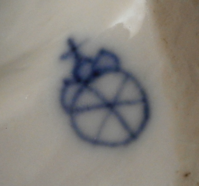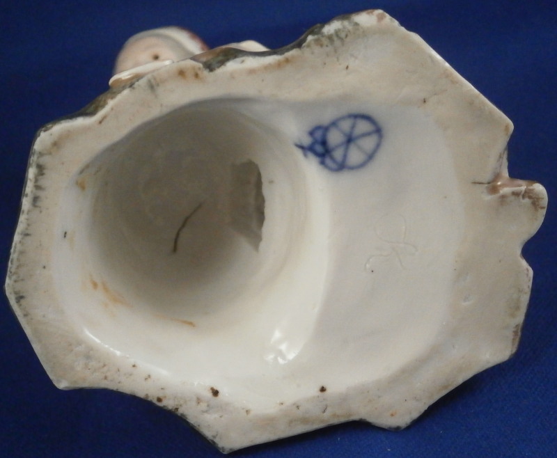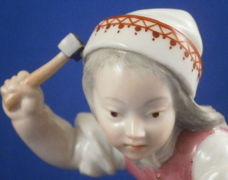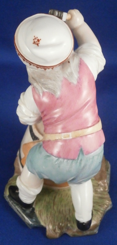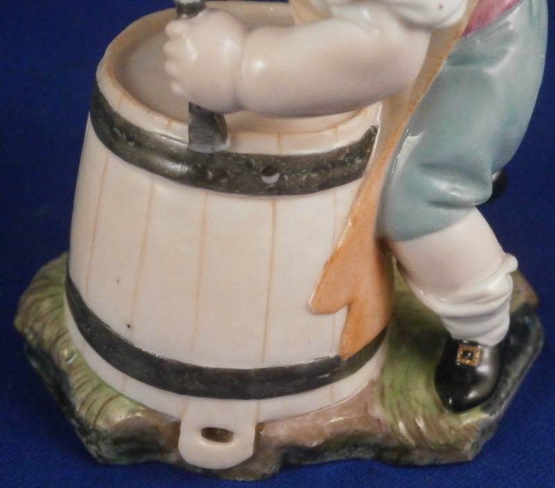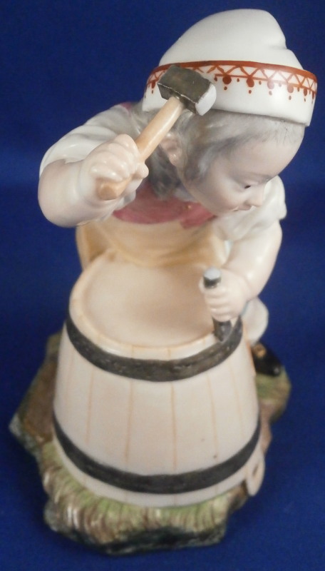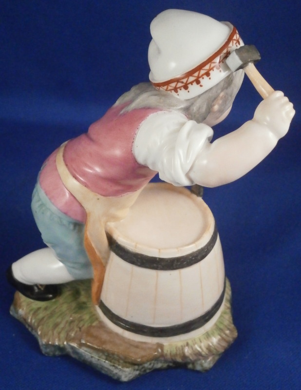This is a figurine made by Höchst in the 18th century. A very well modeled figurine of a great topic and quite the typical decoration for Hoechst around this time. I also own this model made by Fürstenberg - a comon thing in the 18th century as workmen travelled between maers or they jsut flat out copied each other - no copyright protection back then :) The gentleman is superbly dressed and working on a bucket or tub of some sort with his hammer and chisel while standing on a nice base. The figure is 4 inches tall, 3 inches wide and 2.625 inches deep. It is marked underneath with the under glaze blue wheel mark with the crown above it as well as an incised letter A or soemthing along those lines. The piece is in perfect condition. Please email me for more information or other pictures.