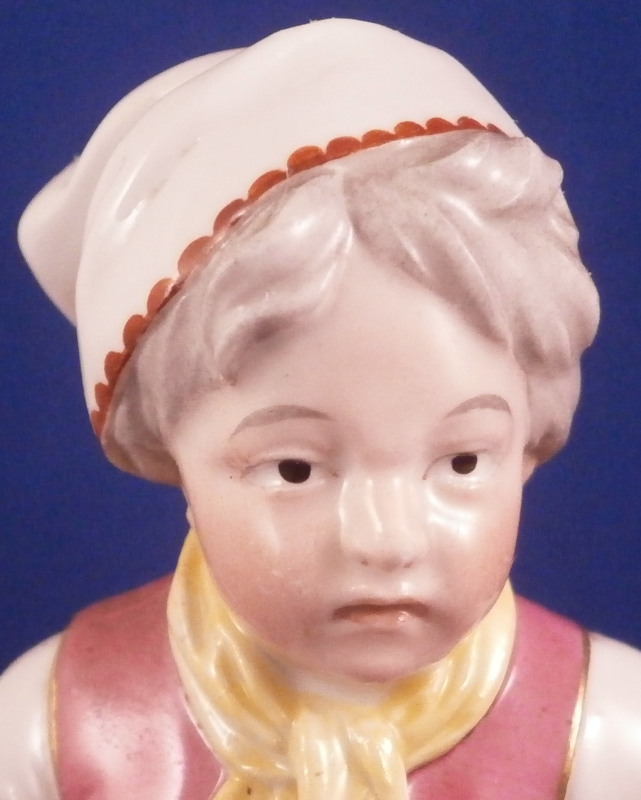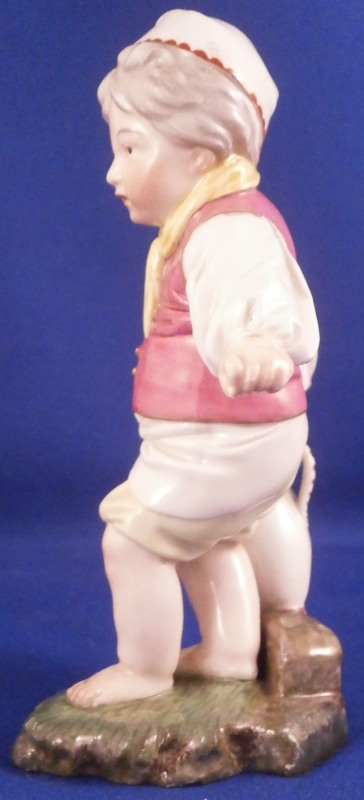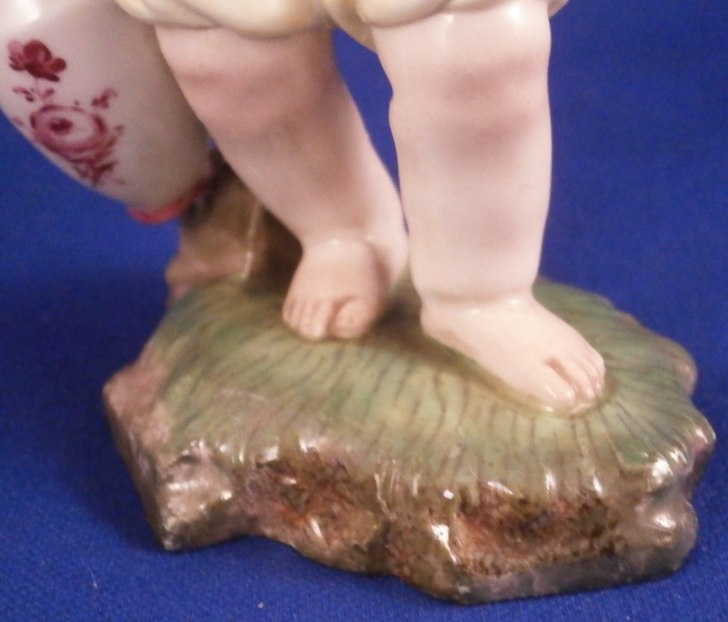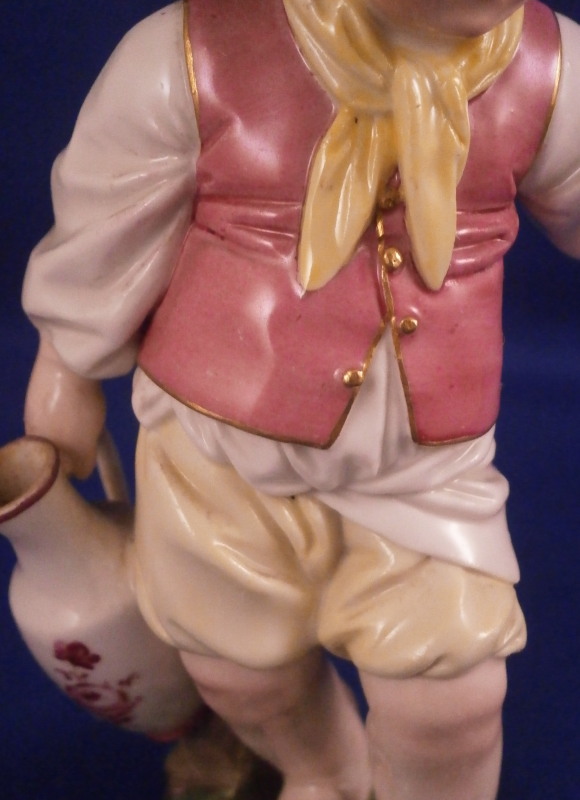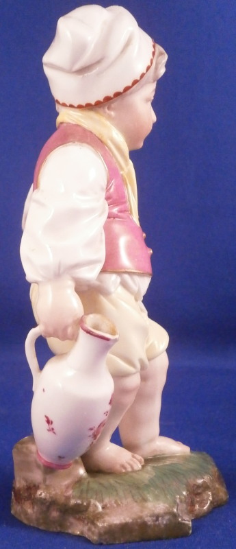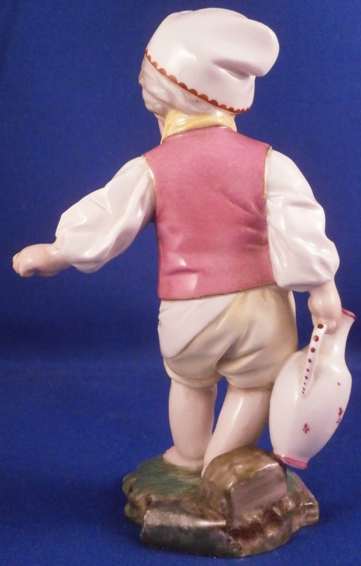 This is a figurine made by Höchst in the 18th century. It is of a young gentleman or boy holding a pitcher in his right hand. The boy is nicely dressed in the typical fashion for this maker and the pitcher has a bit of a flower decoration to it. Typical rockwork and grass base to the figure. A superb piece and in perfect condition except for a tiny chip tot he spout of the pitcher. He was modeled by Melchior one of the best artists in porcelain of the 18th century! The piece is very well done in terms of modeling and hand painted to perfection! The figure is about 4.625 inches tall, 3 inches wide and 2 inches deep. Marked underneath with the blue wheel mark as well as some incised marks that are impossible to make out as shown. Please email me for more information or other pictures.
