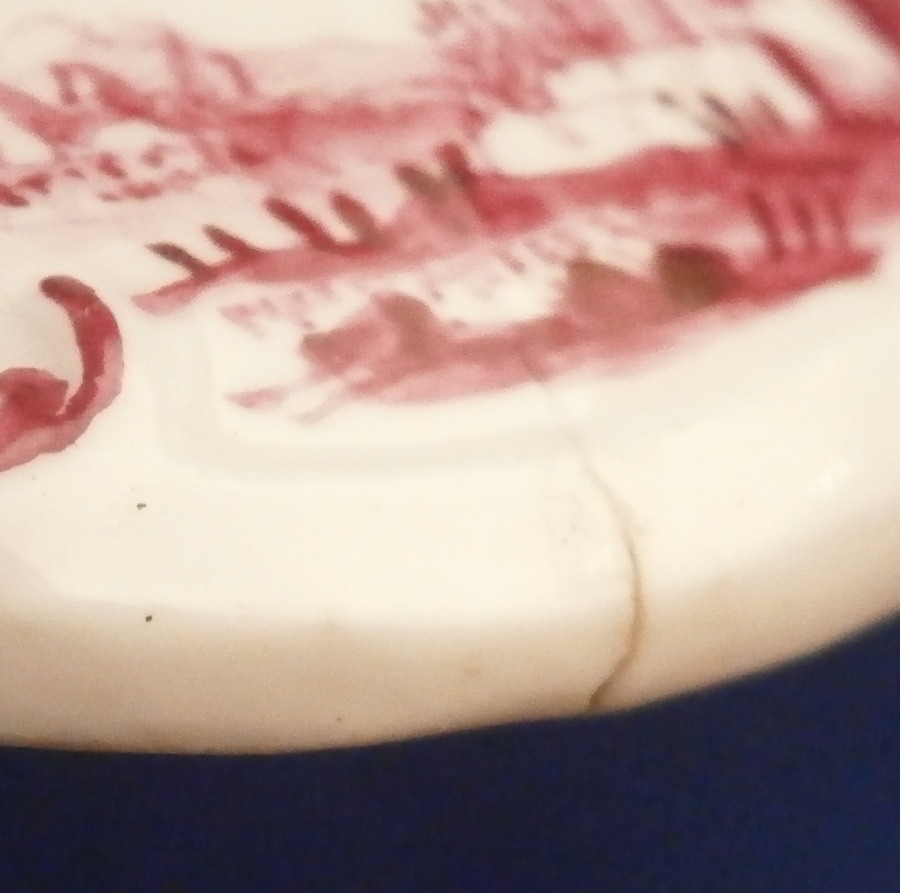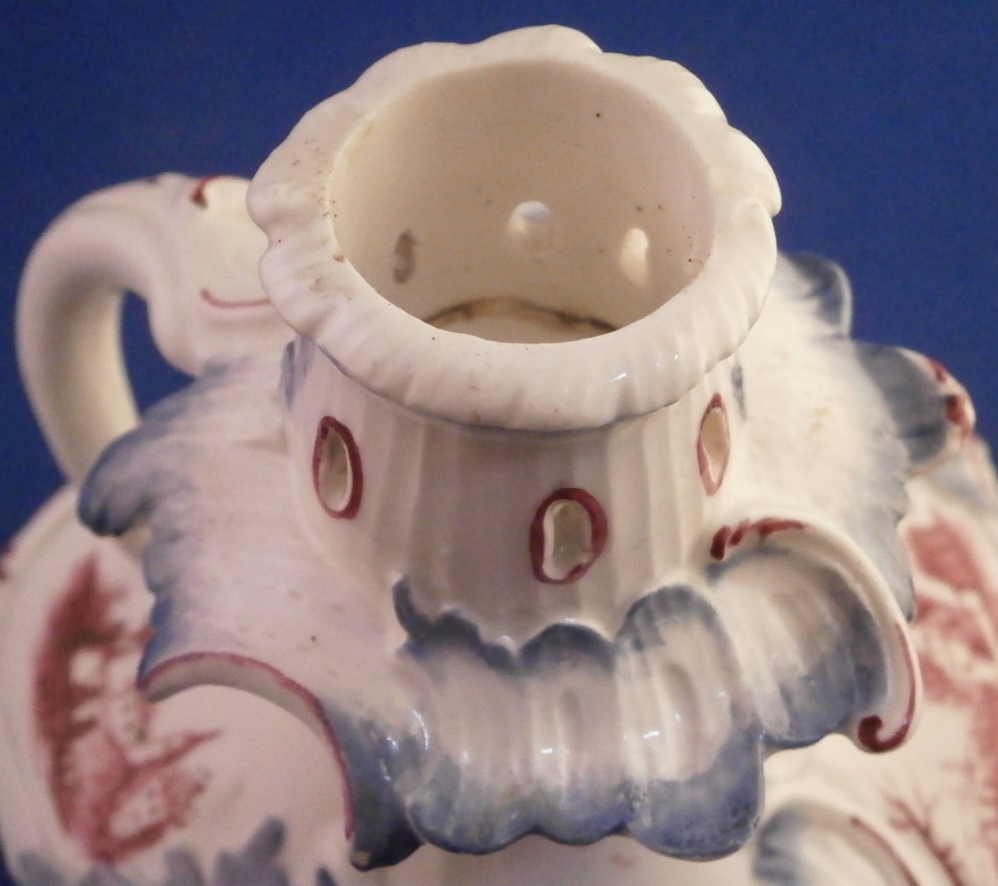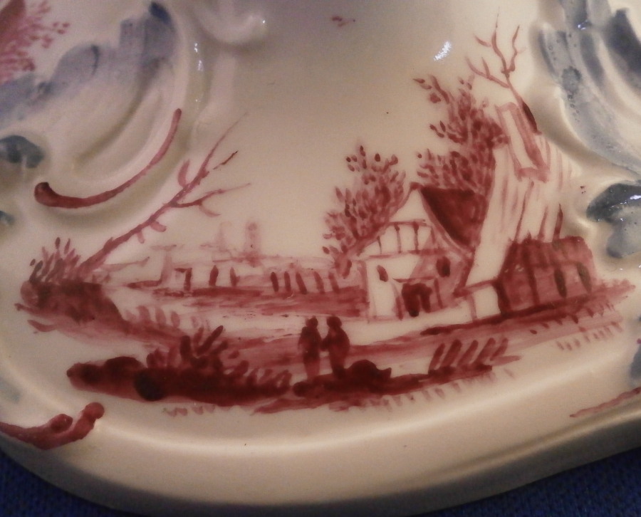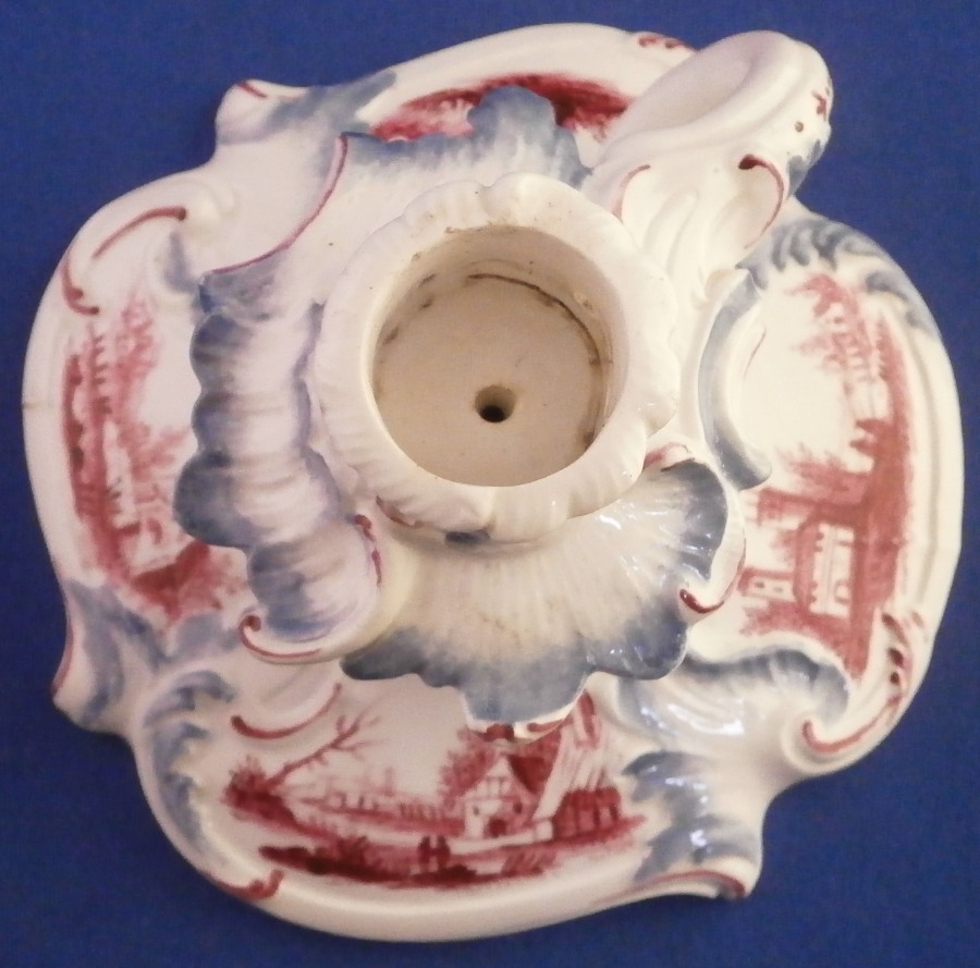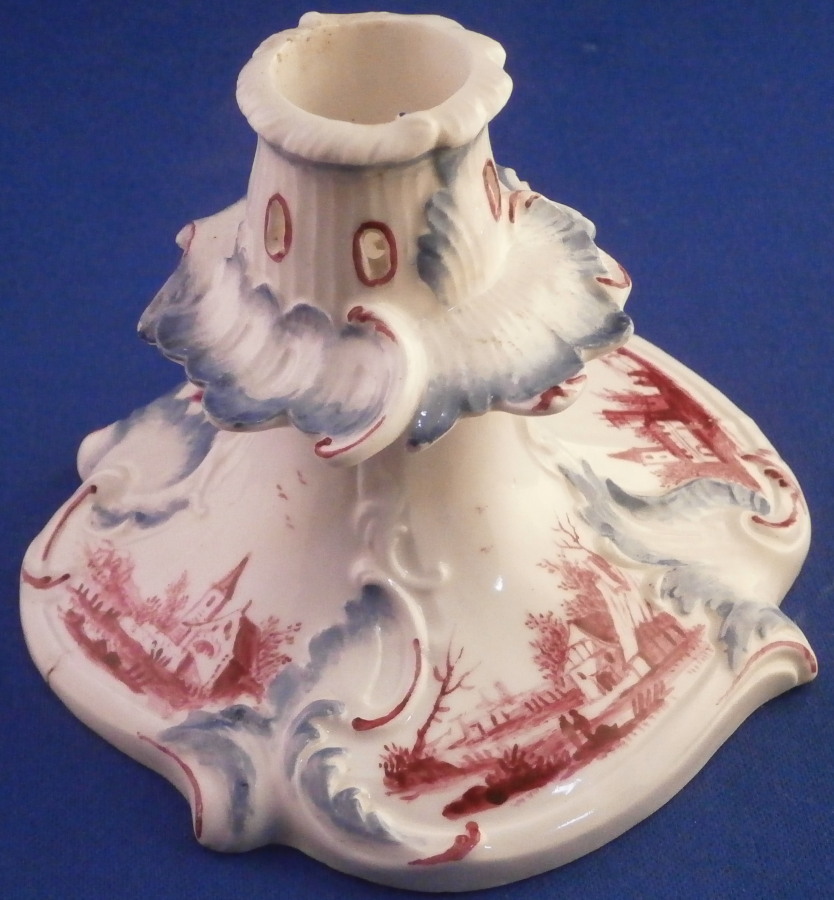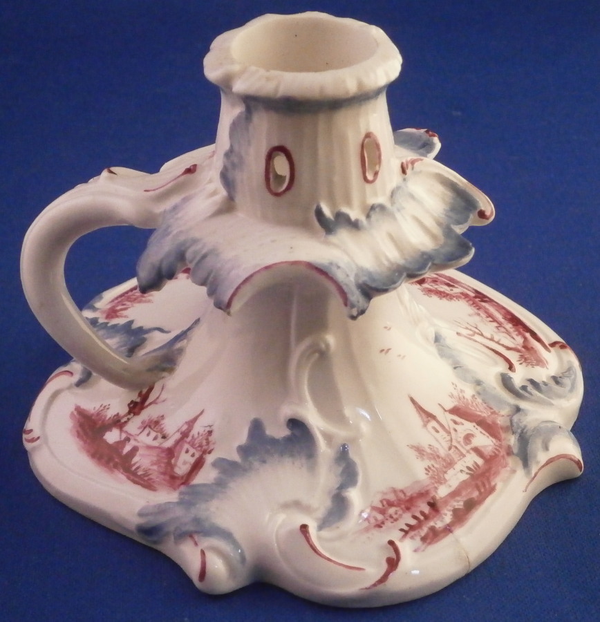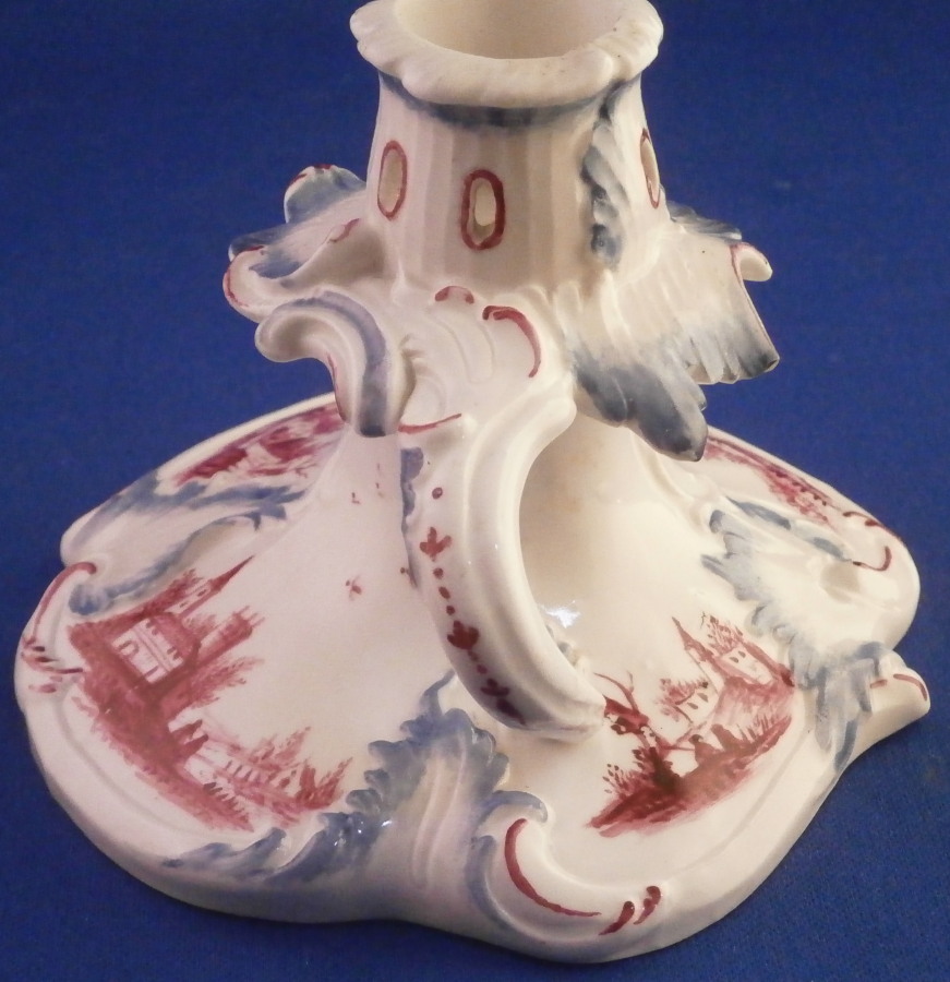 This is a really nice chamberstick made by Hoechst in the 18th century. It is superbly modeled and is hand painted with four puce scenes around the base and some nice puce and blue trim. Not a common piece at all though they also made this piece when the company got resurrected in the 20th century for while. The 18th century pieces are always far superior to the more modern pieces! The candleholder is marked with the under glaze blue wheel mark under a crown as shown as well as the incised letters H I. It is in great condition with a firing crack to the bottom edge as shown which does not take away from the piece and one underside edge chip to the scrolls under the drip catcherthough part of that is painted over so likely from when it was made! The candlestick is 3.125 inches tall and about 4.5 inches in diameter. Please email me for more information or other pictures.