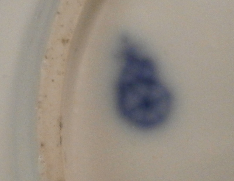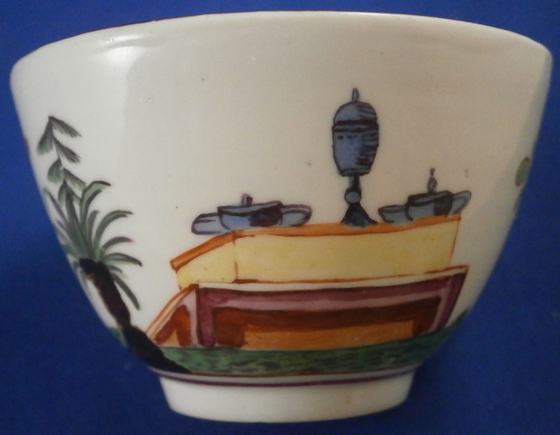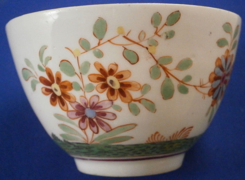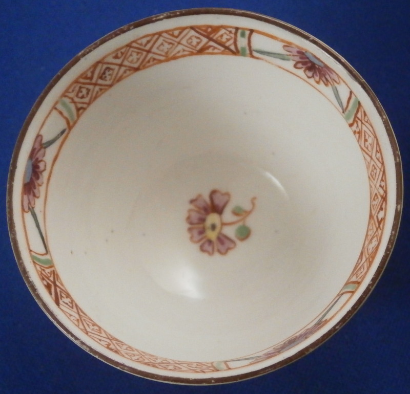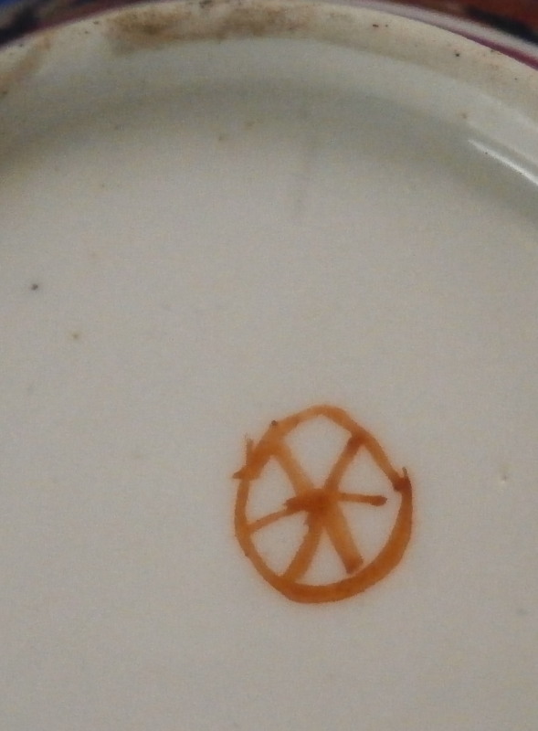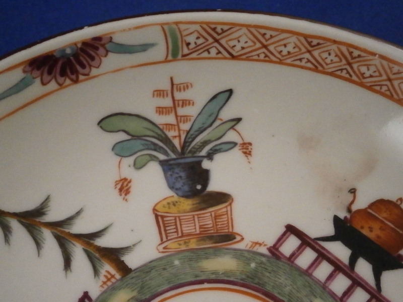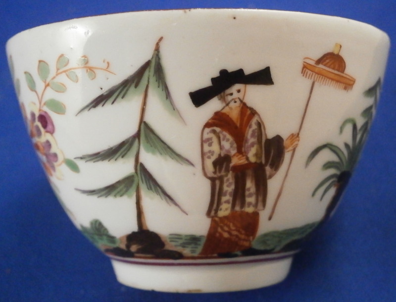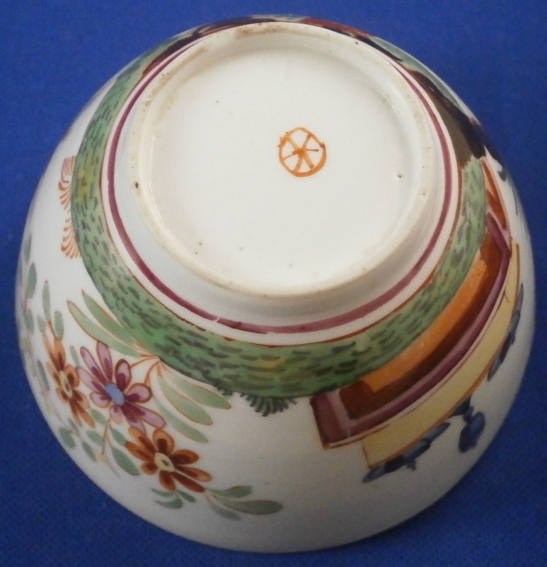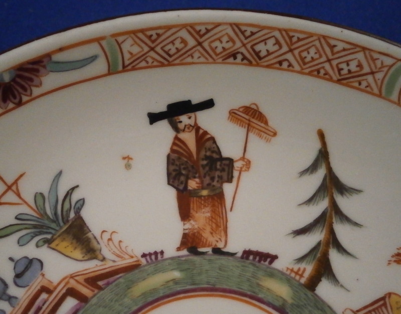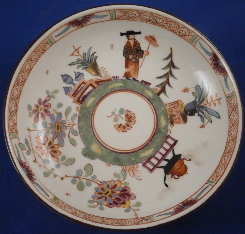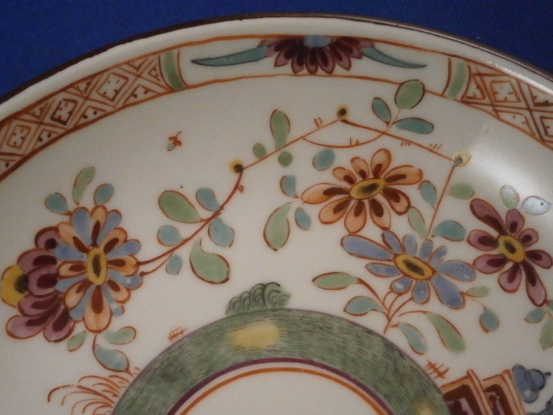 This is a superb cup ( teabowl or Koeppchen style) and saucer made by Hoechst in the 18th century - in about 1760. Both pieces are hand painted with an outstanding Chinoiserie design including an Oriental gentleman (looking rather similar to Meissen Hoeroldt figures) as well as plants, vases and even a teapot on a platform. An Indian Kakiemon flower is included as well and the rim has a nice trim to it with a brown edge. I had not seens this before but my books had an example included. The set is in superb condition with some very minor wear. The cup is marked underneath with an over glaze red wheel mark as well as some sort of impressed mark while the saucer has the under glaze blue wheel amrk with a crown over it and some different impressed marks as shown. The examples in my book had the same different marks which is fine since they overlapped from 1756 until 1765 so that helps date the pieces nicely. The cup is 1.625 inches tall and 2.625 inches in diameter. The saucer is 1.125 inch tall and 4.875 inches in diameter. One of the nicest set I ahve seen by this maker! Please email me for more information or other pictures.