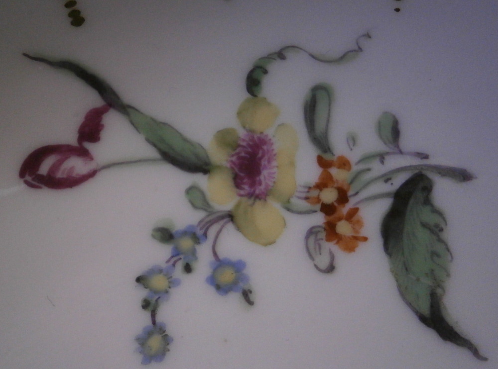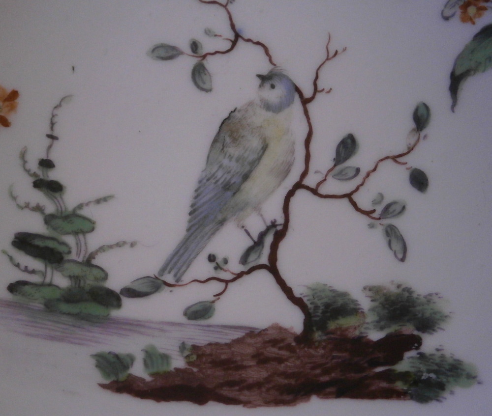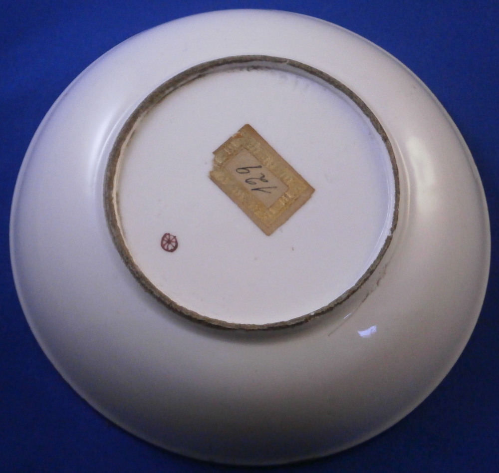 This is a really ncie and early saucer made by Hoechst in the 18th century. It is marked with the colored wheel mark which means it was made before 1765 as well as an incised 2H as shown. The saucer is superbly hand painted with a nice bird scene in the center including the bird sitting on a branch in a landscape surrounding. Small floral arrangement to one side and three small single flowers to the other plus this really nice puce and gold trim to the rim. It's a gorgeous piece that is in superb condition with just some firing lfaws mainly to the udnerside from when it was made. As nice as they come! The piece is 1.125 inches tall and 5.125 inches in diameter. Please email me for more information or other pictures.