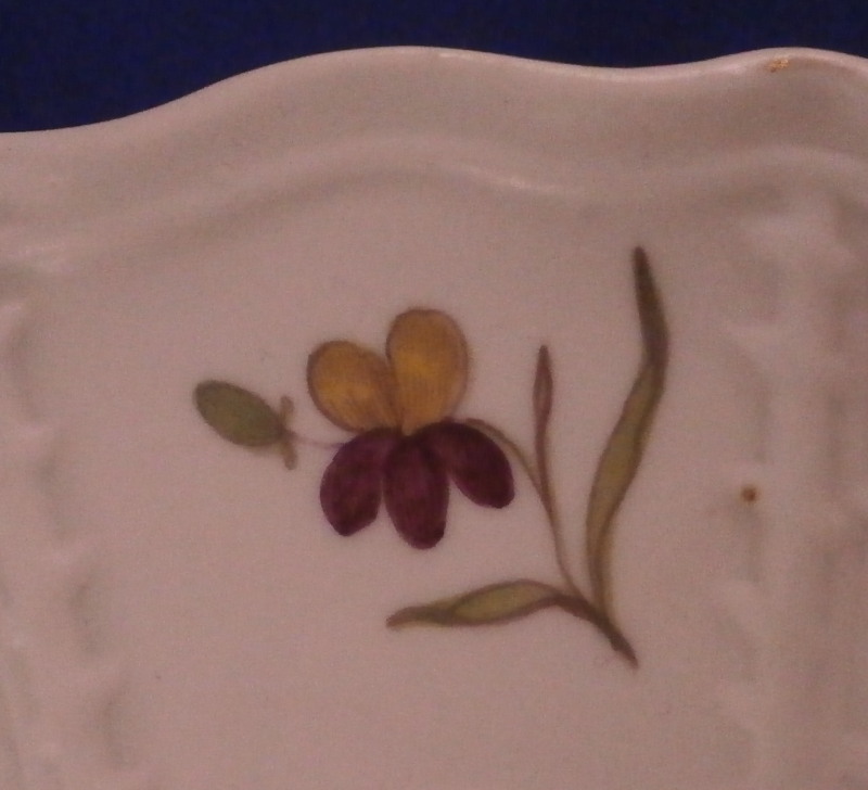 This is a superb and very early plate made by Hoechst around 1760. It is hand painted with a nice floral arrangement in the center in their typical very early style and has some smaller flowers on the rim as well as some tiny single leaves and a flower blossom to cover up small firing flaws. Nice relief decoration to the rim as well and a gold trim to the edge which is mostly worn away. The plate is in good condition with the already mentioned wear to the gilding as well as a flat rim chip that does not take away from the piece at all. It displays perfectly! The plate is 1.5 inches tall so fairly deep and likely a soup plate and has a diameter of 9.875 inches. It is marked underneath with the red wheel mark as well as an incised letter C with a number 5 (I think) behind it. Please email me for more information or other pictures.