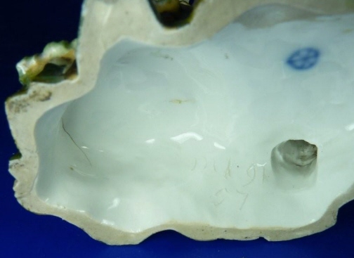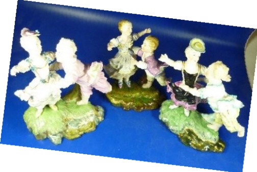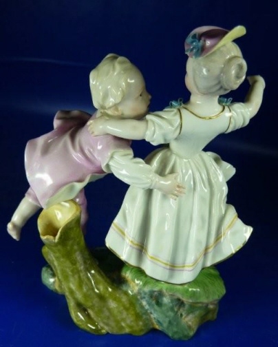 This is a figurine made by Hoechst in about 1785. This is the original figurine the Bock Wallendorf and Samson piece I ahve on this site are based on. It is very nice for comparison purposes that I have these three pieces by different makers so you guys can see the difference. Will try to get the Damm piece as well and maybe a Passau version then we have them all to compare :) This figurine is of a boy and girl playing catch. A nicely modelled and painted piece originally designed by Melchior. The figure is 5.875 inches tall, 4.75 inches wide and just under 4 inches deep. It is in superb condition with an amateurish repair to her right index finger. The figure is marked underneath with an underglaze blue wheel mark as well as some incised letters and numbers. The last picture is of all three figurines together. Please email me for more information or other pictures.