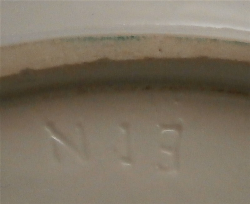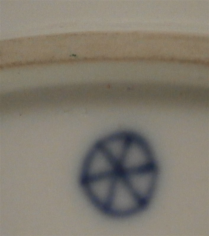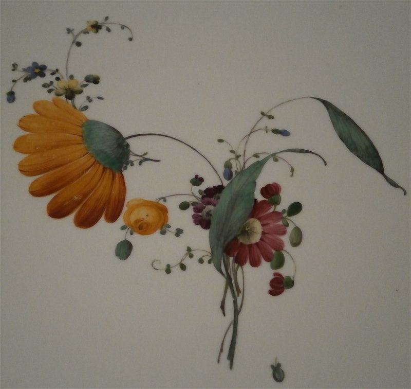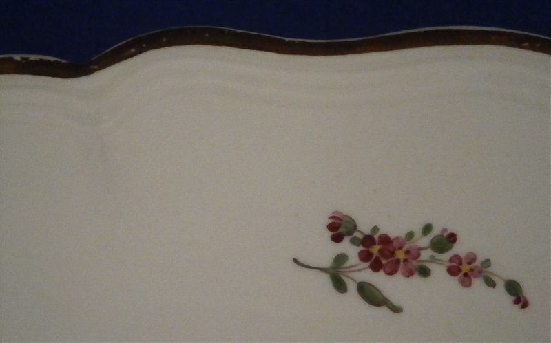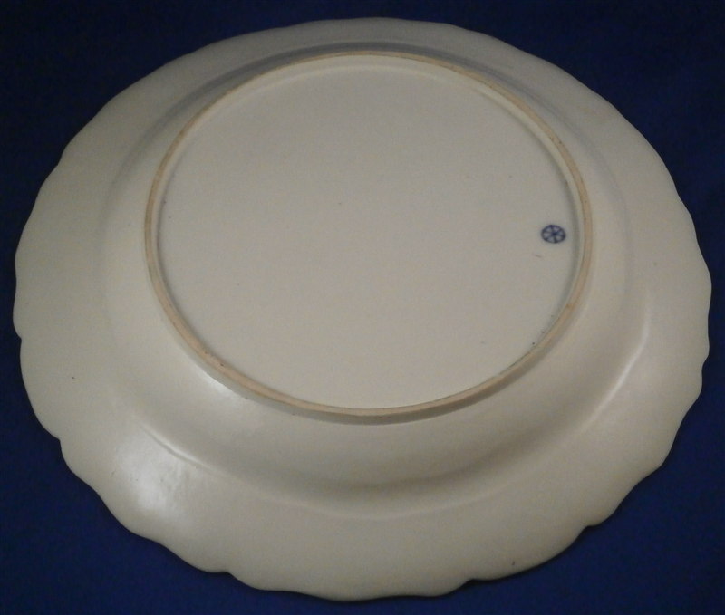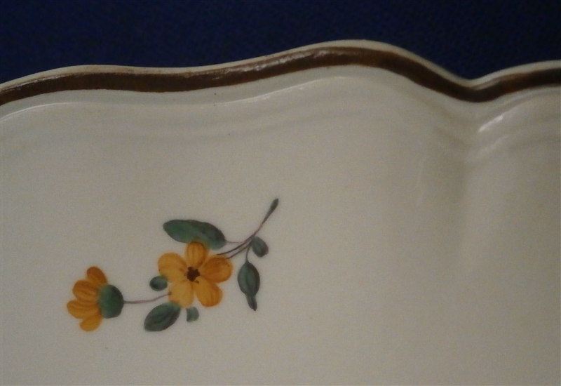 This is a nice plate made by Hoechst in the 18th century. It is hand painted with a nice floral arrangement in the center as well as a smaller flower and two leaves in the center and four more smaller flowers along the rim. The edge has a nice wavy shape to it with a relief design to the porcelain itself anda brown trim. The plate is in superb condition with some very minimal wear but about as good as one could find. It is marked underneath with the under glaze blue wheel mark as well as the impressed letter E I N as shown. The plate is 1.25 inches tall and 9.625 inches in diameter. Please email me for more information or other pictures.