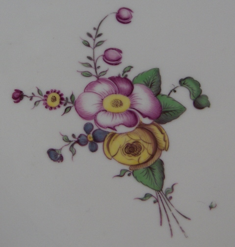 This is a nice plate made by Hoechst around 1760. The plate is handpainted with some superb flowers in their typical style of the early period. It is marked with the red wheel mark and an impressed 2. It is in great condition with just a bit of wear to the brown trim on the edge and a firing crack to the footring which doesn't affect the rest of the plate. The plate is 1.125 inches tall and 10 inches in diameter so a nice size! Please email me for more information or other pictures.
