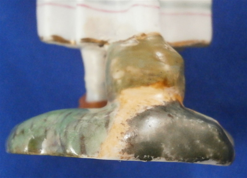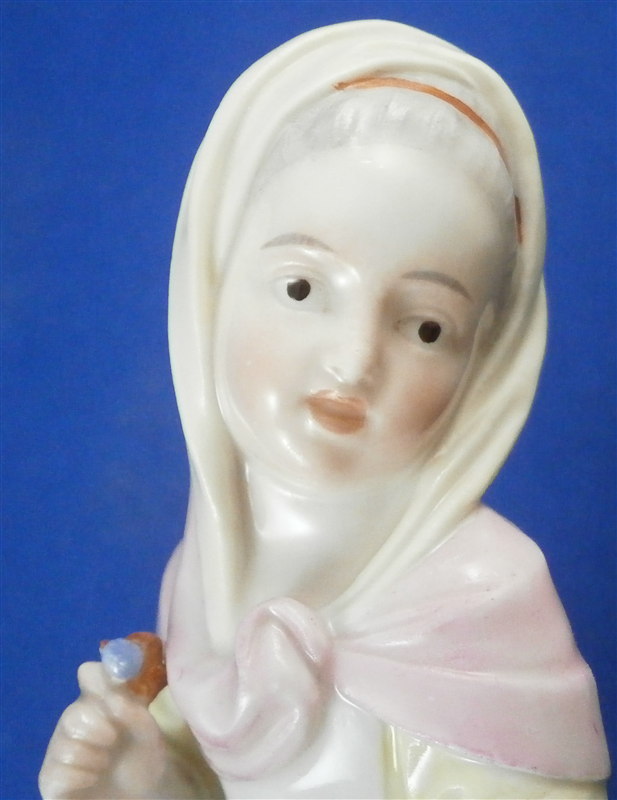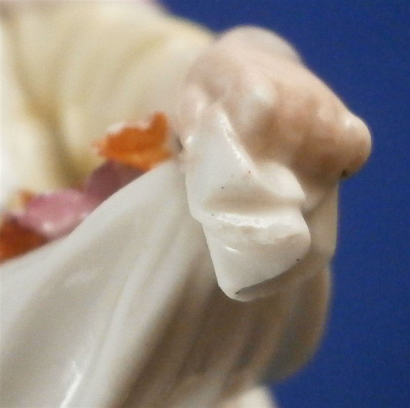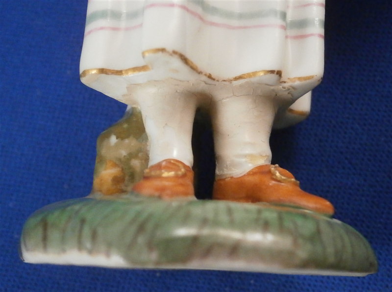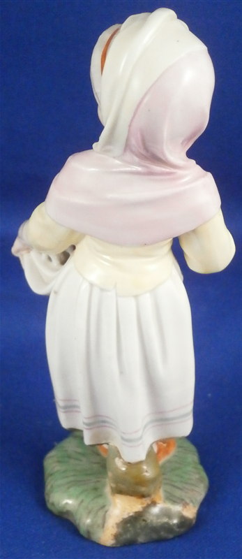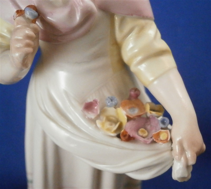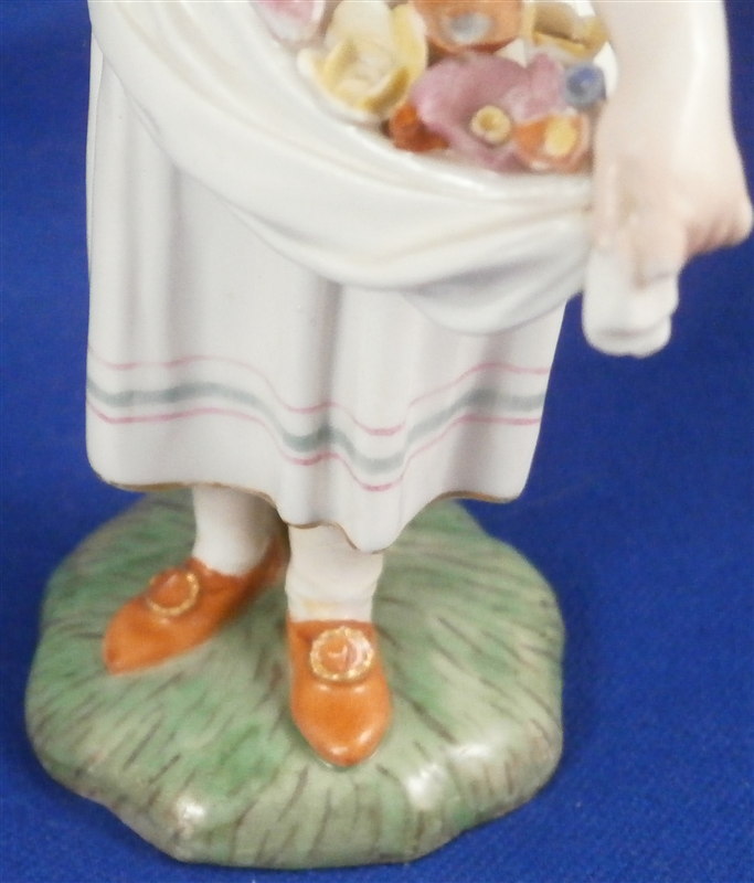 This is a figurine made by Höchst in the 18th century. It is of a young lady that is holding a some flowers in her apron as well as in her hand. She is well dressed and is standing on a typical grass base with a little tree stump in the back. A fun piece and very typical for this maker! She was modeled by Melchior one of the best artists in porcelain of the 18th century! The figure is about 4.5 inches tall, 1.625 inches wide and 1.625 inches deep. Marked underneath with the blue wheel mark that is a bit hard to see as well as some incised numbers and letters that one occasionally finds on their pieces. The figurine displays perfectly but she was broken off the base at some point and restored - something I didn't notice until I took the pictures - must be getting old :( Otherwise she is in great shape with a bit of damage to those delicate flower petals. Please email me for more information or other pictures.
