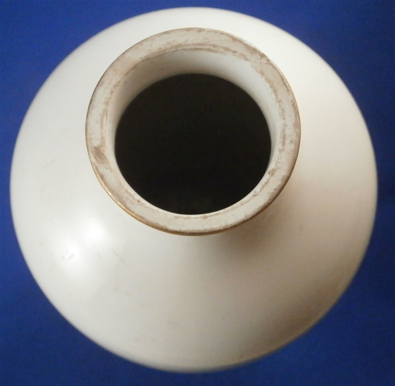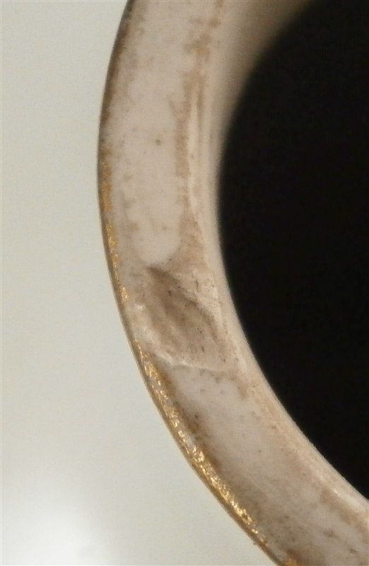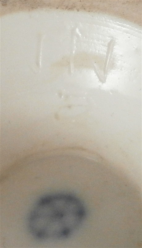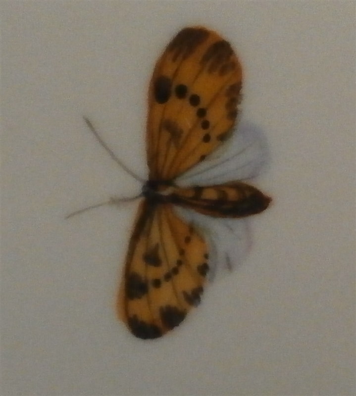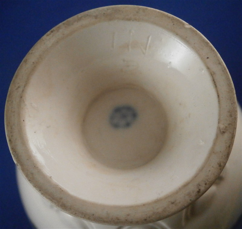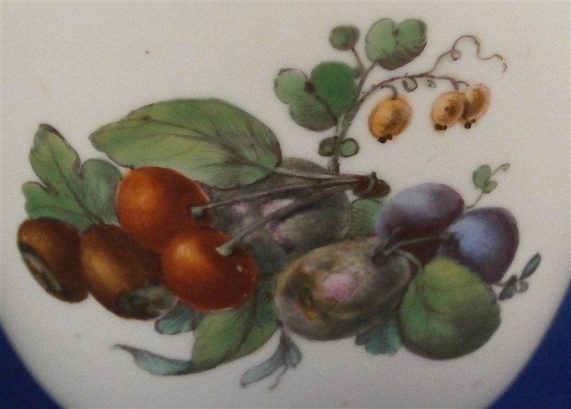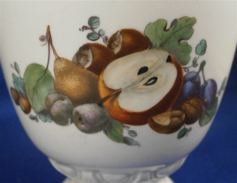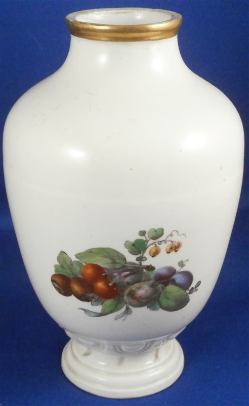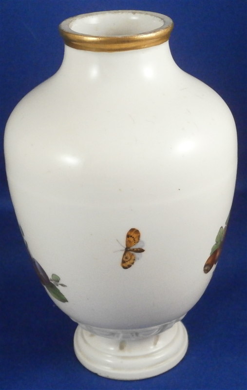 This is a great vase made by Hoechst in the 18th century. It is hand painted with a fruit scene to the front and the back with a butterfly to each side and a gold trim to the top edge. Nice design to the porcelain of the foot as shown. It's a pretty early piece and the scenes are of superb quality! The vase is in superb condition with one tiny chip to the very top as shown and a few marks to the glaze from use. It is marked underneath with an underglaze blue wheel mark as well as some incised letters as shown. The piece is 4.75 inches tall and 3 inches in diameter. Please email me for more information or other pictures.