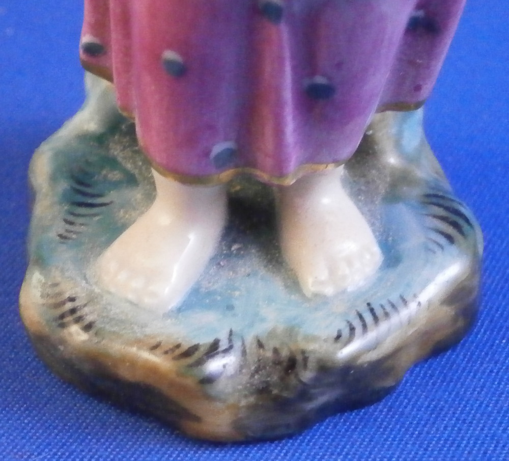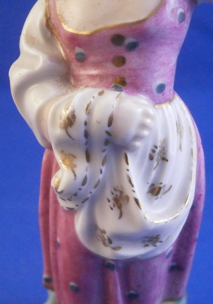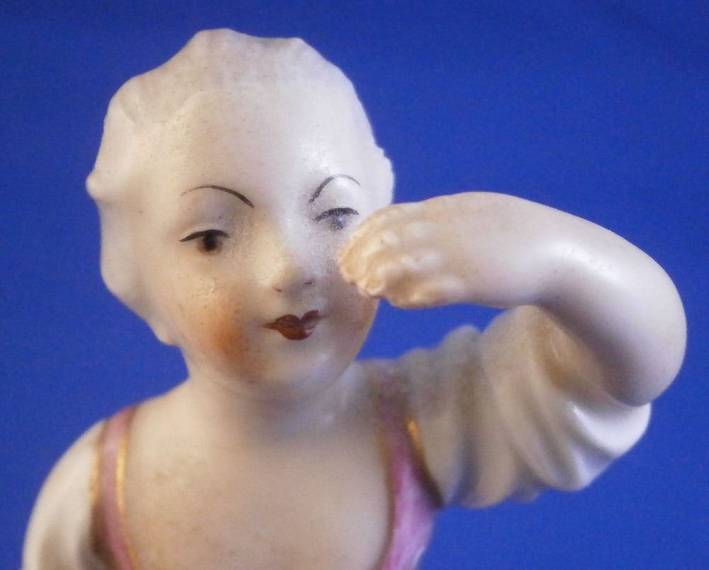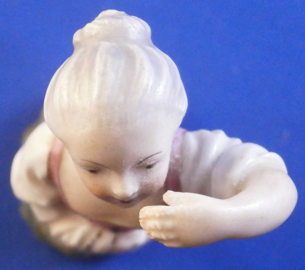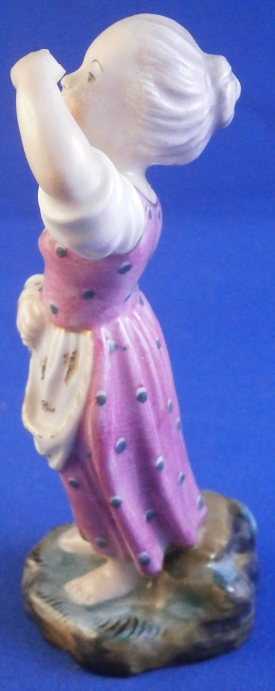 This is a figurine made by Höchst in the 18th century. It is of a girl or young lady with her apron wrapped around her right arm and the left arm raised over her eyes as if looking into the distance in the bright sunlight. She is nicely dressed and is standing on a typical grass base with some rocks in the back. A fun piece and very typical for this maker! She was modeled by Melchior one of the best artists in porcelain of the 18th century! The figure is about 3.625 inches tall, 1.375 inches wide and 1.5 inches deep. Marked underneath with the blue wheel mark as well as some incised letters that one often finds on their pieces. The figurine is in great condition. No issues except a bunch of dust which I didn't realize until after I took the pics. Please email me for more information or other pictures.