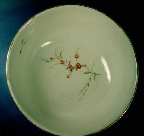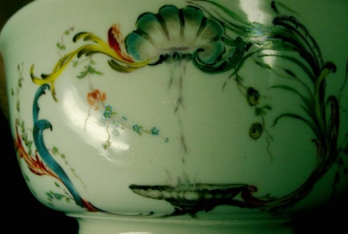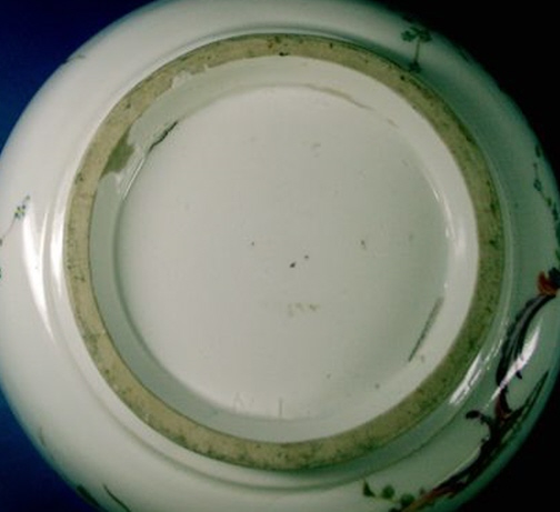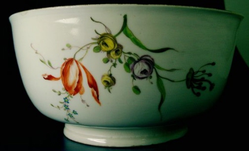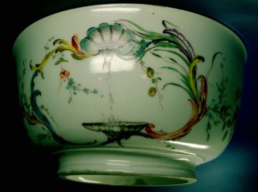 This is a slop bowl made by Hoechst in about 1760. It is handpainted with a colorful cartouch on one side and a nice flower arrangment on the other. Inside bottom has a flower painted as well. The bowl is in great condition with two firing cracks underneath and some wear to the gold trim. It is only marked with the impressed letters IN. The bowl is about 7.125 inches in diameter and 3.5 inches tall. I also have a letter from Dr. Reber the well known expert on Hoechst porcelain to show this to be made by Hoechst. Please email me for more information or other pictures.