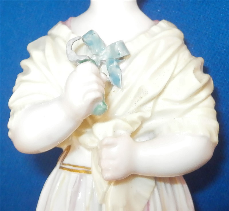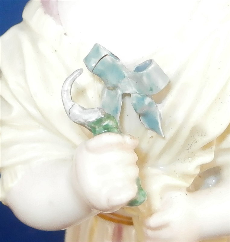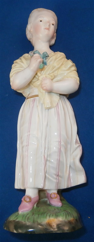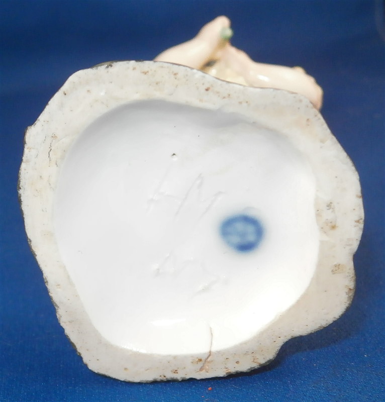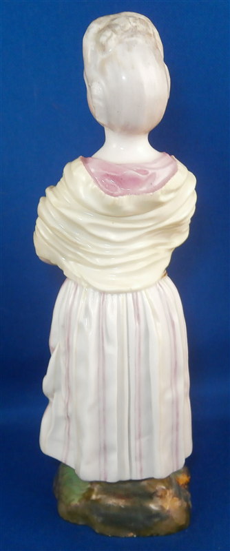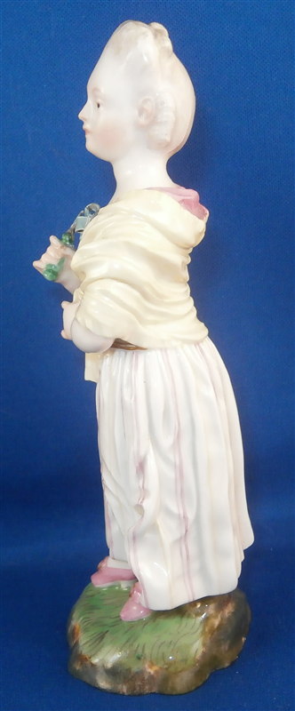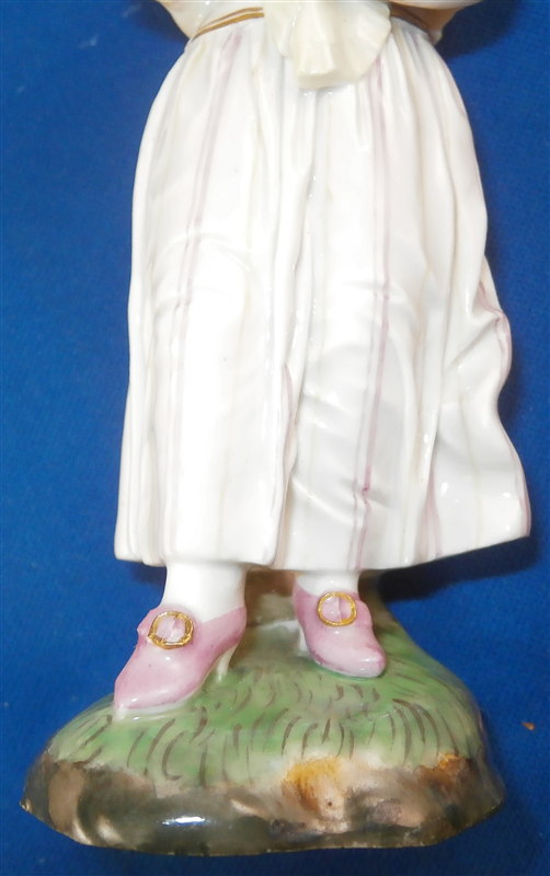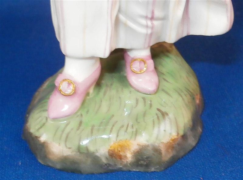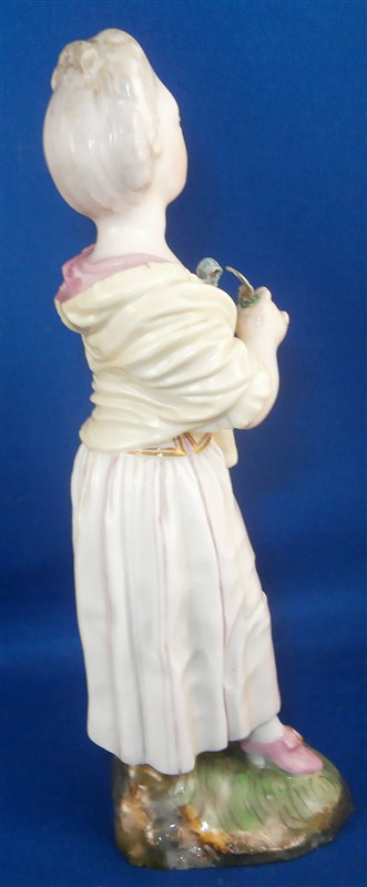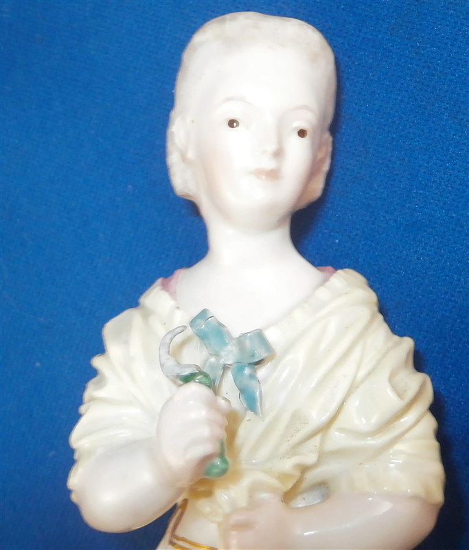 This is a cute figurine made by Höchst in the 18th century. It is of a lady that is nicely dressed standing on a typical rock and grass base and holding a sickle in her hand. A stunning piece and very typical for this maker! She was modeled by Melchior one of the best artists in porcelain of the 18th century! The piece is modeled superbly and handpainted to perfection! The figurine is about 5.25 inches tall, 1.75 inches wide and 1.5 inches deep. Marked underneath with the blue wheel mark as well as some incised marks as shown. The figurine is in great condition with restorations to the top part of the sickle as well as one loop of the bow. Please email me for more information or other pictures.