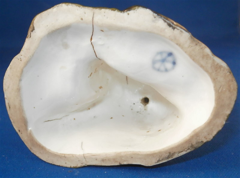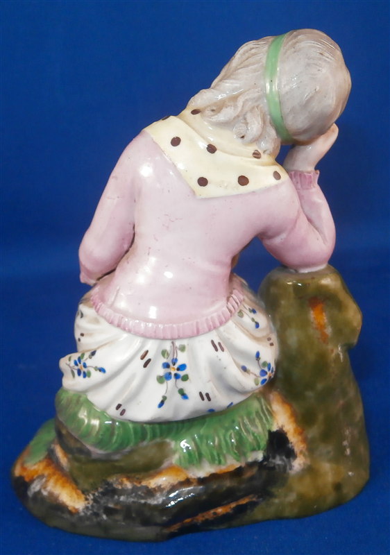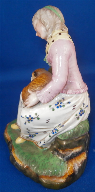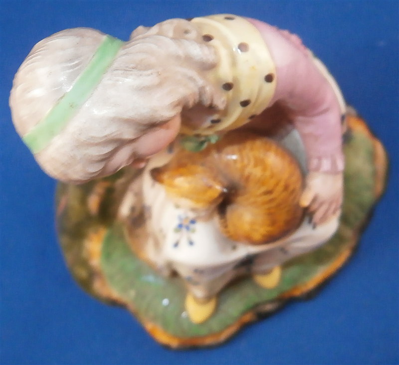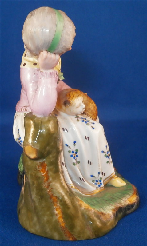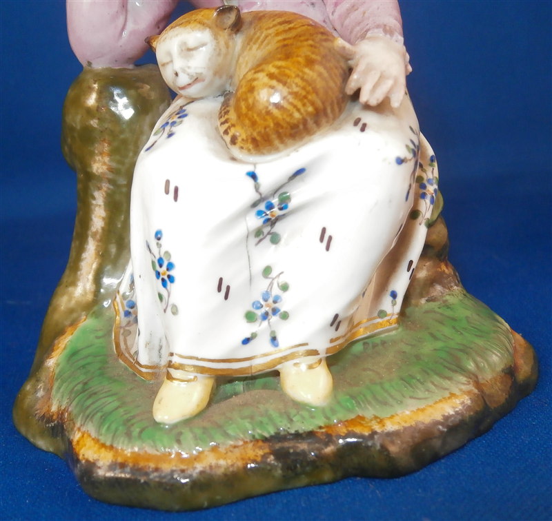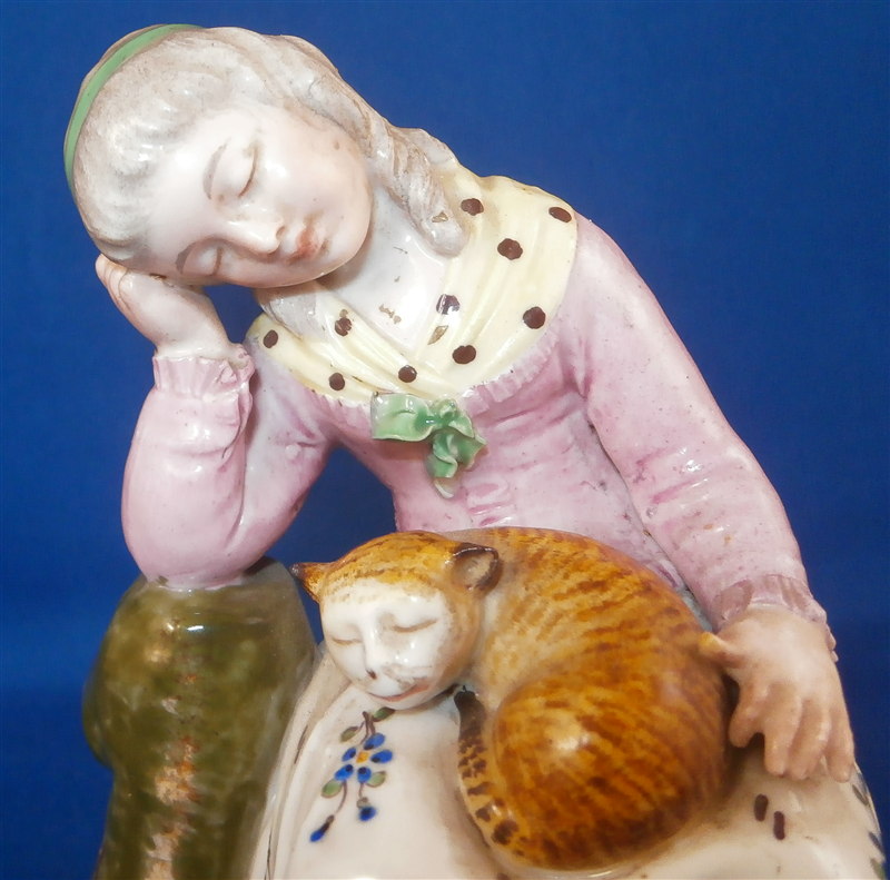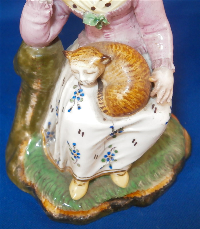 This is a figurine made by Höchst in the 18th century. It is of a lady who is resting with her cat, that is napping as well, on her lap. She is sitting on a typical rock base with her elbo on a tree stump. The piece is modelled superbly with her wearing a nice dress painted with blue flowers, a pink shirt with a yellow and black top collar and a bow in the center. Green band in her hair. One of the most fun single pieces I ahve seen in a long time and it fits in well with our house since we have a lazy car as well :) The figurine is about 3.75 inches tall, 3.375 inches wide and 2.375 inches deep. Marked underneath with the blue wheel mark as shown. The figurine is in perfect condition with a small firing crack in the center of her skirt that is no distracting and some firing lines on the underside as shown. The little green bow seems to be missing a piece but it was made that way or happened during firing and before painting. Please email me for more information or other pictures.