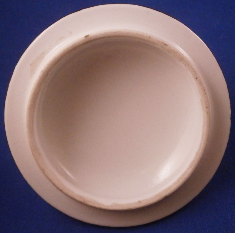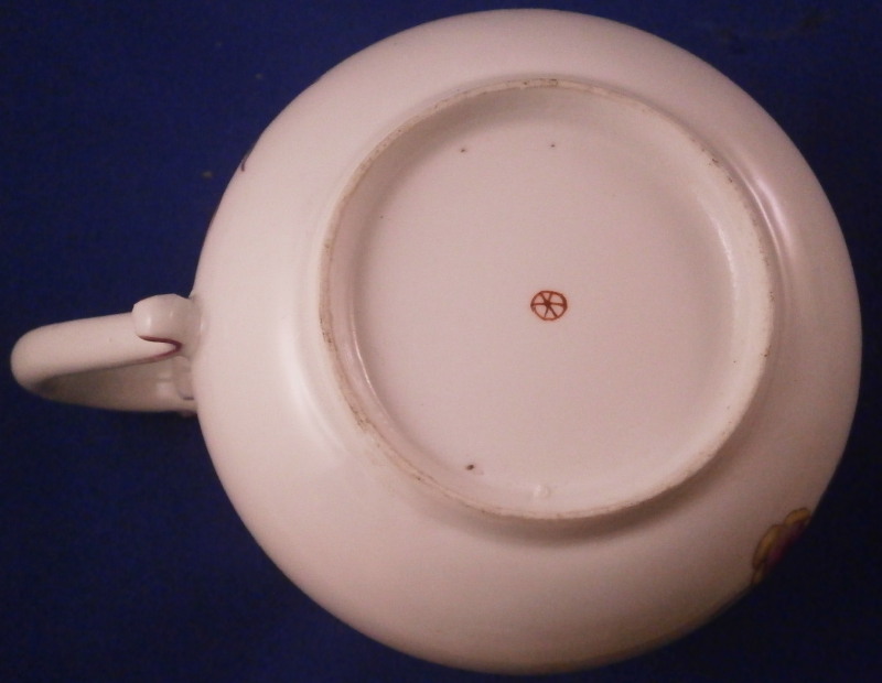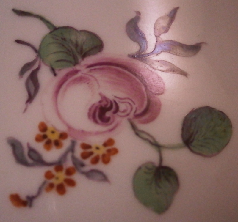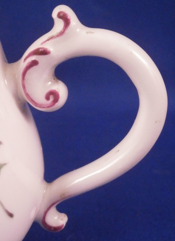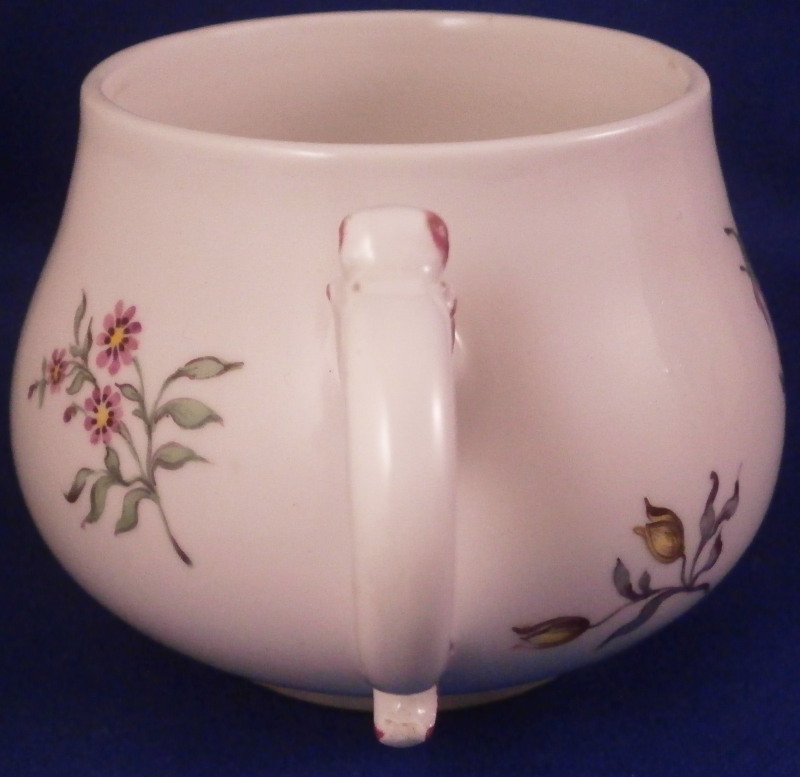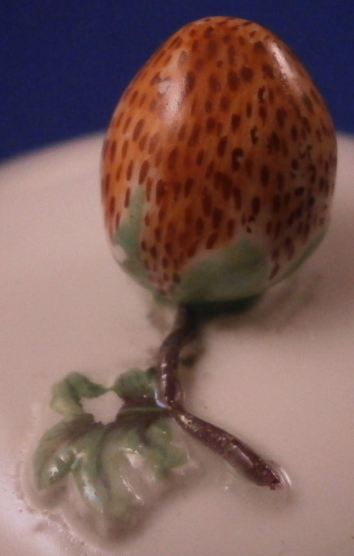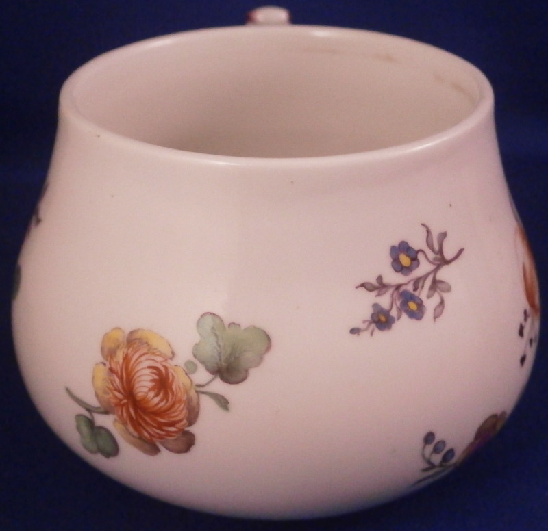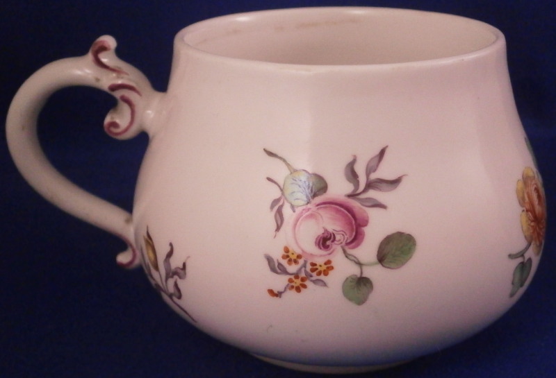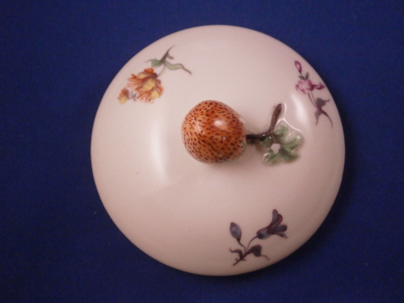 This is a pot de creme or pot au jus made by Hoechst during their early year in the 18th century. It is larger than any other pieces like it so it might just be some other sort of lidded cup. Either way it is a very nice early piece that is hand painted with lots of flowers scattered around the main body and three more to the lid, the nicely shaped handle has a puce trim to it and the lid a brown trim but my favorite part is that awesome strawberry finial. Looks amazing! The piece is in superb condition with no major issues just one spot of green paint flake to the leaf of the finial. The piece is 3.5 inches tall with a diameter of 3 inches and the handle sticks out another inch or so. It is marked underneath with the red wheel mark only used early on. Please email me for more information or other pictures.