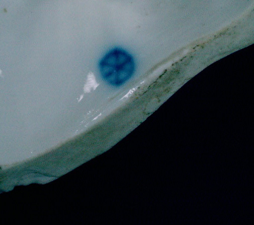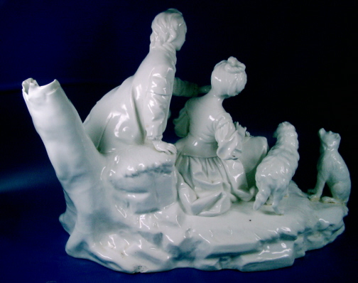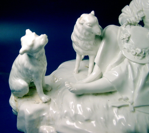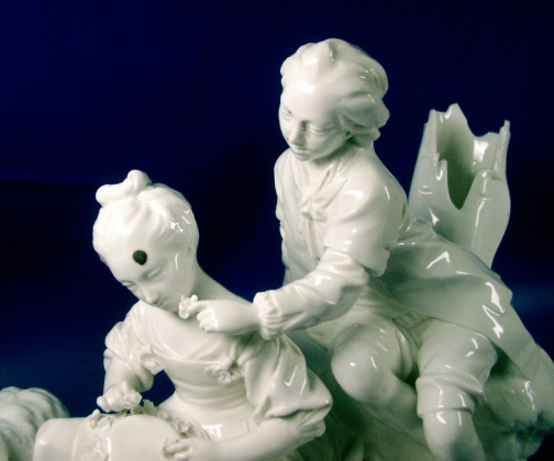 This is a large white figurine made by Hoechst in about 1770. It is called the adorned hat and was designed by Melchior. I also have the painted version on this site. The figure is of a man behind a lady holding a hat with a dog in front and a sheep besides them. Left in the white becasue of the large black firing mark on her head. The figure is in great condition with a the mentioned black spot on her head as well as a few smaller black spots, chip to the back base, one ear of the sheep is missing, the dog was off and was reglued but could be done better. The dog is missing a piece of his right back leg, a chip to the basket, his staff and chips to the tree. His pinky is half gone as well and there are a few small firing cracks. It is marked with the underglaze blue wheel mark as well as the incised letter S. The piece is about 7.125 inches tall, 10.25 inches wide and 5.5 inches deep. Please email me for more information or other pictures.