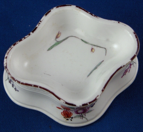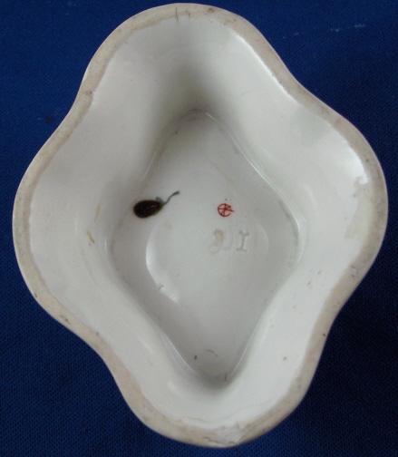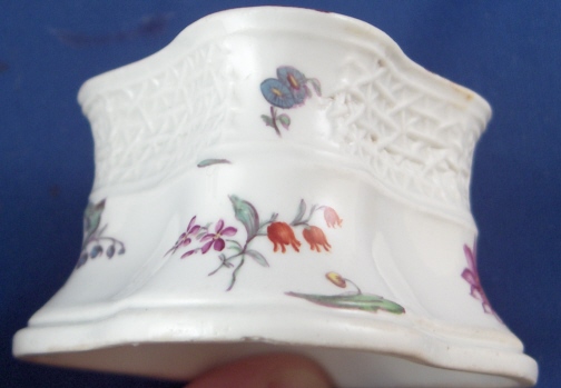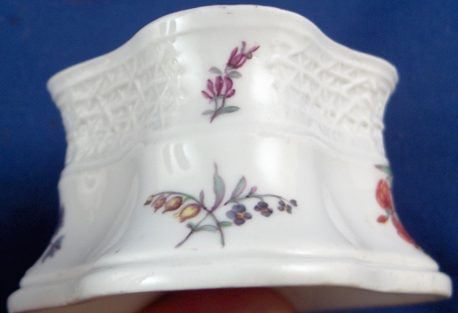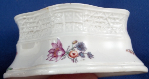 This is a rare open salt dish made by Hoechst during their early years in the 18th century around 1760. The piece has a superb shape with a nice relief apttern to the rim, a brown trim to the edge and lots of flowers / floral arrangements all around. Some elongated leaves with yellow flowers were painted on firing flaws - thin firing cracks mostly on the top inside. A big black firing spot on the underside was also converted into a leaf :) The salt is marked underneath with the red wheel mark as well as an impressed set of letters I and two other ones I cannot make out. The dish is in superb condition with wear to the brown trim on the rim and a small shallow rim chip to the underside footring. It is 1.5 inches tall, 3.5 inches wide and 2.75 inches deep. Please email me for more information or other pictures.