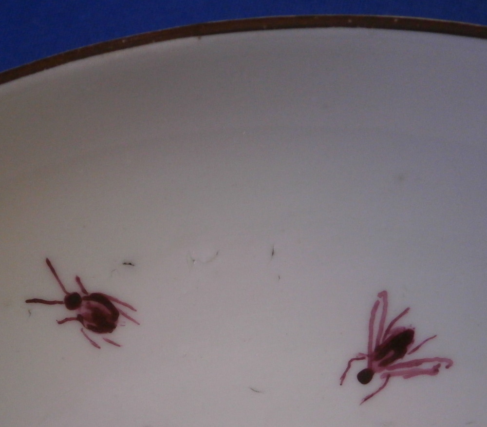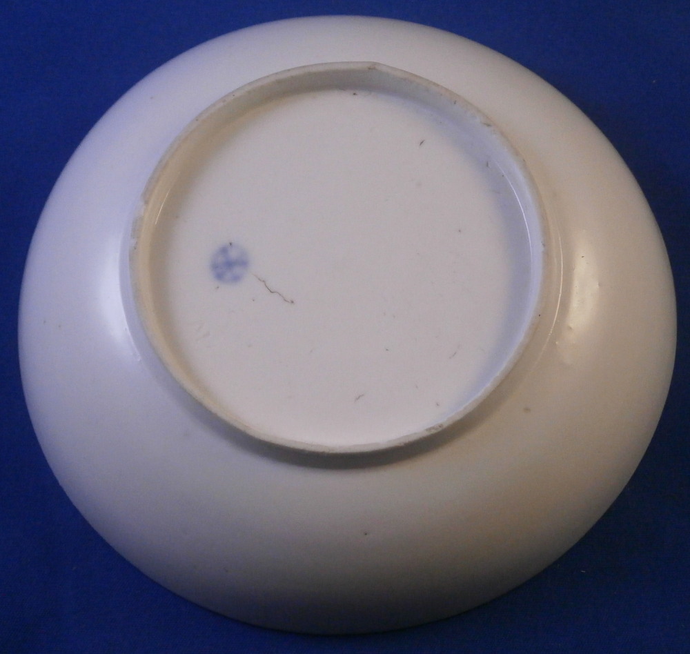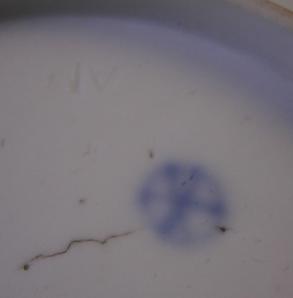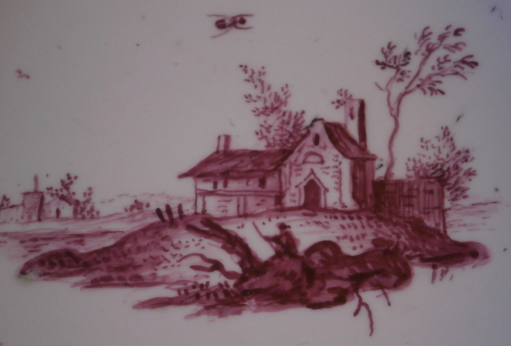 This is a nice saucer made by Hoechst in the 18th century. It is hand painted with a large puce scene in the center including some buildings in a landscape surrounding as well as some bugs and a flower filling in the rest of the space. Brown trim to the edge. The saucer is in great condition with just two small nibbles along the foot ring but it displays perfectly. The piece is marked underneath with a six spoke wheel mark in under glaze blue as well as a impressed letters as shown. The saucer is 1.25 inches tall and 4.875 inches in diameter. Please email me for more information or other pictures.