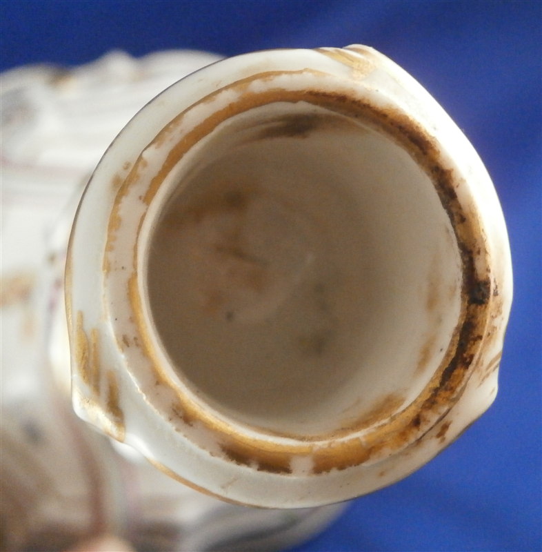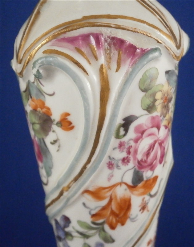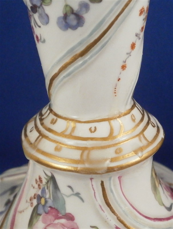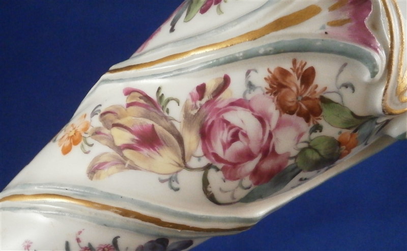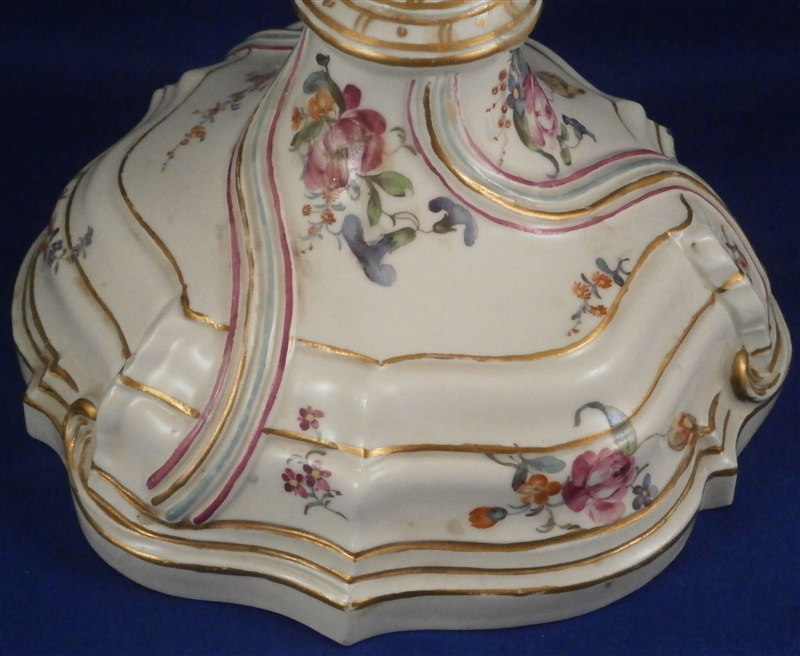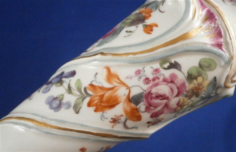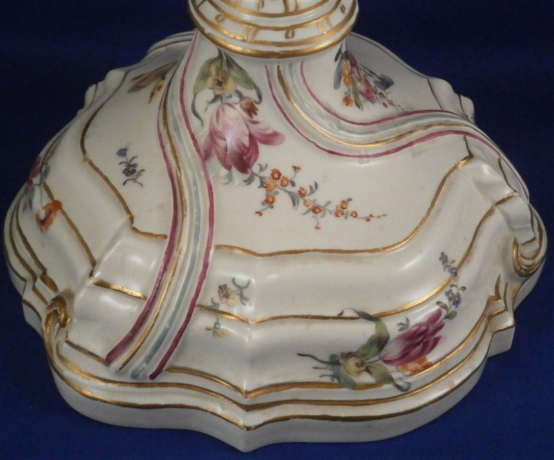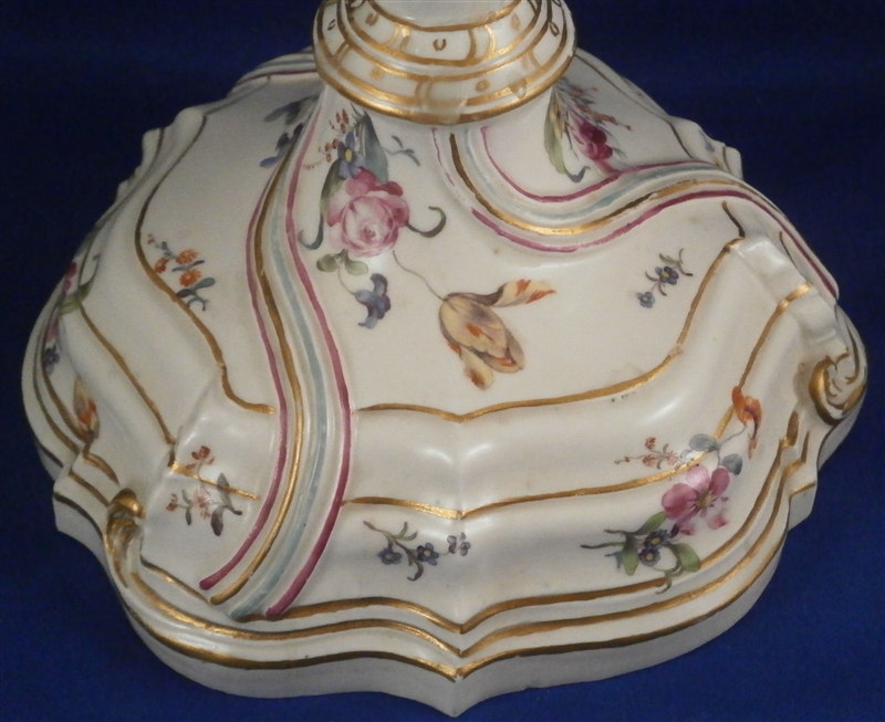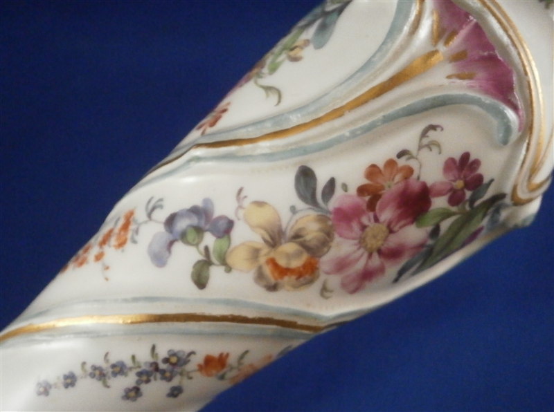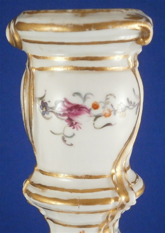 This is a superb and rather rare candle holder made by Hoechst during their early years in the 18th century around 1760. The candlestick has a superb shape and size to it and is hand painted with lots of flowers as well as gold trim and a puce and aqua trim design. I have another matching one that was sold as its mate but the flowers on this one here are larger and fill the white areas out more and the trim colors are in a different order to it so I think it is a match be it a very very good one rather than a true pair. The piece is in amazing condition considering its nature and age with very minimal wear to the gilding and some staining and firing marks to the top edge and inside as well as one tiny glaze flake to the bottom edge and a missed glazed area on the bottom edge. The candleholder is about 9.5 inches tall with a bottom diameter of about 5.75 inches and a top inner diameter of just over an inch. The stick is marked underneath with the early red wheel mark as well as the incised letter HI. Please email me for more information or other pictures.