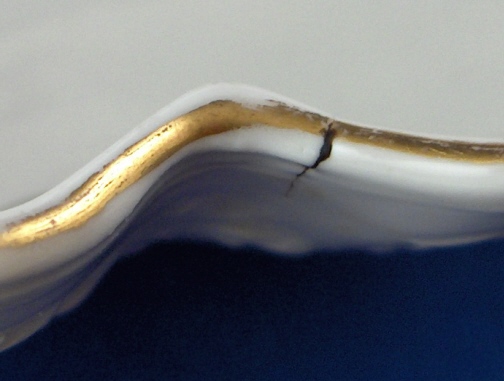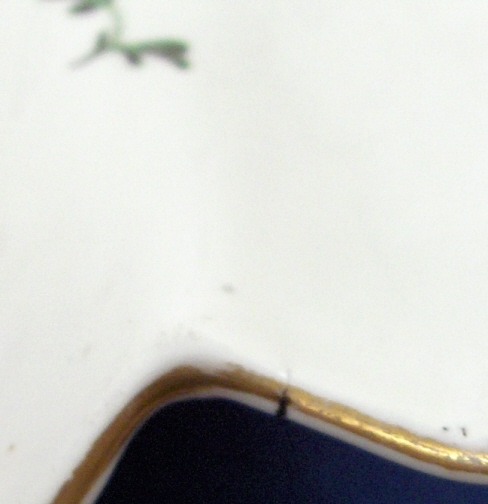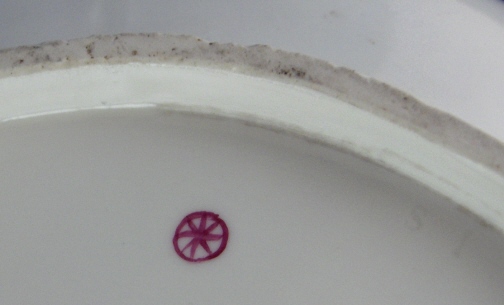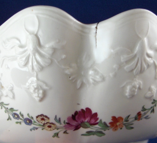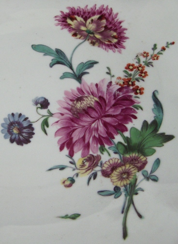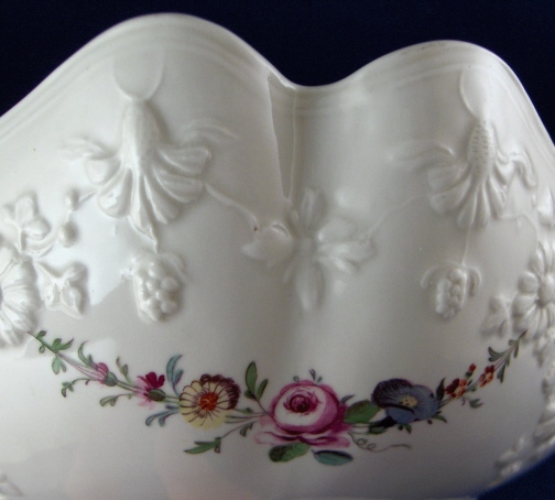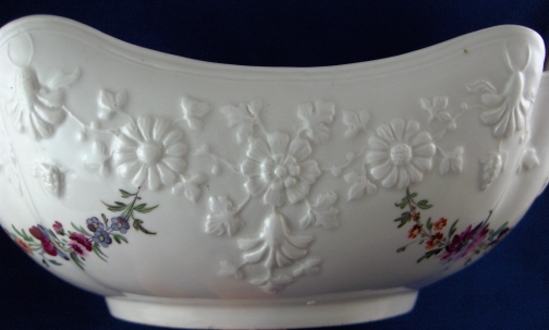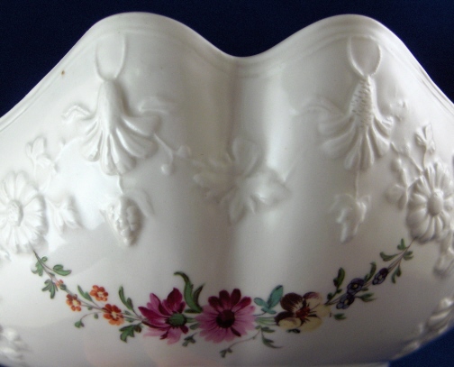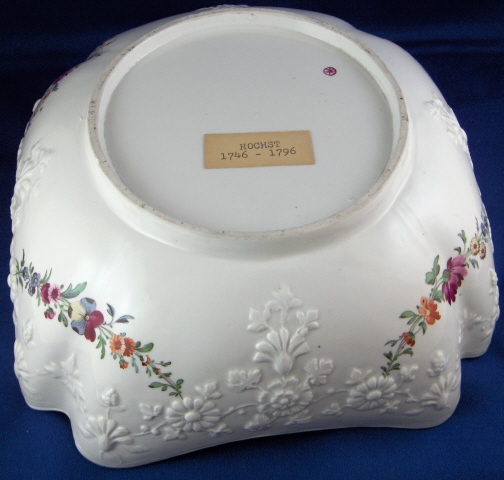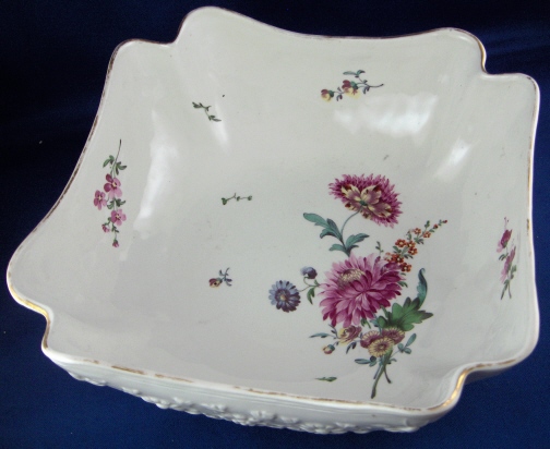 This is a rare serving dish made by Hoechst in about 1760. It is handpainted with a large floral arrangement in the center inside as well as lots of smaller flowers, a gold trim to the top edge, four floral garlands to the outside corners as well as lots of relief flower decoration on the outside which is quite rare on Hoechst pieces. The relief design is very detailed and really very nice. The bowl is in great condition with the gold trim being worn and a firing crack to one corner that one can see from the outside and top but only a tiny bit on the inside top which is glazed over so it still displays perfectly from the other side! It is marked underneath with the overglaze red wheel mark as well as an incised I and S. The piece is 8 inches square. Please email me for more information or other pictures.