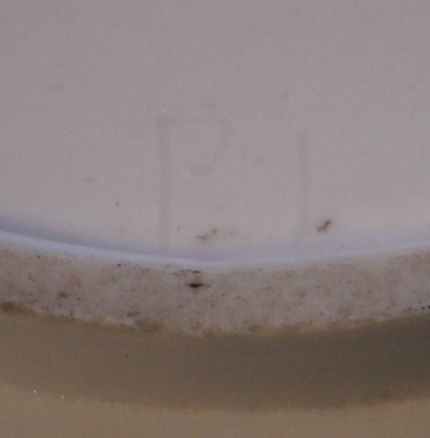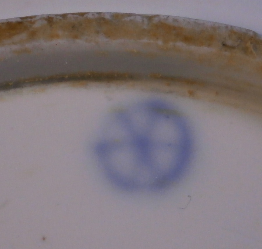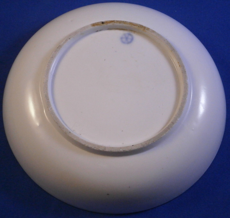 This is a great saucer made by Hoechst in the 18th century. It is hand painted with a superb polychrome scene to the center as well as a ladybug type critter and a little leaf with a brown trim ot the edge. The piece is in great condition with just a small paint flake near the rock on the bottom. A common occurance on these early wares! The saucer is marked with the blue wheel mark as well as some incised marks one finds on their pieces as shown. The saucer is 1 inch tall and 5 inches in diameter. A really nice example of their work! Please email me for more information or other pictures.