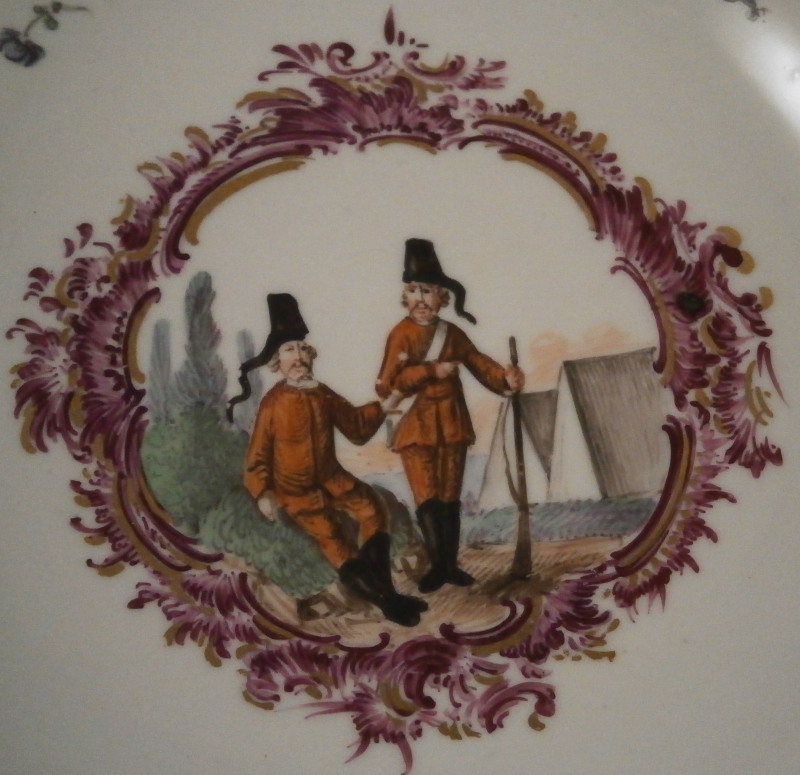 This is a superb saucer made by a Hoechst in the mid 18th century during their early years. The piece is hand painted with a very nice scene in the center of two soldiers with their tents behind them in a landscape surrounding. Fancy puce and gold trim all around the scene and four small flowers. Gold trim to the edge. The saucer is in great condition with some wear to mainly the gold trim but it displays superbly. A few firing flaws that do not distract from this nice early piece! It is marked with painted red wheel mark as well as an incised Ki as shown. The saucer is 1.25 inches tall and 5.125 inches in diameter. Please email me for more information or other pictures.