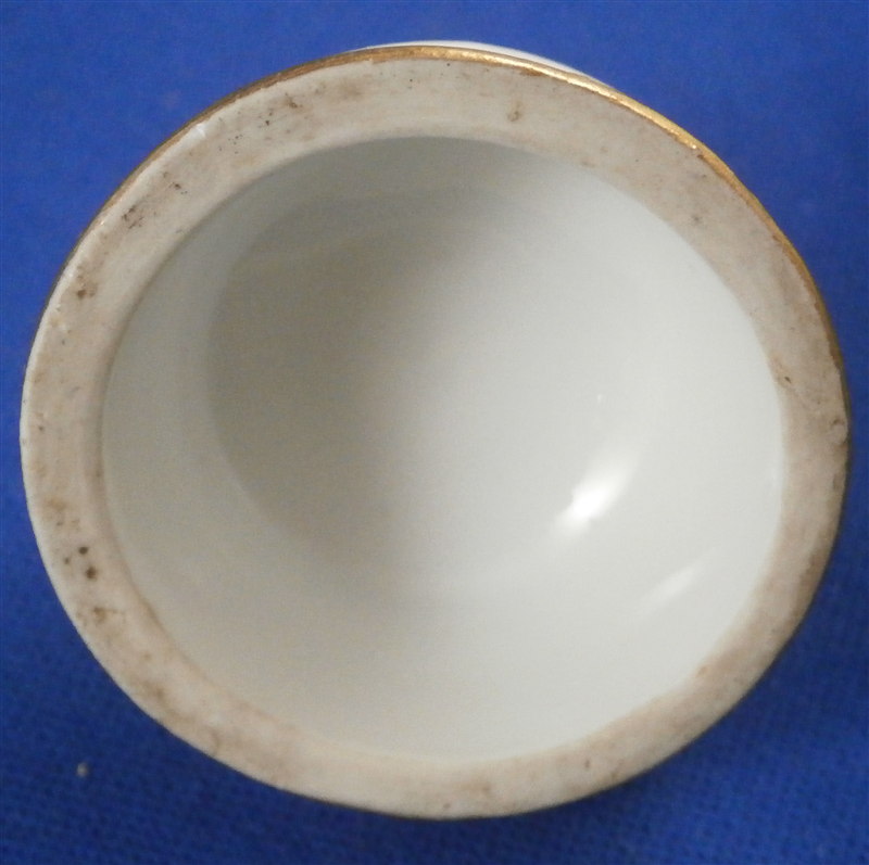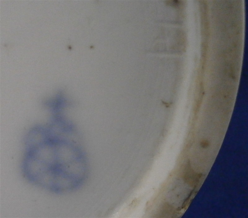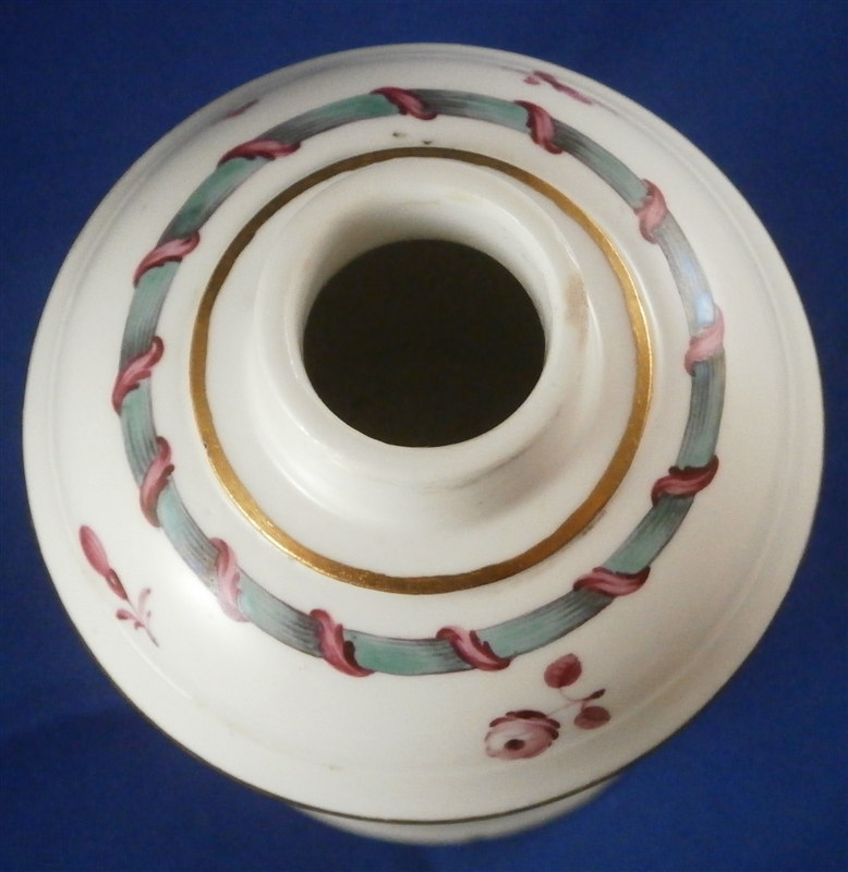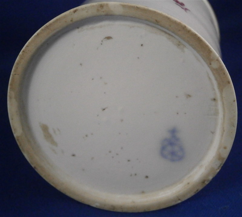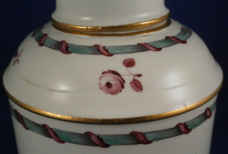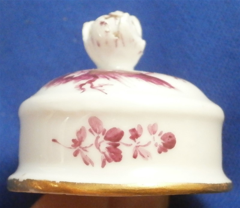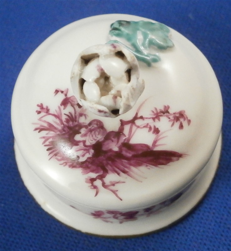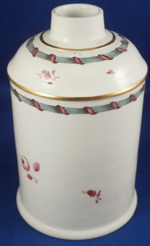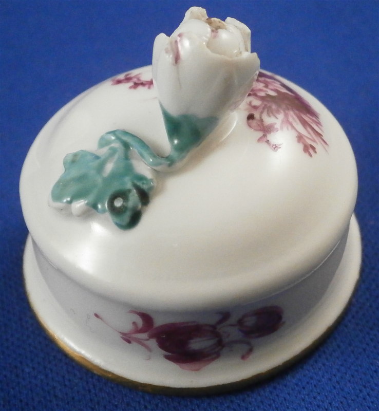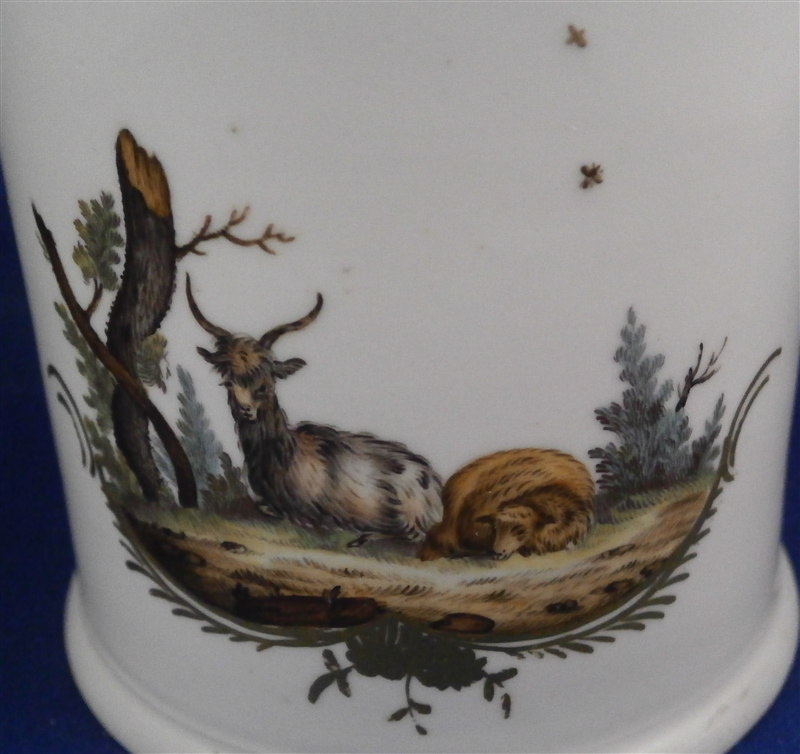 This is a great teacaddy made by Hoechst in the 18th century. The main body is painted with a superb animal scene to the front including a goat and a sheep in a landscape surrounding with a gold scroll trim underneath it. Some puce flowers scattered throughout the rest of the piece with a nice puce and aqua trim to the top of the straight part and again on the top part as well as some gold trim. The lid has some puce flowers, a little puce scene and a nice flower finial. The tea jar is in great condition with the flower finial having some chips to the petals and there are two small chips in the same area on the bottom edge as shown. The caddy is marked underneath with an underglaze blue wheel under a crown mark as well as some incised letters as shown. The tea caddy is 5.25 inches tall and 3 inches in diameter. Please email me for more information or other pictures.